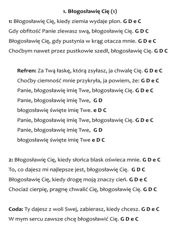1. Błogosławię Cię (1) 1: Błogosławię Cię, kiedy ziemia wydaje plon. G D e C Gdy obfitość Panie zlewasz swą, błogosławię Cię. G D C Błogosławię Cię, gdy pustynia w krąg otacza mnie. G D e C Choćbym nawet przez pustkowie szedł, błogosławię Cię. G D C Refren: Za Twą łaskę, którą zsyłasz, ja chwalę Cię. G D e C Choćby ciemność mnie przykryła, ja powiem, że: G D e C Panie, błogosławię imię Twe, błogosławię Cię. G D e C Panie, błogosławię imię Twe, G D błogosławię święte imię Twe. e D C Panie, błogosławię imię Twe, błogosławię Cię. G D e C Panie, błogosławię imię Twe, G D błogosławię święte imię Twe e D C 2: Błogosławię Cię, kiedy słońca blask oświeca mnie. G D e C To, co dajesz mi najlepsze jest, błogosławię Cię. G D C Błogosławię Cię, kiedy drogę moją znaczy cień. G D e C Chociaż cierpię, pragnę chwalić Cię, błogosławię Cię. G D C Coda: Ty dajesz z woli Swej, zabierasz, kiedy chcesz. G D e C W mym sercu zawsze chcę błogosławić Cię. G D e C 2. Gdzieś w gwiazdy 1: Gdzieś w gwiazdy podnoszę swój wzrok, by dostrzec Cię tam. a C Nadzieją oddycham Twą, pokarm w Słowie mam. G a E Do Ciebie przychodzę co noc, by ból zrzucić swój. a C Co piersi zatyka wciąż i siłę mą niszczy, i niszczy mój trud. G E 2: Ty dałeś nam Syna krew, przez Niego do Ciebie ślę, a C modlitwę skruszonych warg i przyjmij i pomóż, i siłę Swą daj. G E Ty dałeś nam Syna krew, przez Niego do Ciebie ślę, a C modlitwę skruszonych warg i przyjmij i pomóż nam. G a E 3: Ty światło stworzyłeś i noc, by czas zmierzyć nam, a C by oddech po pracy wziąć, nowy złapać wiatr. G a E By żagle powciągać na maszt, by popłynąć w dal. a C By trochę przybliżyć się, do portu dopłynąć i czekać na dzień. G E 4: Ta pieśń niech do Ciebie mknie, a w przestworzach niech wielbi Cię C I tylko odpowiedź daj, czy warto żeglować i płynąć pod wiatr. G E Czy lepiej mu poddać się, dryfować z innymi gdzieś. a C Banderę opuścić Twą, sumienie rzucić w kąt. G a E 5: Do świateł, do tysiąca barw, do dobra i chwał, a C ośmielam podnosić wzrok, pomoc Twoją wziąć. G a E Ach, pomóż przed siebie wciąż iść i patrzeć na krzyż. a C Niech z serca odejdzie cień i przywróć nam, Panie, dzień. G E a 3. Schowaj mnie 1: Schowaj mnie pod skrzydła Swe. C G a F d G Ukryj mnie w silnej dłoni Swej. C G a F G Refren: Kiedy fale mórz chcą porwać mnie, F G C z Tobą wzniosę się, poniesiesz mnie. F G a Panie, Królem Tyś spienionych wód. F G C Ja ufam Ci – Ty jesteś Bóg. F G C 2: Odpocznę dziś w ramionach Twych. C G a F d G Dusza ma w pokoju będzie trwać. C G a F G Zakończenie: Ja ufam Ci – Ty jesteś Bóg. F G a Ja ufam Ci – Ty jesteś Bóg. F G C 4. Pan łaskę słabym dał 1: Pan łaskę słabym dał i pokornym dom w mieście Swym. C a C G On mrok zamienia w dzień, uświęceniem jest martwych ciał. C a C G Refren: Bo Pan wybawieniem jest, F G C wodą pośród skał, a F światłem w ciemną noc. G F G Bo Pan wybawieniem jest, F G C Sam wykupił nas a F i pokonał śmierć. G F G 2: Bóg Ojcem naszym jest, Syna Swego dał, stworzył świat. C a C G Wiatr wieje dokąd chce, Jezus łączy nas w ciało Swe. C a C G 5. Nasze biodra przepasane 1: Nasze biodra przepasane, w torbie kromka chleba tkwi, d F więcej nie bierz nic. C d Poniesiemy miłość, pokój, radość, którą daje Bóg. d F Przyjacielem będzie wróg. C d Refren: /:Nasze życie to wędrówka F do niebieskich Ojca bram, C gdzie na tronie czeka Pan. g d On prowadzi nas w obłoku, w słupie ognia nocą lśni. F C Czy otworzy szczęścia drzwi :/ g d 2: Wędrujemy poprzez burze, piasek w oczy szczypie nas, d F słońce pali twarz. C d Przystajemy przy oazach, by zaczerpnąć Bożych sił, d F by móc dalej iść. C d 3: Gdy dojdziemy już do Pana, pochylimy naszą skroń, d F wyciągniemy twardą dłoń. C d Bóg ci rzeknie: O, mój synu, ty umiałeś dobrze żyć, d F w chwale Mojej bądź. C d 6. Ty dałeś życie mi Panie 1: Ty dałeś życie mi, Panie, okazałeś Swą łaskę, D A G bym teraz wielbił Cię. D A Wiem, że to tylko Twa miłość, tylko ona ma siłę, D A G pokonać wszelkie zło. D A Refren: Dlatego teraz wywyższam Ciebie, Panie. D A G D Dlatego teraz uwielbiam Twoją miłość. D A G A Ty jesteś Królem i jesteś moim Panem. D A G D Bo wiem, że żyjesz i zmartwychwstałeś, Panie. D A G A 2: Wiem, niczym jestem bez Ciebie, D A bo Ty jesteś tam w niebie, G a ja na ziemi tu. D A Lecz kiedyś przyjdzie ta chwila, D A kiedyś przyjdzie ten dzień, G gdy razem będziemy już. D A 7. Gdy muzyki dźwięk 1: Gdy muzyki dźwięk gdzieś odchodzi w dal, D A e jestem znowu tu. e A Tęsknię za tym, by coś cennego dać, D A e coś co dotknie Cię. e A Refren: Chcę przynieść więcej niż pieśń, e h A kilka nutek i słów. A e To nie jest to czego chcesz. h A Ty patrzysz głębiej niż to, e h A skąd pochodzi ten dźwięk. A e Zaglądasz do naszych serc. D A Powracam znowu do głębi chwały. D A Wszystko, co mam dla Ciebie jest, Jezu mój. e G A D Za winy moje przepraszam, Panie. D A Wszystko, co mam dla Ciebie jest, Jezu mój. e G A D 2: Nie wyrazi nikt, jak cenny jesteś Ty, D A e całej ziemi Król. e A Nie ma we mnie nic, wszystko dajesz Ty, D A e każdy oddech mój. e A 8. Nadzieję odnalazłem w Nim 1: Nadzieję odnalazłem w Nim, G D A On moją siłą, światłem mym. D G e D On fundamentem, twierdzą tą, G D A co zniesie najstraszniejszy grom. D G e D Miłości szczyt, pokoju Bóg uciszy strach, nasyci głód. G D A D G h A On Pocieszyciel, życia sens, w Jego miłości schronię się G D G A D G e D 2: W Chrystusie Bóg objawił się, G D A w bezbronnym dziecku, w Betlejem. D G e D Na ziemię zszedł, by zbawić nas, G D A by przebaczenia nastał czas. D G e D Na krzyżu zmarł za każdy grzech, G D A by uspokoić Boży gniew. D G h A Uwolnił mnie z ciężarów, win, G D G A umar