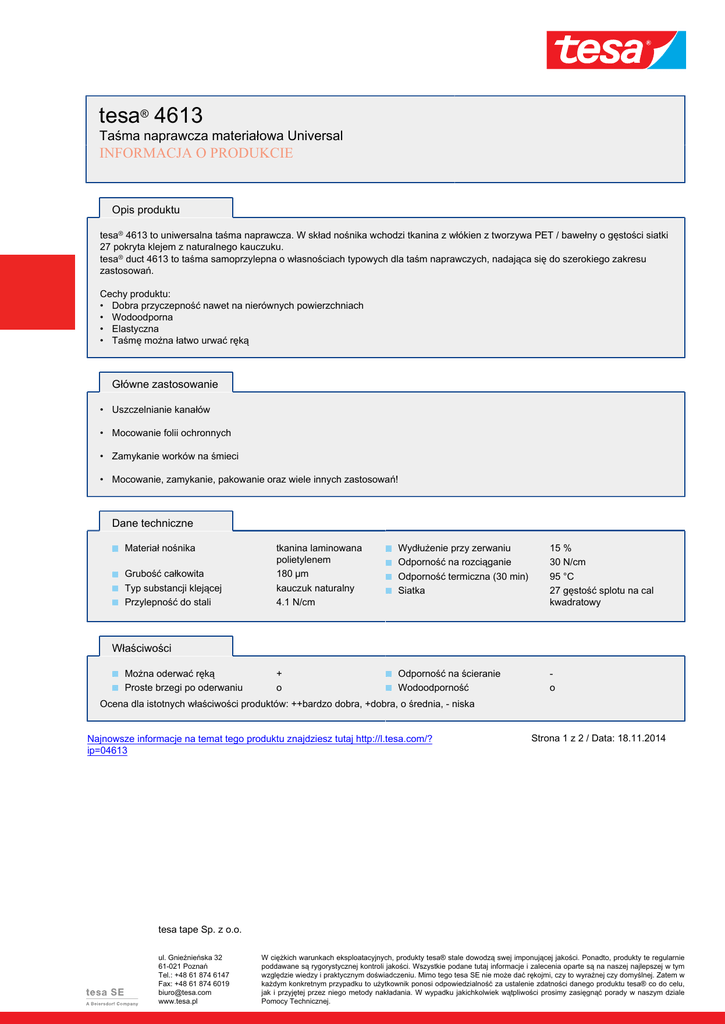 tesa® 4613 Taśma naprawcza materiałowa Universal INFORMACJA O PRODUKCIE Opis produktu tesa® 4613 to uniwersalna taśma naprawcza. W skład nośnika wchodzi tkanina z włókien z tworzywa PET / bawełny o gęstości siatki 27 pokryta klejem z naturalnego kauczuku. tesa® duct 4613 to taśma samoprzylepna o własnościach typowych dla taśm naprawczych, nadająca się do szerokiego zakresu zastosowań. Cechy produktu: • Dobra przyczepność nawet na nierównych powierzchniach • Wodoodporna • Elastyczna • Taśmę można łatwo urwać ręką Główne zastosowanie • Uszczelnianie kanałów • Mocowanie folii ochronnych • Zamykanie worków na śmieci • Mocowanie, zamykanie, pakowanie oraz wiele innych zastosowań! Dane techniczne Materiał nośnika Grubość całkowita Typ substancji klejącej Przylepność do stali tkanina laminowana polietylenem 180 µm kauczuk naturalny 4.1 N/cm Wydłużenie przy zerwaniu Odporność na rozciąganie Odporność termiczna (30 min) Siatka 15 % 30 N/cm 95 °C 27 gęstość splotu na cal kwadratowy + o Odporność na ścieranie Wodoodporność o Właściwości Można oderwać ręką Proste brzegi po oderwaniu Ocena dla istotnych właściwości produktów: ++bardzo dobra, +dobra, o średnia, - niska Najnowsze informacje na temat tego produktu znajdziesz tutaj http://l.tesa.com/? ip=04613 Strona 1 z 2 / Data: 18.11.2014 tesa tape Sp. z o.o. ul. Gnieźnieńska 32 61-021 Poznań Tel.: +48 61 874 6147 Fax: +48 61 874 6019 [email protected] www.tesa.pl W ciężkich warunkach eksploatacyjnych, produkty tesa® stale dowodzą swej imponującej jakości. Ponadto, produkty te regularnie poddawane są rygorystycznej kontroli jakości. Wszystkie podane tutaj informacje i zalecenia oparte są na naszej najlepszej w tym względzie wiedzy i praktycznym doświadczeniu. Mimo tego tesa SE nie może dać rękojmi, czy to wyraźnej czy domyślnej. Zatem w każdym konkretnym przypadku to użytkownik ponosi odpowiedzialność za ustalenie zdatności danego produktu tesa® co do celu, jak i przyjętej przez niego metody nakładania. W wypadku jakichkolwiek wątpliwości prosimy zasięgnąć porady w naszym dziale Pomocy Technicznej. Dodatkowe informacje • Dla majsterkowiczów, do napraw, mocowania przedmiotów, łączenia przewodów we wiązki, wzmacniania konstrukcji, oznaczania i wielu innych zastosowań • Umożliwia szybkie i łatwe wykonywanie nieskomplikowanych napraw • Bardzo dobra przyczepność do wszystkich rodzajów powierzchni • Wysoka odporność na czynniki atmosferyczne, do stosowania zarówno wewnątrz jak i na zewnątrz pomieszczeń • Nie zawiera rozpuszczalników Najnowsze informacje na temat tego produktu znajdziesz tutaj http://l.tesa.com/? ip=04613 Strona 2 z 2 / Data: 18.11.2014 tesa tape Sp. z o.o. ul. Gnieźnieńska 32 61-021 Poznań Tel.: +48 61 874 6147 Fax: +48 61 874 6019 [email protected] www.tesa.pl W ciężkich warunkach eksploatacyjnych, produkty tesa® stale dowodzą swej imponującej jakości. Ponadto, produkty te regularnie poddawane są rygorystycznej kontroli jakości. Wszystkie podane tutaj informacje i zalecenia oparte są na naszej najlepszej w tym względzie wiedzy i praktycznym doświadczeniu. Mimo tego tesa SE nie może dać rękojmi, czy to wyraźnej czy domyślnej. Zatem w każdym konkretnym przypadku to użytkownik ponosi odpowiedzialność za ustalenie zdatności danego produktu tesa® co do celu, jak i przyjętej przez niego metody nakładania. W wypadku jakichkolwiek wątpliwości prosimy zasięgnąć porady w naszym dziale Pomocy Technicznej.