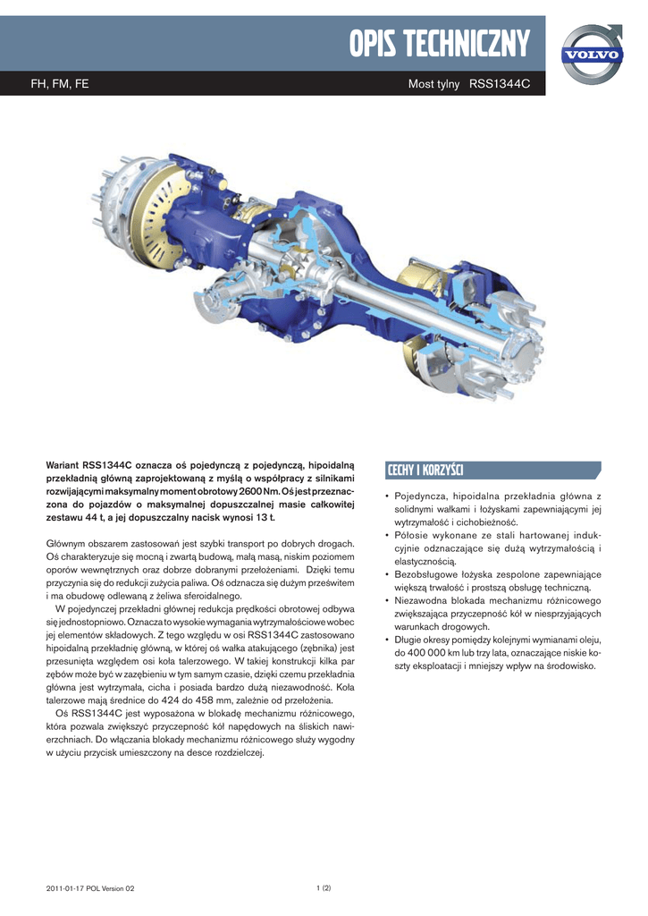 Opis techniczny Most tylny RSS1344C FH, FM, FE Wariant RSS1344C oznacza oś pojedynczą z pojedynczą, hipoidalną przekładnią główną zaprojektowaną z myślą o współpracy z silnikami rozwijającymi maksymalny moment obrotowy 2600 Nm. Oś jest przeznaczona do pojazdów o maksymalnej dopuszczalnej masie całkowitej zestawu 44 t, a jej dopuszczalny nacisk wynosi 13 t. Głównym obszarem zastosowań jest szybki transport po dobrych drogach. Oś charakteryzuje się mocną i zwartą budową, małą masą, niskim poziomem oporów wewnętrznych oraz dobrze dobranymi przełożeniami. Dzięki temu przyczynia się do redukcji zużycia paliwa. Oś odznacza się dużym prześwitem i ma obudowę odlewaną z żeliwa sferoidalnego. W pojedynczej przekładni głównej redukcja prędkości obrotowej odbywa się jednostopniowo. Oznacza to wysokie wymagania wytrzymałościowe wobec jej elementów składowych. Z tego względu w osi RSS1344C zastosowano hipoidalną przekładnię główną, w której oś wałka atakującego (zębnika) jest przesunięta względem osi koła talerzowego. W takiej konstrukcji kilka par zębów może być w zazębieniu w tym samym czasie, dzięki czemu przekładnia główna jest wytrzymała, cicha i posiada bardzo dużą niezawodność. Koła talerzowe mają średnice do 424 do 458 mm, zależnie od przełożenia. Oś RSS1344C jest wyposażona w blokadę mechanizmu różnicowego, która pozwala zwiększyć przyczepność kół napędowych na śliskich nawierzchniach. Do włączania blokady mechanizmu różnicowego służy wygodny w użyciu przycisk umieszczony na desce rozdzielczej. 2011-01-17 POL Version 02 1 (2) CECHY I KORZYŚCI • Pojedyncza, hipoidalna przekładnia główna z solidnymi wałkami i łożyskami zapewniającymi jej wytrzymałość i cichobieżność. • Półosie wykonane ze stali hartowanej indukcyjnie odznaczające się dużą wytrzymałością i elastycznością. • Bezobsługowe łożyska zespolone zapewniające większą trwałość i prostszą obsługę techniczną. • Niezawodna blokada mechanizmu różnicowego zwiększająca przyczepność kół w niesprzyjających warunkach drogowych. • Długie okresy pomiędzy kolejnymi wymianami oleju, do 400 000 km lub trzy lata, oznaczające niskie koszty eksploatacji i mniejszy wpływ na środowisko. Opis techniczny FH, FM, FE Most tylny RSS1344C Wytrzymała hipoidalna przekładnia główna o najwyższej niezawodności Niezawodna blokada mechanizmu różnicowego zwiększa przyczepność kół Oś RSS1344C jest wyposażona w pojedynczą, hipoidalną przekładnię główną, w której całkowita redukcja prędkości obrotowej odbywa się pomiędzy wałkiem atakującym i a kołem talerzowym. Zarówno wałek atakujący, jak i koło talerzowe są wystawione na działanie dużych sił, a więc muszą być szczególnie wytrzymałe. Obydwa elementy są wykonane ze specjalnej stali utwardzanej powierzchniowo w procesie obróbki cieplno-chemicznej, której cechą charakterystyczną jest wyjątkowo twarda i trwała powierzchnia, a jednocześnie elastyczny, pochłaniający drgania rdzeń. Wałek atakujący podparto dwoma łożyskami stożkowymi w układzie rozbieżnym, umieszczonymi blisko siebie po zewnętrznej stronie wałka. Zadaniem tych łożysk jest przejmowanie sił wzdłużnych oraz części sił działających na wałek atakujący w kierunku promieniowym. W przejmowaniu sił promieniowych pomaga dodatkowe łożysko walcowe znajdujące po wewnętrznej stronie wałka atakującego. Obudowa mechanizmu różnicowego wraz z kołem talerzowym jest osadzona w obudowie przekładni głównej za pomocą dwóch łożyskach stożkowych, znajdujących się po każdej stronie przekładni. Połówki obudowy koła talerzowego i mechanizmu różnicowego są połączone metodą spawania laserowego, pozwalającą na uzyskanie dużej sztywności całej konstrukcji. Blokada mechanizmu zwiększa przyczepność kół na śliskich nawierzchniach. Dzięki solidnej budowie jest zdolna wytrzymać największe obciążenia i naprężenia. Mechanizm blokujący składa się ze sprzęgła kłowego wykonanego z hartowanej stali. Sprzęgło osadzone jest wielowypustowo na jednej z półosi i pozwala na jej zblokowanie z obudową mechanizmu różnicowego. Do włączania blokady mechanizmu różnicowego służy wygodny w użyciu przycisk umieszczony na desce rozdzielczej. Naciśnięcie przycisku aktywuje zawór elektromagnetyczny, który otwiera dopływ sprężonego powierza do siłownika włączającego znajdującego się wewnątrz przekładni głównej. Włączenie blokady mechanizmu różnicowego jest sygnalizowane lampką kontrolną w zestawie wskaźników. Lampka kontrolna sygnalizuje rzeczywiste włączenie blokady, ponieważ jej czujnik jest aktywowany mechanicznie przez poruszające się ramię włączające. Łożyska zespolone zapewniają większą trwałość i prostszą obsługę techniczną Oś jest wyposażona w bezobsługowe łożyska zespolone. Węzeł łożyskowy składa się z dwóch łożysk stożkowych fabrycznie nasmarowanych i trwale uszczelnionych. Piastę koła można demontować i zakładać jako jeden zespół razem z łożyskami, co znacznie upraszcza czynności obsługowe. Nie ma potrzeby regulacji luzu łożyskowego.Il gioco dei cuscinetti non richiede regolazioni. Blokada mechanizmu różnicowego włączona. DANE TECHNICZNE Typ........................................................................................................RSS1344C Typ....................................... Oś pojedyncza z hipoidalną przekładnią główną Masa z półosiami, piastami i hamulcami bębnowymi.................. ok. 731 kg Masa z półosiami, piastami i hamulcami tarczowymi...................ok. 663 kg Masa z półosiami, piastami i olejem................................................ ok. 555 kg Średnica koła talerzowego...........................................................424-458 mm Średnica półosi..............
