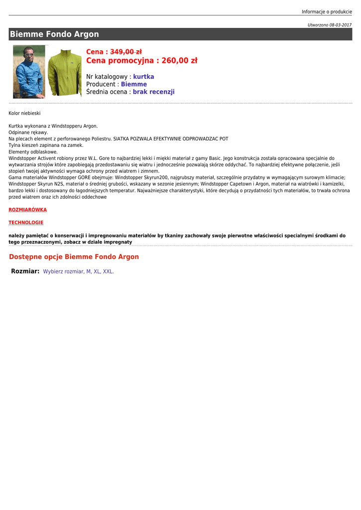 Informacje o produkcie Utworzono 08-03-2017 Biemme Fondo Argon Cena : 349,00 zł Cena promocyjna : 260,00 zł Nr katalogowy : kurtka Producent : Biemme Średnia ocena : brak recenzji Kolor niebieski Kurtka wykonana z Windstopperu Argon. Odpinane rękawy. Na plecach element z perforowanego Poliestru. SIATKA POZWALA EFEKTYWNIE ODPROWADZAC POT Tylna kieszeń zapinana na zamek. Elementy odblaskowe. Windstopper Activent robiony przez W.L. Gore to najbardziej lekki i miękki materiał z gamy Basic. Jego konstrukcja została opracowana specjalnie do wytwarzania strojów które zapobiegają przedostawaniu się wiatru i jednocześnie pozwalają skórze oddychać. To najbardziej efektywne połączenie, jeśli stopień twojej aktywności wymaga ochrony przed wiatrem i zimnem. Gama materiałów Windstopper GORE obejmuje: Windstopper Skyrun200, najgrubszy materiał, szczególnie przydatny w wymagającym surowym klimacie; Windstopper Skyrun N2S, materiał o średniej grubości, wskazany w sezonie jesiennym; Windstopper Capetown i Argon, materiał na wiatrówki i kamizelki, bardzo lekki i dostosowany do łagodniejszych temperatur. Najważniejsze charakterystyki, które decydują o przydatności tych materiałów, to trwała ochrona przed wiatrem oraz ich zdolności oddechowe ROZMIARÓWKA TECHNOLOGIE należy pamiętać o konserwacji i impregnowaniu materiałów by tkaniny zachowały swoje pierwotne właściwości specialnymi środkami do tego przeznaczonymi, zobacz w dziale impregnaty Dostępne opcje Biemme Fondo Argon Rozmiar: Wybierz rozmiar, M, XL, XXL.