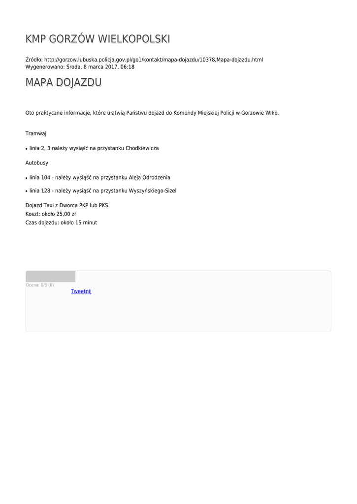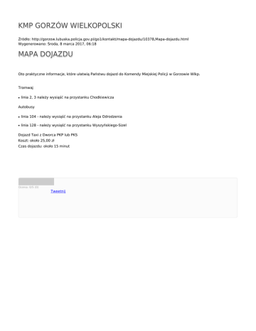 KMP GORZÓW WIELKOPOLSKI Źródło: http://gorzow.lubuska.policja.gov.pl/go1/kontakt/mapa-dojazdu/10378,Mapa-dojazdu.html Wygenerowano: Środa, 8 marca 2017, 06:18 MAPA DOJAZDU Oto praktyczne informacje, które ułatwią Państwu dojazd do Komendy Miejskiej Policji w Gorzowie Wlkp. Tramwaj ● linia 2, 3 należy wysiąść na przystanku Chodkiewicza Autobusy ● linia 104 - należy wysiąść na przystanku Aleja Odrodzenia ● linia 128 - należy wysiąść na przystanku Wyszyńskiego-Sizel Dojazd Taxi z Dworca PKP lub PKS Koszt: około 25,00 zł Czas dojazdu: około 15 minut Ocena: 0/5 (0) Tweetnij