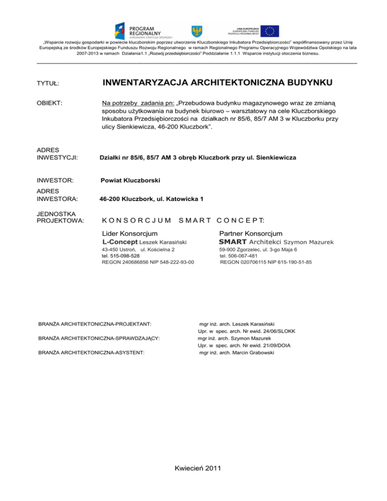 „Wsparcie rozwoju gospodarki w powiecie kluczborskim poprzez utworzenie Kluczborskiego Inkubatora Przedsiębiorczości” współfinansowany przez Unię Europejską ze środków Europejskiego Funduszu Rozwoju Regionalnego w ramach Regionalnego Programu Operacyjnego Województwa Opolskiego na lata 2007-2013 w ramach Działania1.1 „Rozwój przedsiębiorczości” Poddziałanie 1.1.1 Wsparcie instytucji otoczenia biznesu. __________________________________________________________________________________________ TYTUŁ: INWENTARYZACJA ARCHITEKTONICZNA BUDYNKU OBIEKT: Na potrzeby zadania pn: „Przebudowa budynku magazynowego wraz ze zmianą sposobu użytkowania na budynek biurowo – warsztatowy na cele Kluczborskiego Inkubatora Przedsiębiorczości na działkach nr 85/6, 85/7 AM 3 w Kluczborku przy ulicy Sienkiewicza, 46-200 Kluczbork”. ADRES INWESTYCJI: Działki nr 85/6, 85/7 AM 3 obręb Kluczbork przy ul. Sienkiewicza INWESTOR: Powiat Kluczborski ADRES INWESTORA: 46-200 Kluczbork, ul. Katowicka 1 JEDNOSTKA PROJEKTOWA: KONSORCJUM S M A R T C O N C E P T: Lider Konsorcjum L-Concept Leszek Karasiński Partner Konsorcjum SMART Architekci Szymon Mazurek 43-450 Ustroń, ul. Kościelna 2 tel. 515-098-528 REGON 240686856 NIP 548-222-93-00 59-900 Zgorzelec, ul. 3-go Maja 6 tel. 506-067-481 REGON 020706115 NIP 615-190-51-85 BRANŻA ARCHITEKTONICZNA-PROJEKTANT: BRANŻA ARCHITEKTONICZNA-SPRAWDZAJĄCY: BRANŻA ARCHITEKTONICZNA-ASYSTENT: mgr inż. arch. Leszek Karasiński Upr. w spec. arch. Nr ewid. 24/06/SLOKK mgr inż. arch. Szymon Mazurek Upr. w spec. arch. Nr ewid. 21/09/DOIA mgr inż. arch. Marcin Grabowski Kwiecień 2011 „Przebudowa budynku magazynowego wraz ze zmianą sposobu użytkowania na budynek – warsztatowy na cele Kluczborskiego Inkubatora Przedsiębiorczości na działkach nr 85/6, 85/7 AM 3 w Kluczborku przy ulicy Sienkiewicza, 46-200 Kluczbork”. ____________________________________________________________________________________________________________________________ INWENTARYZACJA ARCHITEKTONICZNA BUDYNKU SPIS TREŚCI OPIS TECHNICZNY OPIS TECHNICZNY – INWENTARYZACJA ARCHITEKTONICZNA BUDYNKU (str.3) CZĘŚĆ RYSUNKOWA: IN/1 INWENTARYZACJA - RZUT PIĘTRA IN/2 INWENTARYZACJA - PRZEKRÓJ A-A IN/3 INWENTARYZACJA - ELEWACJE I IN/4 INWENTARYZACJA - ELEWACJA II IN/5 Strona 2 INWENTARYZACJA - RZUT PARTERU ______________________________________________________________________________________________________________________________________ L-Concept Leszek Karasiński SMART Architekci Szymon Mazurek 43-450 Ustroń, ul. Kościelna 2 tel. 515-098-528 59-900 Zgorzelec, ul. 3-go Maja 6 tel. 506-067-481 REGON 240686856 NIP 548-222-93-00 REGON 020706115 NIP 615-190-51-85 „Przebudowa budynku magazynowego wraz ze zmianą sposobu użytkowania na budynek – warsztatowy na cele Kluczborskiego Inkubatora Przedsiębiorczości na działkach nr 85/6, 85/7 AM 3 w Kluczborku przy ulicy Sienkiewicza, 46-200 Kluczbork”. ____________________________________________________________________________________________________________________________ INWENTARYZACJA ARCHITEKTONICZNA BUDYNKU 1. INWENTARYZACJA PRZEPROWADZONA NA POTRZEBY ZADANIA PN: „Przebudowa budynku magazynowego wraz ze zmianą sposobu użytkowania na budynek biurowo – warsztatowy na cele Kluczborskiego Inkubatora Przedsiębiorczości na działkach nr 85/6, 85/7 AM 3 w Kluczborku przy ulicy Sienkiewicza, 46-200 Kluczbork”. 2. OPIS TECHNICZNY - inwentaryzacja architektoniczna budynku: Na działkach nr 85/6, 85/7 o planie zbliżonym do prostokąta znajduje się budynek biurowousługowy wraz z częścią magazynową. Część biurowo-usługowa posiada 2 kondygnacje nadziemne i wykorzystywana jest na cele Powiatowego Urzędu Pracy w Kluczborku. Część magazynowa posiada 1 kondygnację i w chwili obecnej nie jest wykorzystywana. W skład części magazynowej wchodzi również 2 kondygnacyjna część z pomieszczeniami socjalnymi, z dostępem na piętro z jednobiegowej klatki schodowej o konstrukcji stalowej. Wzdłuż elewacji zachodniej, w północnej części całego budynku znajduje się żelbetowa rampa załadowcza. Teren inwestycji jest płaski i nie podlega ochronie konserwatorskiej. Działka inwestora posiada dostęp do drogi publicznej oraz jest uzbrojona w niezbędne sieci infrastruktury miejskiej: (wod.- kan., elektroenergetyczną, gazową, telefoniczną). W bezpośrednim sąsiedztwie znajdują się budynki biurowe, produkcyjne i magazynowe. Wjazd na teren działek znajduje się w północno-zachodniej części. Teren działek jest częściowo utwardzony nawierzchnią betonową. Od strony północnej oraz wschodniej jest trawnik istniejący. Od strony południowej oraz zachodniej, wzdłuż budynku znajdują się miejsca parkingowe dla samochodów osobowych. W południowo-zachodniej części działki znajduje się parterowy budynek gospodarczy. Teren działki jest ogrodzony z czterech stron. ______________________________________________________________________________________________________________________________________ L-Concept Leszek Karasiński SMART Architekci Szymon Mazurek 43-450 Ustroń, ul. Kościelna 2 tel. 515-098-528 59-900 Zgorzelec, ul. 3-go Maja 6 tel. 506-067-481 REGON 240686856 NIP 548-222-93-00 REGON 020706115 NIP 615-190-51-85 Strona Opracował: mgr inż. arch. Leszek Karasiński 3 Budynek istniejący stanowi żelbetowa hala prefabrykowana. Ściany budynku składają się z prefabrykowanych płyt żelbetowych na poziomie parteru oraz z muru ceglanego z otworami okiennymi na poziomie piętra I. Hala przekryta została prefabrykowanymi, żelbetowymi płytami panwiowymi bez izolacji termicznej dachu. Konstrukcja zadaszenia wspiera się na prefabrykowanych, żelbetowych wiązarach kablobetonowych rozstawionych w 4 modułach po 6 metrów każdy. Wiązary te przenoszą obciążenie z dachu poprzez murowane słupy, które są częścią ścian zewnętrznych. Środkowy wiązar dachowy zastąpiony jest murowaną