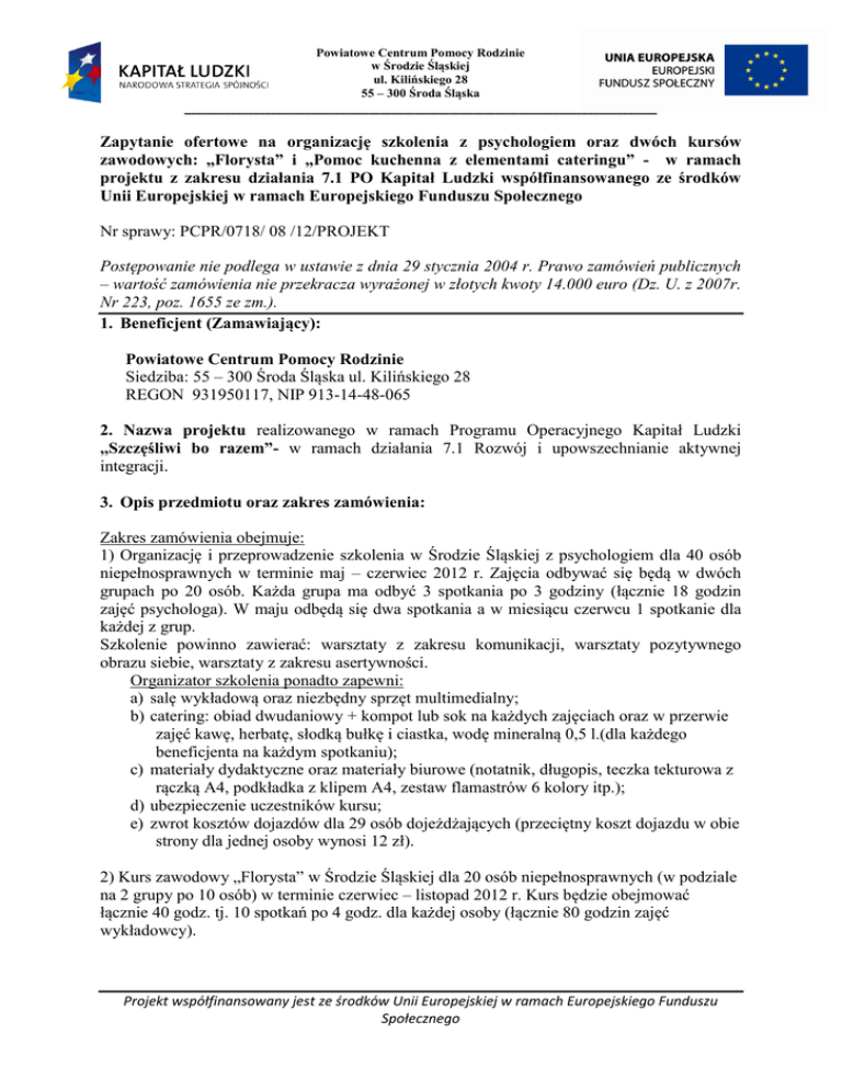 Powiatowe Centrum Pomocy Rodzinie w Środzie Śląskiej ul. Kilińskiego 28 55 – 300 Środa Śląska __________________________________________________________________________________ Zapytanie ofertowe na organizację szkolenia z psychologiem oraz dwóch kursów zawodowych: „Florysta” i „Pomoc kuchenna z elementami cateringu” - w ramach projektu z zakresu działania 7.1 PO Kapitał Ludzki współfinansowanego ze środków Unii Europejskiej w ramach Europejskiego Funduszu Społecznego Nr sprawy: PCPR/0718/ 08 /12/PROJEKT Postępowanie nie podlega w ustawie z dnia 29 stycznia 2004 r. Prawo zamówień publicznych – wartość zamówienia nie przekracza wyrażonej w złotych kwoty 14.000 euro (Dz. U. z 2007r. Nr 223, poz. 1655 ze zm.). 1. Beneficjent (Zamawiający): Powiatowe Centrum Pomocy Rodzinie Siedziba: 55 – 300 Środa Śląska ul. Kilińskiego 28 REGON 931950117, NIP 913-14-48-065 2. Nazwa projektu realizowanego w ramach Programu Operacyjnego Kapitał Ludzki ,,Szczęśliwi bo razem”- w ramach działania 7.1 Rozwój i upowszechnianie aktywnej integracji. 3. Opis przedmiotu oraz zakres zamówienia: Zakres zamówienia obejmuje: 1) Organizację i przeprowadzenie szkolenia w Środzie Śląskiej z psychologiem dla 40 osób niepełnosprawnych w terminie maj – czerwiec 2012 r. Zajęcia odbywać się będą w dwóch grupach po 20 osób. Każda grupa ma odbyć 3 spotkania po 3 godziny (łącznie 18 godzin zajęć psychologa). W maju odbędą się dwa spotkania a w miesiącu czerwcu 1 spotkanie dla każdej z grup. Szkolenie powinno zawierać: warsztaty z zakresu komunikacji, warsztaty pozytywnego obrazu siebie, warsztaty z zakresu asertywności. Organizator szkolenia ponadto zapewni: a) salę wykładową oraz niezbędny sprzęt multimedialny; b) catering: obiad dwudaniowy + kompot lub sok na każdych zajęciach oraz w przerwie zajęć kawę, herbatę, słodką bułkę i ciastka, wodę mineralną 0,5 l.(dla każdego beneficjenta na każdym spotkaniu); c) materiały dydaktyczne oraz materiały biurowe (notatnik, długopis, teczka tekturowa z rączką A4, podkładka z klipem A4, zestaw flamastrów 6 kolory itp.); d) ubezpieczenie uczestników kursu; e) zwrot kosztów dojazdów dla 29 osób dojeżdżających (przeciętny koszt dojazdu w obie strony dla jednej osoby wynosi 12 zł). 2) Kurs zawodowy „Florysta” w Środzie Śląskiej dla 20 osób niepełnosprawnych (w podziale na 2 grupy po 10 osób) w terminie czerwiec – listopad 2012 r. Kurs będzie obejmować łącznie 40 godz. tj. 10 spotkań po 4 godz. dla każdej osoby (łącznie 80 godzin zajęć wykładowcy). Projekt współfinansowany jest ze środków Unii Europejskiej w ramach Europejskiego Funduszu Społecznego Powiatowe Centrum Pomocy Rodzinie w Środzie Śląskiej ul. Kilińskiego 28 55 – 300 Środa Śląska __________________________________________________________________________________ Organizator ponadto zapewni: a) salę wykładową umożliwiającą także przeprowadzenie zajęć praktycznych oraz niezbędny sprzęt multimedialny; b) materiały dydaktyczne (w tym książkę o bogatej tematyce florystycznej, prezentującej wszystkie techniki kursowe oraz zawierające propozycje (ilustracje) wykonania dekoracji z kwiatów żywych, sztucznych, dekoracji okolicznościowych itp. dla każdego uczestnika kursu) c) bogaty zestaw materiałów florystycznych: - kwiaty żywe oraz żywe dodatki do bukietów, - kwiaty sztuczne i sztuczne rośliny, - susze, - świece, świeczniki, - sztuczne dodatki typu: motyle, ptaszki, biedronki, owoce itp. - koraliki, piórka, cekiny, rafia, ratan, rożki, organza, - kosze, plecionki, siatki ozdobne itp. - ceramika, doniczki, osłonki i naczynia dekoracyjne, szkoło, - materiały okolicznościowe: bombki, girlandy, brokaty, wstążki itp. do stroików i dekoracji bożonarodzeniowych, - materiały okolicznościowe: wianki, kurczaki, jaka itp. do wykonania stroików i dekoracji wielkanocnych, - materiały do wykonania dekoracji okolicznościowych: typu śluby, komunie, walentynki itp. - farby, nabłyszczasz, d) fachowy sprzęt florystyczny - sekator, - pistolet na klej na gorąco, - klej, - nożyk, e) catering: obiad dwudaniowy + kompot lub sok na każdych zajęciach oraz w przerwie zajęć kawę, herbatę, słodką bułkę i ciastka, wodę mineralną 0,5 l.(dla każdego beneficjenta na każdym spotkaniu); f) ubezpieczenie uczestników kursu; g) zwrot kosztów dojazdów dla 29 osób dojeżdżających (przeciętny koszt dojazdu w obie strony dla jednej osoby wynosi 12 zł). Kurs powinien zawierać: zajęcia teoretyczne i praktyczne z zakresu: florystyki okolicznościowej, dekoracji wnętrz, kompozycji w naczyniach i dekoracji stołów, ekspozycje wystawowe oraz zajęcia z zakresu BHP. 3) Kurs zawodowy „Pomoc kuchenna z elementami cateringu” w Środzie Śląskiej dla 20 osób niepełnosprawnych (w podziale na 2 grupy po 10 osób) w terminie czerwiec – listopad 2012 r. Kurs będzie obejmować łącznie 40 godz. tj. 10 spotkań po 4 godz. dla każdej osoby (łącznie 80 godzin zajęć wykładowcy) Organizator ponadto zapewni: a) salę wykładową i salę do zajęć praktycznych wyposażoną w niezbędny sprzęt gospodarstwa domowego; Projekt współfinansowany jest ze środków Unii Europejskiej w ramach Europejskiego Funduszu Społecznego Powiatowe Centrum Pomocy Rodzinie w Środzie Śląskiej ul. Kilińskiego 28 55 – 300 Środa Śląska __________________________________________________________________________________ b) ubrania ochronne: (fartuch kucharski, czapka kucharska prosta uniwersalna zapinana na rzep, sandał roboczy biały z krytym przodem, rękawice ochronne); c) niezbędne badania lekarskie; d) materiały dydaktyczne w tym książkę o bogatej tematyce kulinarnej z kolorowymi ilustracjami dla każdej osoby; e) produkty spożywcze niezbędne do zajęć praktycznych (między innymi wykonania: pizzy, grosa, frytek, hamburgerów, hot-dogów, pity, kebabu, zapiekanek, knys