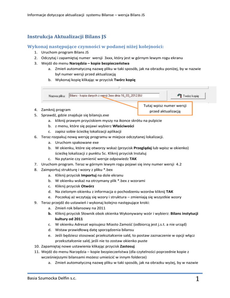Informacje dotyczące aktualizacji systemu Bilanse – wersja Bilans JS Instrukcja Aktualizacji Bilans JS Wykonaj następujące czynności w podanej niżej kolejności: 1. Uruchom program Bilans JS 2. Odczytaj i zapamiętaj numer wersji 3xxx, który jest w górnym lewym rogu ekranu 3. Wejdź do menu Narzędzia – kopie bezpieczeństwa a. Zmień automatyczną nazwę pliku w taki sposób, jak na obrazku poniżej, by w nazwie był numer wersji przed aktualizacją b. Wykonaj kopię klikając w przycisk Twórz kopię Tutaj wpisz numer wersji 4. Zamknij program przed aktualizacją 5. Sprawdź, gdzie znajduje się bilansjs.exe a. kliknij prawym przyciskiem myszy na ikonce skrótu na pulpicie b. z menu, które się pojawi wybierz Właściwości c. zapisz sobie ścieżkę lokalizacji aplikacji 6. Teraz rozpakuj nową wersję programu w miejsce odczytanej lokalizacji. a. Uruchom spakowane exe b. W okienku, które się otworzy wskaż (przycisk Przeglądaj lub wpisz w okienko) ścieżkę lokalizacji z punktu 5c. Kliknij przycisk Instaluj c. Na pytanie czy zamienić wersje odpowiedz TAK 7. Uruchom program. Teraz w górnym lewym rogu pojawi się inny numer wersji 4.2 8. Zaimportuj strukturę i wzory z pliku *.bex a. Kliknij przycisk Importuj na dole ekranu b. W okienku wskaż na otrzymany plik *.bex z wzorami c. Kliknij przycisk Otwórz d. Na zielonym okienku z informacja o pochodzeniu wzorów kliknij TAK e. Poczekaj aż wczytają się wzory i struktura – zmieniają się wszystkie wzory 9. Teraz przejdź do ustawień i wykonaj kolejno następujące kroki: a. Zmień rok bilansowy na 2011 b. Kliknij przycisk Słownik obok okienka Wykonywany wzór i wybierz: Bilans instytucji kultury od 2011 c. W okienku Adresat wpisujesz Miasto Zamość (odbiorcą jest j.s.t. a nie urząd) d. Wstaw prawidłową datę sporządzenia bilansu e. Jeśli będziesz stosować przekształcenie sald, to postaw zaznaczenie w opcji włącz przekształcenie sald, jeśli nie to zostaw okienko puste 10. Zapamiętaj nowe ustawienia klikając przycisk Zastosuj 11. Wejdź do menu Narzędzia – kopie bezpieczeństwa (dla czytelności poprzednie kopie z wcześniejszymi bilansami możesz umieścić w innym folderze) a. Zmień automatyczną nazwę pliku w taki sposób, jak na obrazku wyżej, by w nazwie Basia Szumocka Delfin s.c. 1 Informacje dotyczące aktualizacji systemu Bilanse – wersja Bilans JS był numer wersji po aktualizacji b. Wykonaj kopię klikając w przycisk Twórz kopię 12. Teraz możesz przystąpić do pracy. Uwagi: 1. Nie ma zmian w samym formularzu bilansu dla jednostki. Ponieważ zmienił się formularz bilansu skonsolidowanego, to nastąpiły zmiany w powiązaniach pozycji bilansu jednostkowego i nowego skonsolidowanego. Dlatego masz nowe wzory obu bilansów. 2. Nie przekazuj jeszcze bilansu skonsolidowanego. Warto zrobić tę czynność po zweryfikowaniu poprawności dokumentów ze sprawozdania finansowego i ich przyjęciu przez j.s.t. 3. W słowniku kont data końcowa konta nie może być wstawiona dla aktualnych kont. To okienko musi być po prostu puste. Datę końca wstawiasz, kiedy konto przestaje być używane. Jeśli masz takie ustawienia w tym słowniku, to je koniecznie popraw. Do słownika dopisz nowe konta bilansowe, których wprowadzenie wynika z rozporządzenia i przyjętej polityki rachunkowości. 4. Sprawdź czy prawidłowo definiujesz algorytm podpięcia konta 860 do bilansu. Prawidłowe ustawienia pokazuje obrazek: Basia Szumocka Delfin s.c. 2