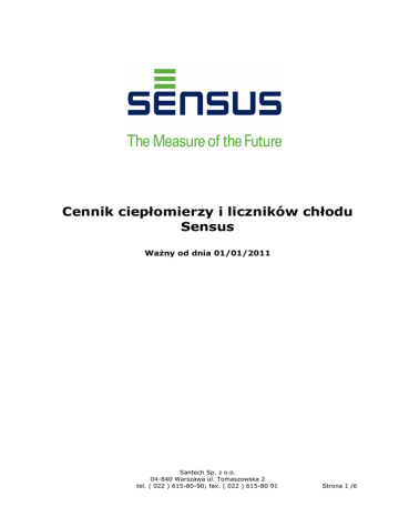 Cennik ciepłomierzy i liczników chłodu Sensus WaŜny od dnia 01/01/2011 Santech Sp. z o.o. 04-840 Warszawa ul. Tomaszowska 2 tel. ( 022 ) 615-80-90; fax. ( 022 ) 615-80 91 Strona 1 /6 KOMPAKTOWE MECHANICZNE CIEPŁOMIERZE I LICZNIKI CHŁODU PolluCom E Kompaktowe mechaniczne ciepłomierze/liczniki chłodu PolluCom E Ciepłomierz PolluCom E składa się z przelicznika wskazującego standardowo wyposaŜonego w optyczne wyjście danych, wraz z mechanicznym przetwornikiem przepływu, pary czujników temperatury Pt500 do montaŜu w tulejach o długości przewodów L = 1,5 m wraz z osłonami montaŜowymi lub do montaŜu bezpośredniego z gilzą montaŜową i O-ringiem Cena zawiera śrubunki Licznik przystosowany jest do zliczania energii w instalacjach z wodnymi roztworami glikoli L.p. - qp m3/h Średnica Cal. Długość mm Cena PLN 1 2 3 0,6 1,5 2,5 ½" ½" ¾" 110 110 130 550 550 750 Kompaktowe mechaniczne ciepłomierze/liczniki chłodu PolluCom E + M-Bus + 2 wejścia na wodomierze Ciepłomierz PolluCom E składa się z przelicznika wskazującego standardowo wyposaŜonego w optyczne wyjście danych, moduł M-Bus + 2 wejścia na wodomierze, wraz z mechanicznym przetwornikiem przepływu, pary czujników temperatury Pt500 do montaŜu w tulejach o długości przewodów L = 1,5 m wraz z osłonami montaŜowymi lub do montaŜu bezpośredniego z gilzą montaŜową i O-ringiem Cena zawiera śrubunki Licznik przystosowany jest do zliczania energii w instalacjach z wodnymi roztworami glikoli L.p. - qp m3/h Średnica Cal. Długość mm Cena PLN 1 2 3 0,6 1,5 2,5 ½" ½" ¾" 110 110 130 780 780 980 ULTRADŹWIĘKOWE CIEPŁOMIERZE I LICZNIKI CHŁODU PolluStat E Ultradźwiękowe ciepłomierze/liczniki chłodu PolluStat E o połączeniach gwintowanych Ciepłomierz PolluStat E składa się z przelicznika wskazującego standardowo wyposaŜonego w Mini-Bus i optyczne wyjście danych, data logger, wraz z ultradźwiękowym przetwornikiem przepływu ( tmax = 130oC ), pary czujników temperatury Pt500 do montaŜu w tulejach o długości przewodów L = 3,0 m wraz z osłonami montaŜowymi. Cena zawiera śrubunki L.p. - qp m3/h Średnica Cal. Długość mm 1 2 3 4 5 6 0,6 1,5 2,5 3,5 6,0 10,0 ½" ½" ¾" 1" 1" 1 ½" 110 110 130 260 260 300 Santech Sp. z o.o. 04-840 Warszawa ul. Tomaszowska 2 tel. ( 022 ) 615-80-90; fax. ( 022 ) 615-80 91 Cena PLN 1 1 1 2 2 2 500 500 590 250 250 840 Strona 2 /6 Ultradźwiękowe ciepłomierze/liczniki chłodu PolluStat E o połączeniach kołnierzowych Ciepłomierz PolluStat E składa się z przelicznika wskazującego standardowo wyposaŜonego w Mini-Bus i optyczne wyjście danych, wraz z ultradźwiękowym przetwornikiem przepływu ( tmax = 135oC ), pary czujników temperatury Pt500 do montaŜu w tulejach o długości przewodów L = 3,0 m wraz z osłonami montaŜowymi. L.p. - qp m3/h Średnica mm Długość mm 1 2 3 4 5 6 7 8 9 1,5 2,5 3,5 6,0 10,0 15,0 25,0 40,0 60,0 DN 20 DN 20 DN 25 DN 25 DN 40 DN 50 DN 65 DN 80 DN 100 190 190 260 260 300 270 300 300 360 Cena PLN 1 1 2 2 3 4 5 7 8 800 800 500 500 200 700 900 200 200 MECHANICZNE CIEPŁOMIERZE I LICZNIKI CHŁODU PolluTherm Mechaniczne ciepłomierze/liczniki chłodu PolluTherm – Unico 90oC Ciepłomierz PolluTherm składa się z przelicznika wskazującego standardowo wyposaŜonego w Mini-Bus i optyczne wyjście danych, wraz z mechanicznym przetwornikiem przepływu GWF – Unico ( 90oC ), pary czujników temperatury Pt500 do montaŜu w tulejach o długości przewodów L = 3,0 m wraz z osłonami montaŜowymi. Cena zawiera śrubunki. Licznik przystosowany jest do zliczania energii w instalacjach z wodnymi roztworami glikoli L.p. - qp m3/h Średnica Cal. Długość mm Cena PLN 1 2 3 4 0,6 1,0 1,5 2,5 ½" ½" ½" ¾" 110 110 110 130 1 230 1 230 1 240 1 230 Mechaniczne ciepłomierze/liczniki chłodu PolluTherm – MTW 90oC Ciepłomierz PolluTherm składa się z przelicznika wskazującego standardowo wyposaŜonego w Mini-Bus i optyczne wyjście danych, wraz z mechanicznym przetwornikiem przepływu GWF – MTW ( 90oC ), pary czujników temperatury Pt500 do montaŜu w tulejach o długości przewodów L = 3,0 m wraz z osłonami montaŜowymi. Cena zawiera śrubunki Licznik przystosowany jest do zliczania energii w instalacjach z wodnymi roztworami glikoli L.p. - qp m3/h Średnica Cal. Długość mm 1 2 3 4 5 6 1,5 2,5 3,5 6,0 10,0 15,0 ½" ¾" 1" 1" lub 1 ¼” 1 ½" DN50 165 190 260 260 300 300 Santech Sp. z o.o. 04-840 Warszawa ul. Tomaszowska 2 tel. ( 022 ) 615-80-90; fax. ( 022 ) 615-80 91 Cena PLN 1 1 1 1 2 3 580 580 700 700 200 000 Strona 3 /6 Mechaniczne ciepłomierze/liczniki chłodu PolluTherm – M-T AN 130oC Ciepłomierz PolluTherm składa się z przelicznika wskazującego standardowo wyposaŜonego w Mini-Bus i optyczne wyjście danych, wraz z mechanicznym przetwornikiem przepływu M-T AN ( 130oC ), pary czujników temperatury Pt500 do montaŜu w tulejach o długości przewodów L = 3,0 m wraz z osłonami montaŜowymi. Cena zawiera śrubunki Licznik przystosowany jest do zliczania energii w instalacjach z wodnymi roztworami glikoli L.p. - qp m3/h Średnica Cal. Długość mm 1 2 3 4 5 6 1,5 2,5 3,5 6,0 10,0 15,0 ½” lub ¾" ¾" 1" 1" lub 1 ¼” 1 ½" DN50 190 190 260 260 300 300 Cena PLN 1 1 1 1 2 3 600 700 850 850 400 400 Mechaniczne liczniki chłodu PolluTherm – WPD 50oC Ciepłomierz PolluTherm składa się z przelicznika wskazującego standardowo wyposaŜonego w Mini-Bus i optyczne wyjście danych, mechanicznego przetwornika przepływu WPD ( 50oC ) , nadajnika impulsów, pary czujników temperatury Pt500 do montaŜu w tulejach o długości przewodów L = 3,0 m wraz z osłonami montaŜowymi, oraz baterii litowej Licznik przystosowany jest do zliczania energii w instalacjach z wodnymi roztworami glikoli L.p. - qp m3/h Średnica mm Długość mm Cena PLN 1 2 3 4 5 6 7 8 9 10 11 10 15 25 40 60 100 150 250 400 600 1000 DN40 DN 50 DN 65 DN 80 DN 100 DN 125 DN 150 DN 200 DN 250 DN 300 DN 400 220 200 200 225 250 250 300 350 450 500 50