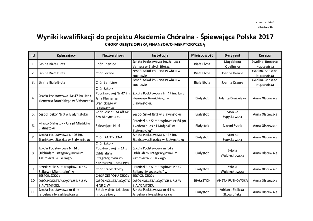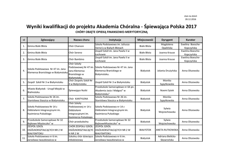stan na dzień 28.12.2016 Wyniki kwalifikacji do projektu Akademia Chóralna - Śpiewająca Polska 2017 CHÓRY OBJĘTE OPIEKĄ FINANSOWO-MERYTORYCZNĄ id Zgłaszający Nazwa choru 1. Gmina Białe Błota Chór Chanson 2. Gmina Białe Błota Chór Sereno 3. Gmina Białe Błota Chór Bambino 4. 5. Chór Szkoły Podstawowej Nr 47 im. Szkoła Podstawowa Nr 47 im. Jana Jana Klemensa Klemensa Branickiego w Białymstoku Branickiego w Białymstoku. Chór Zespołu Szkół Nr Zespół Szkół Nr 3 w Białymstoku 3 w Białymstoku 6. Miasto Białystok - Urząd Miejski w Białmstoku Śpiewające Nutki 7. Szkoła Podstawowa Nr 26 im. Stanisława Staszica w Białymstoku Chór KANTYLENA 8. Szkoła Podstawowa Nr 14 z Oddziałami Integracyjnymi im. Kazimierza Pułaskiego Chór Szkoły Podstawowej nr 14 z Oddziałami Integracyjnymi im. Kazimierza Pułaskiego Przedszkole Samorządowe Nr 32 Bajkowe Miasteczko" w ZESPÓŁ SZKÓŁ 10. OGÓLNOKSZTAŁCĄCYCH NR 2 W BIAŁYSMTOKU Szkoła Podstawowa nr 6 im. 11. Jarosława Iwaszkiewicza w 9. Instytucja Miejscowość Dyrygent Kurator Białe Błota Magdalena Opalińska Białe Błota Joanna Krause Białe Błota Joanna Krause Ewelina BoescheKopczyńska Ewelina BoescheKopczyńska Ewelina BoescheKopczyńska Szkoła Podstawowa Nr 47 im. Jana Klemensa Branickiego w Białymstoku. Białystok Jolanta Drużyńska Anna Olszewska Zespół Szkół Nr 3 w Białymstoku Białystok Monika Sypytkowska Anna Olszewska Białystok Noemi Sytek Anna Olszewska Białystok Monika Sypytkowska Anna Olszewska Białystok Sylwia Wojciechowska Anna Olszewska Białystok Sylwia Wojciechowska Anna Olszewska BIAŁYSTOK ANETA RUTKOWSKA Anna Olszewska Białystok Adriana BielickaSkowrońska Anna Olszewska Szkoła Podstawowa im. Juliusza Verne'a w Białych Błotach Zespół Szkół im. Jana Pawła II w Łochowie Zespół Szkół im. Jana Pawła II w Łochowie Przedszkole Samorządowe nr 64 pn. Akademia Jasia i Małgosi" w Białymstoku" Szkoła Podstawowa Nr 26 im. Stanisława Staszica w Białymstoku Szkoła Podstawowa nr 14 z Oddziałami Integracyjnymi im. Kazimierza Pułaskiego Przedszkole Samorządowe Nr 32 BajkoweMiasteczko" w CHÓR ZESPOŁU SZKÓŁ ZESPÓŁ SZKÓŁ OGÓLNOKSZTAŁCĄCYC OGÓLNOKSZTAŁCĄCYCH NR 2 W H NR 2 W BIAŁYSMTOKU Szkolny chór dziecięco Szkoła Podstawowa nr 6 im. młodzieżowy Jarosława Iwaszkiewicza w Chór przedszkolny Chór Publicznego Gimnazjum nr 9 w Białymstoku Chór Zespołu Szkół Zespół Szkół Ogólnokształcących nr 3 Ogólnokształcących nr w Białymstoku 3 w Białymstoku Gminna Biblioteka Publiczna im. Schola Św. Anny Józefa Narzymskiego w Bogatem Chór Bel canto Szkoły Chór Bel canto Szkoły Podstawowej Podstawowej im. im. Arkadego Fiedlera w Golinie Arkadego Fiedlera w Wielkiej Golinie Wielkiej Miejski Zespół Szkół nr 2 w Chór Melikos 1 Bolesławcu Zespół Szkół w Budach Głogowskich Akordyka Publiczne Gimnazjum nr 9 w 12. Białymstoku Publiczne Gimnazjum nr 9 w Białymstoku Białystok Magdalena Gładkowska Anna Olszewska 13. Zespół Szkół Ogólnokształcących nr 3 w Białymstoku Białystok Małgorzata Górniak Anna Olszewska Zespół Szkół im. Marszałka Józefa Piłsudskiego w Bogatem Bogate Zbigniew Olszak Anna WaligóraTarnowska Szkoła Podstawowa im. Arkadego Fiedlera w Golinie Wielkiej Bojanowo Lidia Ratajczyk Jowita Augustyniak 14. 15. 16. 17. 18. Zespół Szkół Ogólnokształcących nr 7 Septyma Miejski Zespół Szkół nr 2 w Bolesławiec Bolesławcu Zespół Szkół w Budach Głogowskich Budy Głogowskie Zespół Szkół Ogólnokształcących nr Bydgoszcz 7 Izabela Kulpa Elżbieta Kwolek Elżbieta Guzman Małgorzata SapiechaMuzioł Grzegorz Oliwa Ewelina BoescheKopczyńska 19. Zespół Szkół nr 36 ZESPÓŁ WOKALNY ZESPOŁU SZKÓŁ NR 36 ZESPÓŁ SZKÓŁ NR 36 W BYDGOSZCZY Bydgoszcz Aleksandra Walecka Ewelina BoescheKopczyńska 20. Zespóół Szkół nr 29 Słoneczne Nutki Zespół Szkół nr 29 Bydgoszcz Jagna Polus Ewelina BoescheKopczyńska Szkoła Podstawowa nr 38 im. 21. Zdobywców Wału Pomorskiego w Bydgoszczy Miasto Bydgoszcz - Zespół Szkół nr 22. 27 Bydgoszcz Chór Ojejku Szkoły Podstawowej nr 38 w Bydgoszczy Szkoła Podstawowa nr 38 im. Zdobywców Wału Pomorskiego w Bydgoszczy Bydgoszcz Roksana Ptasznik Ewelina BoescheKopczyńska Allegro Zespół Szkół nr 27 Bydgoszcz Bydgoszcz Radosław Górski 23. ZESPÓŁ SZKÓŁ NR 8 BYDGOSZCZ CHÓR TO I OWO ZESPÓŁ SZKÓŁ NR 8 BYDGOSZCZ LILIANNA PAWLAKKOZŁOWSKA Cedry Małe Anastasiya Senkavets Michał Kozorys Chmielnik Justyna SzelaAdamska Grzegorz Oliwa Chmielnik Justyna SzelaAdamska Grzegorz Oliwa Zespół Szkół w Cedrach Małych. Chór Zespołu szkół w 24. Gimnazjum i Szkoła Podstawowa im. Cedrach Małych J. Kraziewicza 25. Stowarzyszenie Pro Regione Sweet Voices MINI 26. Stowarzyszenie Pro Regione Sweet Voices Joy Zespół Szkół w Cedrach Małych. Gimnazjum i Szkoła Podstawowa im. J. Kraziewicza chór międzyszkolny w siedzibie Zespołu Szkół Ogólnokształcących nr 1 w Rzeszowie chór międzyszkolny w siedzibie Zespołu Szkół Ogólnokształcących nr 1 w Rzeszowie Ewelina BoescheKopczyńska Ewelina BoescheKopczyńska 27. Stowarzyszenie Pro Regione Sweet Voices Fusion 28. Centrum Kultury Czempiń Polihymnia 29. Gmina Czernikowo, ul. Słowackiego 12, 87-640 Czernikowo 30. Gmina Czernikowo, ul. Słowackiego 12, 87-640 Czernikowo 31. 32. 33. 34. 35. 36. 37. 38. 39. Chór PIKOLO KOPERNIKANIE - chór Gimnazjum w Czernikowie Chór Gaudeo Chór Gaudeo Powiatowego Ogniska Powiatowego Ogniska Pracy Pozaszkolnej przy Gimnazjum i Pracy Pozaszkolnej przy SP nr 1 w Świerklanach Gimnazjum i SP1 w Świerklanach Chór klas Zespół Szkół im. ks. Józefa Tischnera mundurowych Salwa Chór Nolinki przy Szkole Podstawowej nr Gmina Miasto Ełk 4 im. prof. Władysława Szafera w Ełku Chór Fantazja przy Szkole Podstawowej nr Gmina Miasto Ełk 4 im. prof. Władysława Szafera w Ełku Szkoła Podstawowa nr 9 im. Jana Chór SP 9 w Ełku Pawła II w Ełku Miejskie Przedszko