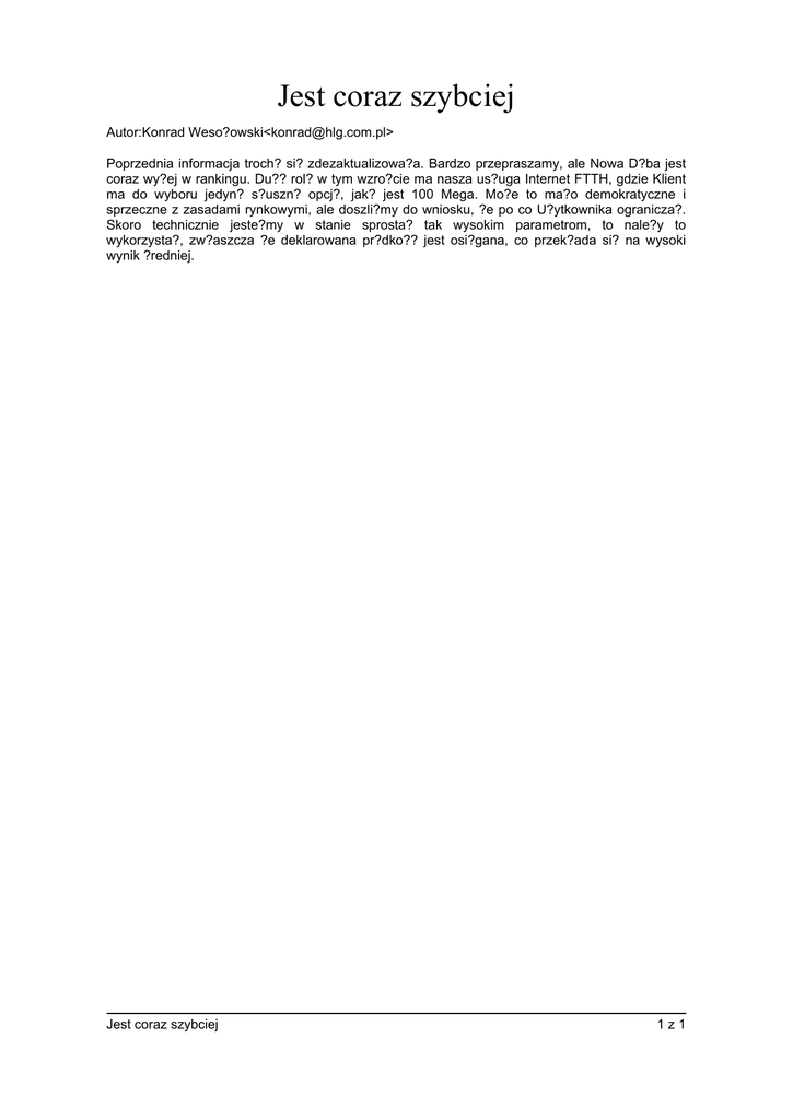 Jest coraz szybciej Autor:Konrad Weso?owski<[email protected]> Poprzednia informacja troch? si? zdezaktualizowa?a. Bardzo przepraszamy, ale Nowa D?ba jest coraz wy?ej w rankingu. Du?? rol? w tym wzro?cie ma nasza us?uga Internet FTTH, gdzie Klient ma do wyboru jedyn? s?uszn? opcj?, jak? jest 100 Mega. Mo?e to ma?o demokratyczne i sprzeczne z zasadami rynkowymi, ale doszli?my do wniosku, ?e po co U?ytkownika ogranicza?. Skoro technicznie jeste?my w stanie sprosta? tak wysokim parametrom, to nale?y to wykorzysta?, zw?aszcza ?e deklarowana pr?dko?? jest osi?gana, co przek?ada si? na wysoki wynik ?redniej. Jest coraz szybciej 1z1