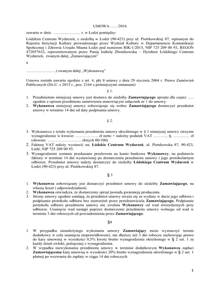 UMOWA ….. /2016 zawarta w dniu ……………….. r. w Łodzi pomiędzy: Łódzkim Centrum Wydarzeń, z siedzibą w Łodzi (90-423) przy ul. Piotrkowskiej 87, wpisanym do Rejestru Instytucji Kultury prowadzonego przez Wydział Kultury w Departamencie Komunikacji Społecznej i Zdrowia Urzędu Miasta Łodzi pod numerem RIK/1/2015, NIP 725 209 00 93, REGON 472057632, reprezentowanym przez Panią Izabelę Zbonikowską – Dyrektor Łódzkiego Centrum Wydarzeń, zwanym dalej „Zamawiającym” a ………………….) zwanym dalej „Wykonawcą” Umowa została zawarta zgodnie z art. 4, pkt 8 ustawy z dnia 29 stycznia 2004 r. Prawo Zamówień Publicznych (Dz.U. z 2015 r., poz. 2164 z późniejszymi zmianami) § 1. 1. Przedmiotem niniejszej umowy jest dostawa do siedziby Zamawiającego sprzętu dla części ….. zgodnie z opisem przedmiotu zamówienia stanowiącym załącznik nr 1 do umowy. 2. Wykonawca niniejszej umowy zobowiązuje się wobec Zamawiającego dostarczyć przedmiot umowy w terminie 14 dni od daty podpisania umowy. § 2. 1. Wykonawca z tytułu wykonania przedmiotu umowy określonego w § 1 niniejszej umowy otrzyma wynagrodzenie w kwocie: …………….. zł netto + należny podatek VAT ……….. tj. ………… zł (słownie: ……………………. złotych 00/100). 2. Fakturę VAT należy wystawić na: Łódzkie Centrum Wydarzeń, ul. Piotrkowska 87, 90-423, Łódź, NIP 725 209 00 93. 3. Wynagrodzenie zostanie przekazane przelewem na konto bankowe Wykonawcy, na podstawie faktury w terminie 14 dni wystawionej po dostarczeniu przedmiotu umowy i jego protokolarnym odbiorze. Przedmiot umowy należy dostarczyć do siedziby Łódzkiego Centrum Wydarzeń w Łodzi (90-423) przy ul. Piotrkowskiej 87. §3 1. Wykonawca zobowiązany jest dostarczyć przedmiot umowy do siedziby Zamawiającego, na własny koszt i odpowiedzialność. 2. Wykonawca oświadcza, że dostarczony sprzęt posiada gwarancję producenta. 3. Strony umowy zgodnie ustalają, że przedmiot umowy uważa się za wydany w dacie jego odbioru i podpisania protokołu odbioru bez zastrzeżeń przez przedstawiciela Zamawiającego. Podpisanie protokołu odbioru przedmiotu umowy nie zwalnia Wykonawcy od wad stwierdzonych przy odbiorze. Usunięcie wad nastąpi poprzez dostarczenie przedmiotu umowy wolnego od wad w terminie 3 dni roboczych od powiadomienia przez Zamawiającego. §4 1. W przypadku nienależytego wykonania umowy Zamawiający może wyznaczyć termin dodatkowy w celu usunięcia nieprawidłowości, nie dłuższy niż 3 dni robocze zachowując prawo do kary umownej w wysokości 0,5% kwoty brutto wynagrodzenia określonego w § 2 ust. 1 za każdy dzień zwłoki, potrąconej z wynagrodzenia. 2. W wypadku niewykonania przedmiotu umowy w terminie dodatkowym Wykonawca zapłaci Zamawiającemu karę umowną w wysokości 20% brutto wynagrodzenia określonego w § 2 ust. 1 płatnej po wezwaniu do zapłaty w ciągu 14 dni roboczych. 1 3. W przypadku niewykonania przedmiotu umowy z winy Zamawiającego, Zamawiający zapłaci Wykonawcy uzasadnione i udokumentowane koszty poniesione w związku z wykonaniem przedmiotu umowy, w terminie 14 dni roboczych od daty otrzymania pisemnego wezwania do zapłaty. 4. W przypadku niewykonania umowy z winy Wykonawcy, Zamawiający może odstąpić od umowy bez zapłaty, a Wykonawca zapłaci Zamawiającemu karę umowną w wysokości 30% wynagrodzenia określonego w § 2 ust.1, w terminie 14 dni roboczych od daty otrzymania pisemnego wezwania do zapłaty. 5. Wykonawca oświadcza, że w przypadku kar umownych wyraża zgodę na ich potrącenie z należnego wynagrodzenia. 6. Zamawiający ma prawo dochodzenia odszkodowania uzupełniającego przewyższającego naliczone kary umowne na zasadach ogólnych. 7. Strony nie ponoszą odpowiedzialności za niewykonanie lub nienależyte wykonanie obowiązków wynikających z Umowy spowodowanych siłą wyższą. Za przypadki siły wyższej uważa się wszelkie nieznane Stronom w chwili zawierania umowy zdarzenia, zaistniałe niezależnie od woli Stron, i na których zaistnienie Strony nie miały żadnego wpływu jak np. wojnę, rewolucję lub zamieszki, mobilizację lub inne nieprzewidziane zarządzenia wojskowe, rekwizycję lub konfiskatę, ograniczenia walutowe, embarga importowe lub eksportowe, klęski żywiołowe takie jak trzęsienie ziemi, pożar, powódź lub inne szkody spowodowane przez wodę, ograniczenia wynikające z przepisów prawa lub inne ograniczenia urzędowe. §5 1. 2. Wszystkie zmiany niniejszej umowy wymagają formy pisemnej pod rygorem nieważności. Strony postanawiają, że korespondencja odbywać się będzie za pośrednictwem poczty, poczty elektronicznej, faksu a) Zamawiający: adres mail: telefon: telefon: Wykonawca: adres mail: telefon: §6 W sprawach nieuregulowanych niniejszą umową mają zastosowanie odpowiednie przepisy Kodeksu cywilnego. W przypadku ewentualnych sporów, strony dążyć będą do rozstrzygnięć polubownych. §7 Niniejsza umowa sporządzona została w dwóch egzemplarzach, z tego jeden egzemplarz dla Zamawiającego i jeden dla Wykonawcy. Zamawiający: Wykonawca: 2 Załącznik nr 1 do umowy CZĘŚĆ I 1. 2 szt. mikrofon bezprzewodowy składający się z zestawu o minimalnych parametrach: mikrofon nauszny: - typ przetwornika: Pojemnościowe - wykres kierunkowości: Dookólna - pasmo przenoszenia: 20 Hz - 20 kHz - czułość (1 kHz): -41 dBV/Pa / 9 mV/Pa - równoważny szum własny: 34 dB - ciśnienie akustyczne: 107 dB SPL - subminiaturowa, wszechkierunkowa kapsuła mikrofonowa zapewnia znakomitą klarowność mowy i posiadająca zabezpieczenie przed zgłoskami wybuchowymi oraz brak efektu zbliżeniowego - posiadający przewód dodatkowo wzmocniony Kevlarem - posiadający ochronę przed zakłóceniami ze strony telefonów komórkowych i cyfrowych nadajników bodypack - kolor czarny mat - funkcjonalna forma zapewniają łatwość umieszczenia nad dowolnym uchem bodypack: Poziom wejściowy audio: - maksyma