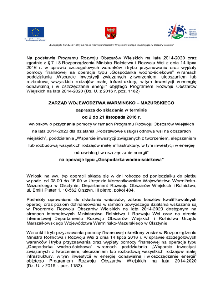 „Europejski Fundusz Rolny na rzecz Rozwoju Obszarów Wiejskich: Europa inwestująca w obszary wiejskie” Na podstawie Programu Rozwoju Obszarów Wiejskich na lata 2014-2020 oraz zgodnie z § 7 i 8 Rozporządzenia Ministra Rolnictwa i Rozwoju Wsi z dnia 14 lipca 2016 r. w sprawie szczegółowych warunków i trybu przyznawania oraz wypłaty pomocy finansowej na operacje typu „Gospodarka wodno-ściekowa” w ramach poddziałania „Wsparcie inwestycji związanych z tworzeniem, ulepszaniem lub rozbudową wszystkich rodzajów małej infrastruktury, w tym inwestycji w energię odnawialną i w oszczędzanie energii” objętego Programem Rozwoju Obszarów Wiejskich na lata 2014-2020 (Dz. U. z 2016 r. poz. 1182) ZARZĄD WOJEWÓDZTWA WARMIŃSKO – MAZURSKIEGO zaprasza do składania w terminie od 2 do 21 listopada 2016 r. wniosków o przyznanie pomocy w ramach Programu Rozwoju Obszarów Wiejskich na lata 2014-2020 dla działania „Podstawowe usługi i odnowa wsi na obszarach wiejskich”, poddziałania „Wsparcie inwestycji związanych z tworzeniem, ulepszaniem lub rozbudową wszystkich rodzajów małej infrastruktury, w tym inwestycji w energię odnawialną i w oszczędzanie energii” na operacje typu „Gospodarka wodno-ściekowa” Wnioski na ww. typ operacji składa się w dni robocze od poniedziałku do piątku w godz. od 08.00 do 15.00 w Urzędzie Marszałkowskim Województwa WarmińskoMazurskiego w Olsztynie, Departament Rozwoju Obszarów Wiejskich i Rolnictwa, ul. Emilii Plater 1, 10-562 Olsztyn, III piętro, pokój 404. Podmioty uprawnione do składania wniosków, zakres kosztów kwalifikowalnych operacji oraz poziom dofinansowania w ramach powyŜszego działania wskazane są w Programie Rozwoju Obszarów Wiejskich na lata 2014-2020 dostępnym na stronach internetowych Ministerstwa Rolnictwa i Rozwoju Wsi oraz na stronie internetowej Departamentu Rozwoju Obszarów Wiejskich i Rolnictwa Urzędu Marszałkowskiego Województwa Warmińsko-Mazurskiego w Olsztynie. Warunki i tryb przyznawania pomocy finansowej określony został w Rozporządzeniu Ministra Rolnictwa i Rozwoju Wsi z dnia 14 lipca 2016 r. w sprawie szczegółowych warunków i trybu przyznawania oraz wypłaty pomocy finansowej na operacje typu „Gospodarka wodno-ściekowa” w ramach poddziałania „Wsparcie inwestycji związanych z tworzeniem, ulepszaniem lub rozbudową wszystkich rodzajów małej infrastruktury, w tym inwestycji w energię odnawialną i w oszczędzanie energii” objętego Programem Rozwoju Obszarów Wiejskich na lata 2014-2020 (Dz. U. z 2016 r. poz. 1182). Formularz wniosku o przyznanie pomocy, formularz wniosku o płatność, formularz umowy oraz instrukcje wypełniania wniosków dostępne są na stronie internetowej Departamentu Rozwoju Obszarów Wiejskich i Rolnictwa Urzędu Marszałkowskiego Województwa Warmińsko-Mazurskiego www.prow.warmia.mazury.pl (zakładka PROW 2014-2020). Ostateczny termin składania wniosków o przyznanie pomocy w ramach działania „Podstawowe usługi i odnowa wsi na obszarach wiejskich” poddziałania „Wsparcie inwestycji związanych z tworzeniem, ulepszaniem lub rozbudową wszystkich rodzajów małej infrastruktury, w tym inwestycji w energię odnawialną i w oszczędzanie energii” na operacji typu „Gospodarka wodno-ściekowa” upływa dnia 21 listopada 2016 r. o godzinie 15:00. JeŜeli wniosek o przyznanie pomocy nie został złoŜony w terminie – pomocy nie przyznaje się, o czym Wnioskodawca zostanie poinformowany pisemnie. Szczegółowe informacje na temat ww. działania oraz zasad składania wniosków udzielane są w siedzibie Departamentu Rozwoju Obszarów Wiejskich i Rolnictwa (ul. Emilii Plater 1, 10-562 Olsztyn, pok. 455, 453) oraz pod numerami telefonów: 89 521-92-75; 89 521-92-76; 89 521-92-77; 89 521-92-96 oraz 89 521-92-85 - sekretariat PROW w dni robocze w poniedziałek od godz. 8.00 do 16.00, od wtorku do piątku w godz. od 07.30 do 15.30.