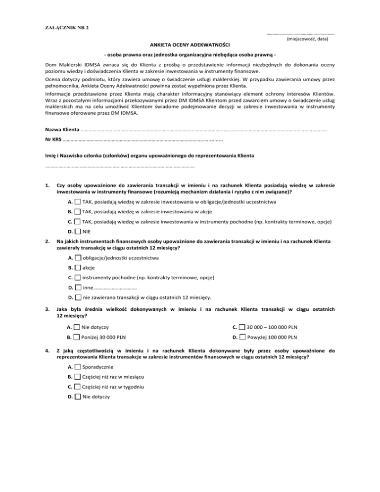 ZAŁĄCZNIK NR 2 …………………………………………………. (miejscowość, data) ANKIETA OCENY ADEKWATNOŚCI - osoba prawna oraz jednostka organizacyjna niebędąca osoba prawną Dom Maklerski IDMSA zwraca się do Klienta z prośbą o przedstawienie informacji niezbędnych do dokonania oceny poziomu wiedzy i doświadczenia Klienta w zakresie inwestowania w instrumenty finansowe. Ocena dotyczy podmiotu, który zawiera umowę o świadczenie usługi maklerskiej. W przypadku zawierania umowy przez pełnomocnika, Ankieta Oceny Adekwatności powinna zostać wypełniona przez Klienta. Informacje przedstawione przez Klienta mają charakter informacyjny stanowiący element ochrony interesów Klientów. Wraz z pozostałymi informacjami przekazywanymi przez DM IDMSA Klientom przed zawarciem umowy o świadczenie usług maklerskich ma na celu umożliwić Klientom świadome podejmowanie decyzji w zakresie inwestowania w instrumenty finansowe oferowane przez DM IDMSA. Nazwa Klienta …………………………………………………………………………………………….…………………………………………………………………….. Nr KRS …………………………………….…………………………………………………………........... Imię i Nazwisko członka (członków) organu upoważnionego do reprezentowania Klienta …………………………………………………………………….……………………………. 1. 2. 3. 4. Czy osoby upoważnione do zawierania transakcji w imieniu i na rachunek Klienta posiadają wiedzę w zakresie inwestowania w instrumenty finansowe (rozumieją mechanizm działania i ryzyko z nim związane)? A. TAK, posiadają wiedzę w zakresie inwestowania w obligacje/jednostki uczestnictwa B. TAK, posiadają wiedzę w zakresie inwestowania w akcje C. TAK, posiadają wiedzę w zakresie inwestowania w instrumenty pochodne (np. kontrakty terminowe, opcje) D. NIE Na jakich instrumentach finansowych osoby upoważnione do zawierania transakcji w imieniu i na rachunek Klienta zawierały transakcję w ciągu ostatnich 12 miesięcy? A. obligacje/jednostki uczestnictwa B. akcje C. instrumenty pochodne (np. kontrakty terminowe, opcje) D. inne…………………………… D. nie zawierano transakcji w ciągu ostatnich 12 miesięcy. Jaka była średnia wielkość dokonywanych w imieniu i na rachunek Klienta transakcji w ciągu ostatnich 12 miesięcy? A. Nie dotyczy C. 30 000 – 100 000 PLN B. Poniżej 30 000 PLN D. Powyżej 100 000 PLN Z jaką częstotliwością w imieniu i na rachunek Klienta dokonywane były przez osoby upoważnione do reprezentowania Klienta transakcje w zakresie instrumentów finansowych w ciągu ostatnich 12 miesięcy? A. Sporadycznie B. Częściej niż raz w miesiącu C. Częściej niż raz w tygodniu D. Nie dotyczy 5. 6. 7. Jaki charakter miały podejmowane w imieniu i na rachunek Klienta decyzje inwestycyjne? A. Długookresowy B. Średniookresowy C. Spekulacyjny D. Nie dotyczy Jakie wykształcenie posiadają osoby upoważnione do zawierania transakcji w imieniu i na rachunek Klienta? A. Podstawowe B. Średnie C. Wyższe D. Co najmniej jedna osoba posiada wykształcenie wyższe ekonomiczne Czy osoby upoważnione przez Klienta wykonywały zawód związany z dokonywaniem transakcji na instrumentach finansowych (polegający na aktywnym uczestnictwie w podejmowaniu decyzji transakcyjnych)? A. Nie B. Wszystkie osoby wykonywały taki zawód w przeszłości C. Przynajmniej jedna osoba wykonywała w sposób ciągły w okresie dłuższym niż rok Odmawiam udzielenia odpowiedzi na powyższe pytania OŚWIADCZENIE KLIENTA Potwierdzam rzetelność powyższych informacji. Oświadczam, że otrzymałem/-łam informacje dotyczące usług, które mają być świadczone na podstawie zawieranej umowy. Zapoznano mnie z ryzykiem inwestycyjnym związanym z ww. usługami. Zostałem/-łam poinformowany/-a, że na skutek nie udzielenia przeze mnie odpowiedzi na powyższe pytania DM IDMSA nie jest w stanie dokonać stosownej oceny. ______________________ (data) ________________________________________________ (data i podpis pracownika DM IDMSA przyjmującego formularz) (podpis w imieniu Klienta) Ilość punktów uzyskana przez Klienta na podstawie testu: ……………………………………………. Wynik testu jest pozytywny Wynik testu jest negatywny Na podstawie informacji przekazanych przez Klienta w „Ankiecie Oceny Adekwatności” Dom Maklerski stwierdza, że w ocenie Domu Maklerskiego usługi i produkty oferowane przez Dom Maklerski są adekwatne: Na podstawie informacji przekazanych przez Klienta w „Ankiecie Oceny Adekwatności” Dom Maklerski stwierdza, że w ocenie Domu Maklerskiego usługi i produkty oferowane przez Dom Maklerski są nieadekwatne w zakresie wszystkich instrumentów finansowych ze względu na zbyt duże ryzyko inwestycyjne w stosunku do zadeklarowanej wiedzy i doświadczenia inwestycyjnego w zakresie instrumentów rynku kasowego Klient nie udzielił wymaganych informacji w zakresie instrumentów rynku terminowego Oświadczamy, że zostaliśmy poinformowani, iż usługa świadczona na podstawie umowy świadczenia usług maklerskich jest dla nas odpowiednia ……………………………………………………….. (podpis Klienta) Oświadczamy, że zostaliśmy ostrzeżeni, iż w świetle przekazanych informacji dotyczących wiedzy i doświadczenia w dziedzinie inwestycji, w ocenie Domu Maklerskiego IDM S.A., usługa świadczona na podstawie zawartej umowy świadczenia usług maklerskich niesie ze sobą zbyt duże ryzyko inwestycyjne i jest nieodpowiednią dla nas usługą. Dom Maklerski IDMSA S.A. pragnie poinformować, że w związku z faktem, iż nie udzielili Państwo wyczerpujących informacji na temat swojej wiedzy i doświadczenia w zakresie inwestowania w instrumenty finansowe, Dom Maklerski IDMSA S.A. nie jest w stanie dokonać oceny, czy posiada