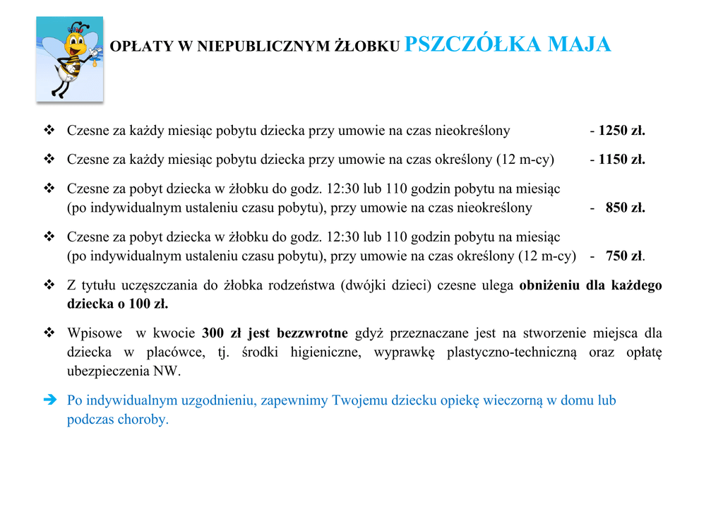 OPŁATY W NIEPUBLICZNYM ŻŁOBKU PSZCZÓŁKA MAJA Czesne za każdy miesiąc pobytu dziecka przy umowie na czas nieokreślony - 1250 zł. Czesne za każdy miesiąc pobytu dziecka przy umowie na czas określony (12 m-cy) - 1150 zł. Czesne za pobyt dziecka w żłobku do godz. 12:30 lub 110 godzin pobytu na miesiąc (po indywidualnym ustaleniu czasu pobytu), przy umowie na czas nieokreślony - 850 zł. Czesne za pobyt dziecka w żłobku do godz. 12:30 lub 110 godzin pobytu na miesiąc (po indywidualnym ustaleniu czasu pobytu), przy umowie na czas określony (12 m-cy) - 750 zł. Z tytułu uczęszczania do żłobka rodzeństwa (dwójki dzieci) czesne ulega obniżeniu dla każdego dziecka o 100 zł. Wpisowe w kwocie 300 zł jest bezzwrotne gdyż przeznaczane jest na stworzenie miejsca dla dziecka w placówce, tj. środki higieniczne, wyprawkę plastyczno-techniczną oraz opłatę ubezpieczenia NW. Po indywidualnym uzgodnieniu, zapewnimy Twojemu dziecku opiekę wieczorną w domu lub podczas choroby.