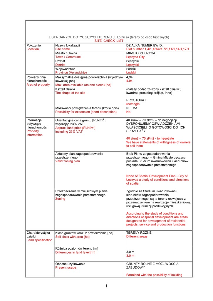 LISTA DANYCH DOTYCZĄCYCH TERENU ul. Lotnicza (tereny od osób fizycznych) SITE CHECK LIST Położenie Nazwa lokalizacji DZIAŁKA NUMER EWID. Location Site name Plot number 1,4/1,1354/1,7/1,11/1,14/1,17/1 Miasto / Gmina MIASTO ŁĘCZYCA Town / Commune Łęczyca City Powiat Łęczycki District Łęczycki Województwo Łódzki Province (Voivodship) Łódzki Powierzchnia Maksymalna dostępna powierzchnia (w jednym 4,94 nieruchomości 4,94 kawałku) ha Area of property Max. area available (as one piece) ha Kształt działki (należy podać zbliżony kształt działki tj. The shape of the site kwadrat, prostokąt, trójkąt, inne) Informacje dotyczące nieruchomości Property information Możliwości powiększenia terenu (krótki opis) Possibility for expansion (short description) PROSTOKĄT rectangle NIE MA No Orientacyjna cena gruntu PLN/m włączając 23% VAT 2 Approx. land price PLN/m including 23% VAT 40 zł/m2 – 70 zł/m2 – do negocjacji DYSPONUJEMY OŚWIADCZENIAMI WŁAŚCICIELI O GOTOWOŚCI DO ICH SPRZEDAŻY 2 40 zł/m2 – 70 zł/m2 - to negotiate We have statements of willingness of owners to sell them Aktualny plan zagospodarowania przestrzennego Valid zoning plan Brak Planu zagospodarowania przestrzennego – Gmina Miasto Łęczyca posiada Studium uwarunkowań i kierunków zagospodarowania przestrzennego. None of Spatial Development Plan - City of Łęczyca a study of conditions and directions of spatial Przeznaczenie w miejscowym planie zagospodarowania przestrzennego Zoning Zgodnie ze Studium uwarunkowań i kierunków zagospodarowania przestrzennego, są to tereny rozwojowe z przeznaczeniem na realizacje mieszkaniową, usługową i funkcji produkcyjnych According to the study of conditions and directions of spatial development are areas designated for development of residential projects, service and production functions Charakterystyka Klasa gruntów wraz z powierzchnią ha działki Soil class with area ha Land specification Różnica poziomów terenu m Differences in land level m TERENY RÓŻNE Different areas 3,0 m 3,0 m Obecne użytkowanie Present usage GRUNTY ROLNE Z MOŻLIWOŚCIA ZABUDOWY Farmland with the possibility of building 1 Zanieczyszczenia wód powierzchniowych i gruntowych Soil and underground water pollution Poziom wód gruntowych m Underground water level m NIE WYSTĘPUJĄ Do not occur Czy były prowadzone badania geologiczne terenu Were geological research done Nie No Ryzyko wystąpienia zalań lub obsunięć terenu Risk of flooding or land slide Nie No Przeszkody podziemne Underground obstacles Nie No Przeszkody występujące na powierzchni terenu Ground and overhead obstacles NA DZIAŁKACH 1, 4/1, 1354/1, 7/1 – W CZĘŚCI POŁUDNIOWEJ PRZEBIEGA LINIA ŚREDNIEGO NAPIĘCIA BRAK DANYCH No data available Na działkach 1, 4/1, 1354/1, 7/1 – in the southern part of the medium-voltage power line Połączenia transportowe Transport links Istniejące ograniczenia ekologiczne Ecological restrictions Nie No Budynki i zabudowania na terenie Buildings / other constructions on site Nie No Droga dojazdowa do terenu (rodzaj drogi i jej szerokość) Access road to the plot (type and width of access road) Autostrada / droga krajowa km Nearest motorway / national road km DROGA ASFALTOWA, PAS DROGOWY 10M The asphalt road, lane 10m DROGA KRAJOWA - OKOŁO 1,5 km National road - About 1,5 km. Porty rzeczne i morskie w odległości do 200 km NIE WYSTĘPUJĄ Sea and river ports located up to 200 km Do not occur Kolej km Railway line km Łęczyca– 1 km Łęczyca– 1 km Bocznica kolejowa km Railway siding km Łęczyca– 1 km Łęczyca– 1 km Najbliższe lotnisko międzynarodowe km Nearest international airport km Łódź – 45 km Łódź – 45 km Najbliższe miasto wojewódzkie km Nearest province capital km Łódź – 45 km Łódź – 45 km 2 Istniejąca infrastruktura Existing infrastructure Elektryczność na terenie Electricity Tak Yes Odległość przyłącza od granicy terenu Connection point (distance from boundary) m Napięcie Voltage kV OKOŁO 30,0M About 30,0 m WEDŁUG ZAPOTRZEBOWANIA. W UZGODNIENIU Z GESTOREM. According to. demand. In agreement with the patron Dostępna moc Available capacity MW WEDŁUG ZAPOTRZEBOWANIA. W UZGODNIENIU Z GESTOREM. According to. demand. In agreement with the patron Gaz na terenie Gas Tak Yes Odległość przyłącza od granicy działki Connection point (distance from boundary) m WEDŁUG ZAPOTRZEBOWANIA. W UZGODNIENIU Z GESTOREM. According to. demand. In agreement with the patron Wartość kaloryczna 3 Calorific value MJ/Nm WEDŁUG ZAPOTRZEBOWANIA. W UZGODNIENIU Z GESTOREM. Średnica rury Pipe diameter mm According to. demand. In agreement with the patron WEDŁUG ZAPOTRZEBOWANIA. W UZGODNIENIU Z GESTOREM. Dostępna objętość 3 Available capacity Nm /h According to. demand. In agreement with the patron BRAK DANYCH No data available Woda na terenie Water supply Tak Yes Odległość przyłącza od granicy terenu Connection point (distance from boundary) m Dostępna objętość 3 Available capacity m /24h Kanalizacja na terenie Sewage discharge BRAK DANYCH No data available Tak Yes Odległość przyłącza od granicy terenu Connection point (distance from boundary) m Dostępna objętość 3 Available capacity m /24h Oczyszczalnia ścieków na terenie bądź w bezpośrednim sąsiedztwie Treatment plant Telefony Telephone OKOŁO 20,0 M About 20,0 m Odległość przyłącza od granicy terenu Connection point (distance from boundary) m 3 OKOŁO 20,0 M About 20,0 m BRAK DANYCH No data available 5,0 m3/h Z MOŻLIWOŚCIĄ ROZBUDOWY 5,0 m3/h with the possibility of extension Tak Yes OKOŁO 30,0 M About 20,0 m Osoby do kontaktu Contact person MARIA GRUSZCZELAK – kierownik Referat Gospodarki Nieruchomościami i Planowanie Przestrzenne Tel. 024/721 03 33 [email protected] MIROSŁAWA KOPALAK – inspektor Referat Gospodarki Nieruchomościami i Planowanie Przestrzenne Tel. 024/ 721 03 29 [email protected] KRZYSZTOFA ŁUCZAK – inspektor Refe