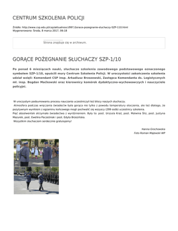 CENTRUM SZKOLENIA POLICJI Źródło: http://www.csp.edu.pl/csp/aktualnosci/997,Gorace-pozegnanie-sluchaczy-SZP-110.html Wygenerowano: Środa, 8 marca 2017, 06:18 Strona znajduje się w archiwum. GORĄCE POŻEGNANIE SŁUCHACZY SZP-1/10 Po ponad 6 miesiącach nauki, słuchacze szkolenia zawodowego podstawowego oznaczonego symbolem SZP-1/10, opuścili mury Centrum Szkolenia Policji. W uroczystości zakończenia szkolenia udział wzięli: Komendant CSP insp. Arkadiusz Brzozowski, Zastępca Komendanta ds. Logistycznych mł. insp. Bogdan Maćkowski oraz kierownicy komórek dydaktyczno-wychowawczych i nauczyciele policyjni. W uroczystym podsumowaniu procesu nauczania uczestniczyli też bliscy naszych słuchaczy. Atmosfera podczas wręczania świadectw była gorąca nie tylko z powodu temperatury otoczenia, ale też dlatego, że pozytywnym wynikiem z egzaminu końcowego mogli pochwalić się wszyscy (299 osób) uczestnicy szkolenia. Pięć absolwentek otrzymało świadectwa z wyróżnieniem. Były to: post. Urszula Kraś, post. Malwina Śliz, post. Justyna Mazurek, post. Ewelina Pacześniak i post. Edyta Brzezińska. Wszystkim słuchaczom serdecznie gratulujemy! Hanna Grochowska Foto Roman Majewski WP Ocena: 0/5 (0) Tweetnij