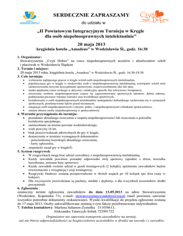 SERDECZNIE ZAPRASZAMY do udziału w „II Powiatowym Integracyjnym Turnieju w Kręgle dla osób niepełnosprawnych intelektualnie” 20 maja 2013 kręgielnia hotelu „Amadeus” w Wodzisławiu Śl., godz. 16:30 1. Organizator: Stowarzyszenie ,,Czyń Dobro” na rzecz niepełnosprawnych uczniów i absolwentów szkół i placówek w Wodzisławiu Śląskim 2. Termin i miejsce: 20 maja 2013 roku, kręgielnia hotelu „Amadeus” w Wodzisławiu Śl., godz. 16:30-19:30 3. Cele turnieju: wyłonienie najlepszego gracza w kręgle wśród osób niepełnosprawnych intelektualnie, popularyzacja gry w kręgle w środowisku osób z niepełnosprawnością intelektualną, rozwijanie wśród nich zainteresowania nowymi dyscyplinami sportowymi, rozpowszechnienie idei fair play, nauka spędzania czasu wolnego w aktywny i atrakcyjny sposób, bez telewizora i komputera, stworzenie osobom niepełnosprawnym szansy na zaprezentowanie sportowych talentów, dobrą zabawę, podniesienie poczucie własnej wartości oraz kwalifikacji sportowych, kształtowanie u osób niepełnosprawnych intelektualnie umiejętności kulturalnego zachowania się w sytuacjach społecznych, przełamywanie lęków przed nieznanym, integracja osób niepełnosprawnych z innymi: pełno- i niepełnosprawnymi członkami społeczeństwa, zmiana obrazu osoby niepełnosprawnej w społeczeństwie. 4. Warunki przystąpienia do turnieju: posiadanie aktualnego orzeczenia o stopniu niepełnosprawności lub orzeczenia o potrzebie kształcenia specjalnego, zamieszkanie na terenie powiatu wodzisławskiego, wiek powyżej 16 lat, brak przeciwwskazań zdrowotnych do gry w kręgle, dostarczenie w terminie wymaganych dokumentów: - potwierdzonej kserokopii aktualnego orzeczenia, - karty zgłoszenia, znajomość zasad gry w kręgle. 5. System rozgrywek: W rozgrywkach mogą brać udział zawodnicy z niepełnosprawnością intelektualną. Każdy zawodnik powinien posiadać odpowiedni strój sportowy (spodnie z dresu, koszulka bawełniana, zmienne buty sportowe) Każdy zawodnik weźmie udział w grach treningowych (2 kolejki), spóźnienie zawodników będzie równoznaczne z rezygnacją z sesji treningowej. Rozgrywki finałowe zostaną przeprowadzone w dwóch sesjach po 10 kolejek (po dwa rzuty w kolejce). Dla zwycięzców przewidziane są puchary, medale i dyplomy, a dla wszystkich uczestników słodki poczęstunek. 6. Zgłoszenia : ostateczny termin zgłoszenia zawodników do dnia 13.05.2013 na adres Stowarzyszenia (Wodzisław, Kopernika 71), e-mail: [email protected] (mail powinien zawierać wszystkie potrzebne dokumenty zeskanowane). Wyniki kwalifikacji do projektu ogłoszone zostaną do 17 maja 2013. Osoby zakwalifikowane zostaną o tym fakcie poinformowane indywidualnie. 7. Telefon kontaktowy: Marlena Salamon-Żymełka 511058613, Aleksandra Tatarczyk-Sobek 722991722 Organizator nie zapewnia transportu zawodników na turniej, ani nie bierze odpowiedzialności za bezpieczeństwo uczestników w drodze na zawody i z zawodów.