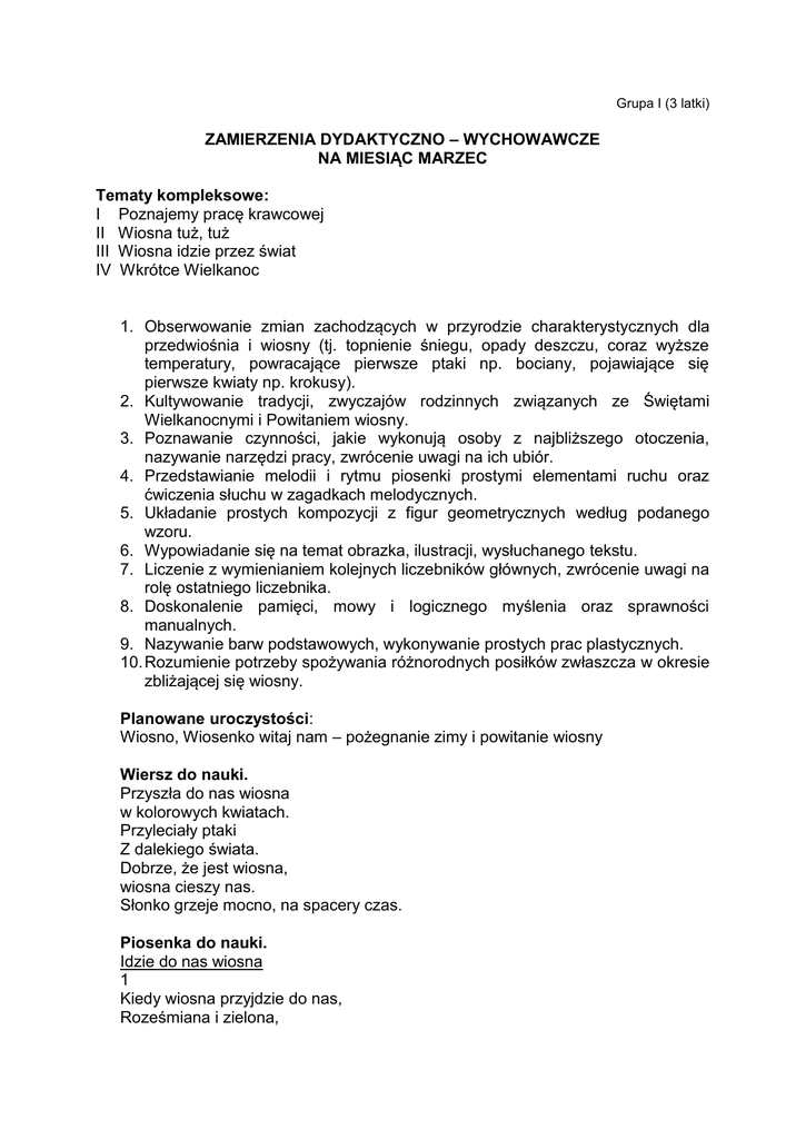 Grupa I (3 latki) ZAMIERZENIA DYDAKTYCZNO – WYCHOWAWCZE NA MIESIĄC MARZEC Tematy kompleksowe: I Poznajemy pracę krawcowej II Wiosna tuż, tuż III Wiosna idzie przez świat IV Wkrótce Wielkanoc 1. Obserwowanie zmian zachodzących w przyrodzie charakterystycznych dla przedwiośnia i wiosny (tj. topnienie śniegu, opady deszczu, coraz wyższe temperatury, powracające pierwsze ptaki np. bociany, pojawiające się pierwsze kwiaty np. krokusy). 2. Kultywowanie tradycji, zwyczajów rodzinnych związanych ze Świętami Wielkanocnymi i Powitaniem wiosny. 3. Poznawanie czynności, jakie wykonują osoby z najbliższego otoczenia, nazywanie narzędzi pracy, zwrócenie uwagi na ich ubiór. 4. Przedstawianie melodii i rytmu piosenki prostymi elementami ruchu oraz ćwiczenia słuchu w zagadkach melodycznych. 5. Układanie prostych kompozycji z figur geometrycznych według podanego wzoru. 6. Wypowiadanie się na temat obrazka, ilustracji, wysłuchanego tekstu. 7. Liczenie z wymienianiem kolejnych liczebników głównych, zwrócenie uwagi na rolę ostatniego liczebnika. 8. Doskonalenie pamięci, mowy i logicznego myślenia oraz sprawności manualnych. 9. Nazywanie barw podstawowych, wykonywanie prostych prac plastycznych. 10. Rozumienie potrzeby spożywania różnorodnych posiłków zwłaszcza w okresie zbliżającej się wiosny. Planowane uroczystości: Wiosno, Wiosenko witaj nam – pożegnanie zimy i powitanie wiosny Wiersz do nauki. Przyszła do nas wiosna w kolorowych kwiatach. Przyleciały ptaki Z dalekiego świata. Dobrze, że jest wiosna, wiosna cieszy nas. Słonko grzeje mocno, na spacery czas. Piosenka do nauki. Idzie do nas wiosna 1 Kiedy wiosna przyjdzie do nas, Roześmiana i zielona, Razem z wiosną wszystkie dzieci Zaśpiewają tak: Ref: Zielona trawa, zielony mech, Zielona żaba…rech, rechu, rech./ 2x 2 Rośnie trawa, rosną listki, Rosną szybko dzieci wszystkie. Przyfrunęły też bociany I klekocą tak: Ref: Zielona… 3 W lesie kwitnie już zawilec, Obudziły się motyle, A wieczorem nad łąkami Słychać żabi śpiew: Ref: Zielona …..