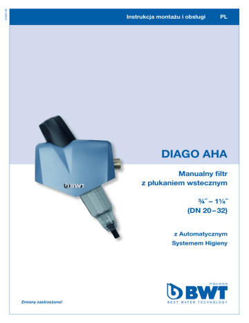 070927-SK Instrukcja montażu i obsługi PL DIAGO AHA Manualny filtr z płukaniem wstecznym ¾˝ – 1¼˝ (DN 20 – 32) z Automatycznym Systemem Higieny Zmiany zastrzeżone! 1. Dane techniczne typ nominalna średnica przyłącza wydajność przy p = 0,2 bar wydajność przy p = 0,5 bar wydajność przy p = 1 bar skuteczność filtracji max./min. ciśnienie nominalne (PN) ciśnienie robocze, min./max. temperatura wody, max. temperatura otoczenia, max. długość montażowa bez śrubunku długość montażowa ze śrubunkiem całkowita wysokość minimalna odległość od osi rury do podłogi ciężar roboczy, ok. typ baterii nr zamówienia woda surowa A B C D DN m3/h m3/h m3/h µm bar bar o C o C mm mm mm mm kg AA ¾˝ 20 3,0 5,5 7,0 1¼˝ 32 5,0 7,5 9,0 120 205 335 320 1˝ 25 3,5 6,0 7,5 90 / 110 16 2,5 podczas płukania / 16 30 40 120 205 335 320 2,0 2 szt. 1,5 V 080830 2,0 2 szt. 1,5 V 080831 2,0 2 szt. 1,5 V 080825 woda oczyszczona 130 226 335 320 2. Zakres dostawy 4. Działanie Kompletny filtr DIAGO AHA (rys. 1), składający się z następujących elementów: Woda przeznaczona do filtracji przepływa przez wejście wody surowej do filtra i dalej poprzez wewnętrzny element filtracyjny płynie do wyjścia wody oczyszczonej (rys. 1). Podczas filtracji cząsteczki zanieczyszczeń > 90 µm zostają zatrzymane w filtrze - na wewnętrznej stronie wkładki filtracyjnej, która musi być regularnie czyszczona poprzez płukanie wsteczne filtra. – – – – – – głowica mosiężna; śrubunki przyłączeniowe (1) z uszczelkami; przezroczysty cylinder z elementem filtracyjnym (2); przyłącze węża wody popłucznej (3); pokrętło elementu płukania wstecznego (4); pokrywa z Automatycznym Systemem Higieny (AHA) (5). Podczas płukania filtra w pierwszej kolejności następuje wypłukanie większych zanieczyszczeń, a następnie odessanie cząstek zatrzymanych na wewnętrznej stronie elementu filtracyjnego i wypłukanie ich do kanalizacji. 3. Zastosowanie Filtr przeznaczony jest do filtrowania wody pitnej i użytkowej, jako ochrona rur i innych elementów wodociągu przed nieprawidłowym funkcjonowaniem i szkodami powodowanymi np. korozją, różnymi zanieczyszczeniami, wiórami, piaskiem, konopiami i innymi podobnymi cząstkami. Filtry nie powinny być używane do obiegów wody procesowej i wody chłodzącej poddawanej obróbce chemicznej. Filtry nie nadają się również oczyszczania wody zawierającej substancje oleiste, tłuszcze, rozpuszczalniki, mydła i inne maziste substancje, ani też do oddzielania składników rozpuszczonych w wodzie. Przy wodzie zawierającej duże zanieczyszczenia należy przed filtrem zamontować odpowiedni separator zanieczyszczeń, a w przypadku wody pochodzącej z ujęć własnych zaleca się instalację filtra z wkładem wymiennym. UWAGA: Zgodnie z wymaganiami norm i przepisów sanitarnych (AVB Wasser V, § 12.2), zainstalowanie urządzenia oraz istotne zmiany w instalacji mogą być dokonane tylko przez odpowiednie, autoryzowane firmy instalacyjne. 5. Warunki wstępne montażu Należy wziąć pod uwagę lokalne uregulowania dotyczące instalacji wodnych oraz ogólne wytyczne (WVU, DIN, DVGW lub ÖVGW lub SVGW) i dane techniczne urządzenia. Należy zapewnić przyłącze kanalizacji o średnicy przynajmniej DN 40. Filtr należy montować w instalacji wody zimnej przed obiektem (urządzeniem), który ma być chroniony (schemat montażu - rys. 3). Należy przewidzieć również montaż zaworu odcinającego. Jeżeli w instalacji doprowadzającej wodę – w wodomierzu – nie jest zainstalowany zawór zwrotny, należy przed filtrem taki zawór zamontować. Filtr należy montować w instalacji poziomej (należy zwrócić uwagę na kierunek przepływu - rys. 1). UWAGA: Instalacja musi być chroniona przez mrozem. Należy również zagwarantować ochronę filtra przed oparami rozpuszczalników, olejem opałowym, ługami myjącymi, wszystkimi rodzajami chemikaliów, promieniowaniem UV i źródłami ciepła powyżej 40 °C. UWAGA: Części z tworzywa sztucznego należy trzymać z dala od olejów, tłuszczów, rozpuszczalników i kwasów oraz środków czystości. Po mocnych wstrząsach i uderzeniach (np. spowodowanych niewłaściwymi narzędziami, upadkiem na kamienną podłogę itd.) części z tworzywa sztucznego muszą być wymienione – nawet jeśli nie widać na zewnątrz uszkodzeń (niebezpieczeństwo pęknięcia). Należy unikać nagłych skoków ciśnienia hydraulicznego. 6. Montaż Wyjąć pokrętło elementu płukania wstecznego (4) i zdjąć pokrywę (5). Zamontować śrubunki (1) i podłączyć filtr, zwracając uwagę na kierunek przepływu (oznaczony strzałką na głowicy filtra). Nałożyć ponownie pokrywę i włożyć pokrętło elementu płukania wstecznego. Poprowadzić wężem do kanalizacji odprowadzenie wody popłucznej lub zapewnić zbiornik na wodę (ok. 10 l). WSKAZÓWKA: Zgodnie z normą DIN 1988 wąż wody popłucznej musi być zamocowany w odległości przynajmniej 20 mm od możliwie najwyższego poziomu ścieków i poprowadzony z wolnym spadkiem do odpływu. 7. Uruchomienie 7.2. Automatyczny System Higieny (Automatic Hygiene Advice) Test (test baterii i test działania) Włożyć baterie i odczekać 3 sek. 1 x wcisnąć krótko przycisk. OK: 10 x BEEP i 10 x BLINK (sygnał akustyczny) (sygnał wizualny) W przypadku braku sygnałów (BEEP/BLINK) lub mniejszej ich ilości, należy wymienić baterie. Uruchomienie Sprawdzić, czy baterie zostały włożone. Uruchomić poprzez dwukrotne kliknięcie. Zmiana trybu pracy Nacisnąć przycisk i przytrzymać wciśnięty dłużej niż przez 5 sek. Zaczekać na sygnał akustyczny (BEEP). 7.1. Filtr Sprawdzić filtr i wąż wody popłucznej pod względem właściwej instalacji (szczelność podłączeń). Nie należy jeszcze otwierać zaworów odcinających. Pokrętło (4) zamknąć obracając zgodnie z ruchem wskazówek zegara. Powoli otworzyć zawory przed i za filtrem. Odpowietrzyć instal