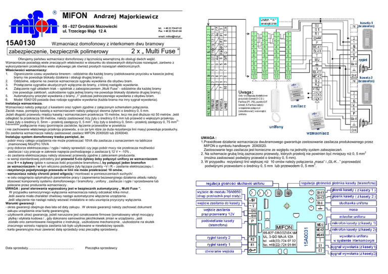 15A0130 Wzmacniacz domofonowy z interkomem dwu bramowy zabezpieczenie, bezpiecznik polimerowy 2 x „ Multi Fuse ” Oferujemy państwu wzmacniacz domofonowy z łącznością wewnętrzną do obsługi dwóch wejść. Wzmacniacze posiadają wiele znaczących właściwości w stosunku do stosowanych dotychczas rozwiązań, zarówno z wykorzystaniem przekaźnika wielo stykowego jak równieŜ prostych rozwiązań elektronicznych. Właściwości wzmacniaczy: 1. Ograniczenie czasu wywołania timerem - oddzielnie dla kaŜdej bramy (zablokowanie przycisku w kasecie jednej bramy nie powoduje blokady działania i obsługi drugiej bramy). 2. Oddzielne, odporne na zwarcie wzmacniacze sygnału wywołania dla obydwu bram. 3. Przełączenie sygnałów akustycznych wyłącznie do bramy, z której nastąpiło wywołanie. 4. Załączenie rygli układem triak – optotriak z zabezpieczeniem „Multi Fuse” - oddzielnie dla kaŜdej bramy (nie powoduje zakłóceń, uszkodzenie rygla jednej bramy nie powoduje blokady działania drugiej bramy). 5. Automatyczny priorytet wywołania z bramy „1” podczas jednoczesnego wywołania z obydwu bram. 6. Model 15A0120 posiada dwa rodzaje sygnałów wywołania (kaŜda brama ma inny sygnał wywołania). Instalacja wzmacniacza. Wzmacniacz naleŜy połączyć z kasetami oraz ryglem zgodnie z załączonym schematem połączenia. Zacisk masa, pomiędzy kasetą a wzmacniaczem naleŜy połączyć dwoma Ŝyłami o średnicy 0, 5 mm. JeŜeli długość przewodu między kasetą i wzmacniaczem przekracza 15 metrów, lecz nie jest dłuŜsza niŜ 50 metrów. Jeśli odległość ta przekracza 50 metrów, naleŜy zastosować trzy Ŝyły o średnicy 0.5 mm lub przewód o większym przekroju ( dwie Ŝyły o średnicy 0, 5mm – przekrój zastępczy 0, 5 mm2, trzy Ŝyły o średnicy 0, 5mm - przekrój zastępczy 0, 75 mm2) . Nieprawidłowe podłączenie masy (pominięcie zacisków, łączenie przewodów w powietrzu i nie zachowanie właściwego przekroju przewodu, a co za tym idzie za duŜa rezystancja linii masy) powoduje przesłuchy. Do zasilenia wzmacniacza naleŜy zastosować zasilacz MIFON 20X0020 lub 20X0040. Instalując system domofonowy trzeba pamiętać, Ŝe: - pobór mocy całego urządzenia nie moŜe przekraczać 10VA dla zasilacza z oznaczeniem na tabliczce znamionowej Moc(Pn) 10VA - przy doborze elektrozaczepu / rygla / naleŜy sprawdzić czy jego pobór mocy nie przekracza moŜliwości zasilacza i czy pracuje w zakresie napięcia pochodzącego z zasilacza tj.12 V + -10% , - do zasilania elektrozaczepu naleŜy stosować przewody zgodne z zaleceniem producenta. - w wersji standardowej potrzebny jest przewód 5-cio Ŝyłowy Ŝeby połączyć unifony ze wzmacniaczem oraz 9 + n Ŝyłowy /gdzie n oznacza ilość przycisków bramofonu /, by połączyć jeden bramofon ze wzmacniaczem / w tym wliczono podwójne Ŝyły łączące punkty ~V i R – zasilanie elektrozaczepu /. - rezystancja pojedynczego przewodu w linii nie moŜe przekraczać 10 omów, - wzmacniacz naleŜy chronić przed wilgocią / montować w pomieszczeniach suchych/. - w celu osiągnięcia optymalnych parametrów pracy i zapewnienia bezawaryjnego działania układu naleŜy stosować komponenty systemu domofonowego / bramofony , unifony , zasilacze i rygle / sprzedawane lub polecane przez producenta wzmacniaczy . UWAGA : panel sterowania wyposaŜony jest w bezpiecznik automatyczny „ Multi Fuse ”. W przypadku samoczynnego wyłączenia wzmacniacza naleŜy odczekać kilka minut . Jeśli awaria miała charakter chwilowy nastąpi automatyczne włączenie urządzenia . Jeśli włączenie nie nastąpi naleŜy wezwać instalatora w celu usunięcia przyczyny wyłączenia. Warunki gwarancji : - okres gwarancji obejmuje dwa lata od daty zakupu . W okresie gwarancji naleŜy zachować dokument zakupu urządzenia oraz kartę gwarancyjną. - uŜytkownik utraci gwarancję, jeŜeli naruszone jest oznakowanie firmowe /pomalowany wkręt mocujący płytkę i etykieta kodowa / , gdy dokonano samowolnie jakichkolwiek zmian w urządzeniu , jeśli zostało ono zamontowane niezgodnie z instrukcją , uszkodzone mechanicznie , uszkodzone na skutek znacznego wzrostu napięcia zasilania lub było uŜytkowane w niewłaściwy sposób. - karta gwarancyjna musi zawierać datę sprzedaŜy oraz pieczątkę sprzedawcy. Data sprzedaŜy................................................... Pieczątka sprzedawcy UWAGA : 1.Prawidłowe działanie wzmacniacza dwubramowego gwarantuje zastosowanie zasilacza produkowanego przez MIFON o symbolu handlowym 20X0020. Zastosowanie tego zasilacza jest konieczne ze względu na jednolity system zabezpieczeń. 2. Na schemacie grubą linią zaznaczono przewody, których przekrój nie powinien być mniejszy niŜ 0, 5 mm2 (moŜna zastosować podwójny przewód o średnicy 0, 5 mm). 3. W przypadku rezystancji linii większej niŜ 10 omów naleŜy połączenia „masa” i „GL-K...” poprowadzić 2 podwójnymi przewodami o średnicy 0, 5 mm lub przewodem 0, 5 mm .