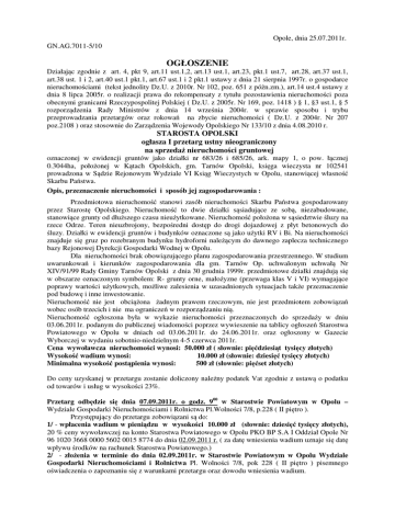 Opole, dnia 25.07.2011r. GN.AG.7011-5/10 OGŁOSZENIE Działając zgodnie z art. 4, pkt 9, art.11 ust.1,2, art.13 ust.1, art.23, pkt.1 ust.7, art.28, art.37 ust.1, art.38 ust. 1 i 2, art.40 ust.1 pkt.1, art.67 ust.1 i 2 pkt.1 ustawy z dnia 21 sierpnia 1997r. o gospodarce nieruchomościami (tekst jednolity Dz.U. z 2010r. Nr 102, poz. 651 z późn.zm.), art.14 ust.4 ustawy z dnia 8 lipca 2005r. o realizacji prawa do rekompensaty z tytułu pozostawienia nieruchomości poza obecnymi granicami Rzeczypospolitej Polskiej ( Dz.U. z 2005r. Nr 169, poz. 1418 ) § 1, §3 ust.1, § 5 rozporządzenia Rady Ministrów z dnia 14 września 2004r. w sprawie sposobu i trybu przeprowadzania przetargów oraz rokowań na zbycie nieruchomości ( Dz.U. z 2004r. Nr 207 poz.2108 ) oraz stosownie do Zarządzenia Wojewody Opolskiego Nr 133/10 z dnia 4.08.2010 r. STAROSTA OPOLSKI ogłasza I przetarg ustny nieograniczony na sprzedaż nieruchomości gruntowej oznaczonej w ewidencji gruntów jako działki nr 683/26 i 685/26, ark. mapy 1, o pow. łącznej 0.3044ha, położonej w Kątach Opolskich, gm. Tarnów Opolski, księga wieczysta nr 102541 prowadzona w Sądzie Rejonowym Wydziale VI Ksiąg Wieczystych w Opolu, stanowiącej własność Skarbu Państwa. Opis, przeznaczenie nieruchomości i sposób jej zagospodarowania : Przedmiotowa nieruchomość stanowi zasób nieruchomości Skarbu Państwa gospodarowany przez Starostę Opolskiego. Nieruchomość to dwie działki sąsiadujące ze sobą, niezabudowane, stanowiące grunty od dłuższego czasu nieużytkowane. Nieruchomość położona w sąsiedztwie śluzy na rzece Odrze. Teren nieuzbrojony, bezpośredni dostęp do drogi dojazdowej z płyt betonowych do śluzy. Działki w ewidencji gruntów i budynków oznaczone są jako użytki RV i Bi. Na nieruchomości znajduje się gruz po rozebranym budynku hydroforni należącym do dawnego zaplecza technicznego bazy Rejonowej Dyrekcji Gospodarki Wodnej w Opolu. Dla nieruchomości brak obowiązującego planu zagospodarowania przestrzennego. W studium uwarunkowań i kierunków zagospodarowania dla gm. Tarnów Op. uchwalonym uchwałą Nr XIV/91/99 Rady Gminy Tarnów Opolski z dnia 30 grudnia 1999r. przedmiotowe działki znajdują się w obszarze oznaczonym symbolem: R- grunty orne, małożyzne (przewaga klas V i VI) wymagające poprawy wartości użytkowych, możliwe zalesienia w uzasadnionych sytuacjach także przeznaczenie pod budowę i inne inwestowanie. Nieruchomość nie jest obciążona żadnym prawem rzeczowym, nie jest przedmiotem zobowiązań wobec osób trzecich i nie ma ograniczeń w rozporządzaniu nią. Nieruchomość ogłoszona była w wykazie nieruchomości przeznaczonych do sprzedaży w dniu 03.06.2011r. podanym do publicznej wiadomości poprzez wywieszenie na tablicy ogłoszeń Starostwa Powiatowego w Opolu w dniach od 03.06.2011r. do 24.06.2011r. oraz ogłoszony w Gazecie Wyborczej w wydaniu sobotnio-niedzielnym 4-5 czerwca 2011r. Cena wywoławcza nieruchomości wynosi: 50.000 zł ( słownie: pięćdziesiąt tysięcy złotych) Wysokość wadium wynosi: 10.000 zł (słownie: dziesięć tysięcy złotych) Minimalna wysokość postąpienia wynosi: 500 zł (słownie: pięćset złotych) Do ceny uzyskanej w przetargu zostanie doliczony należny podatek Vat zgodnie z ustawą o podatku od towarów i usług w wysokości 23%. Przetarg odbędzie się dnia 07.09.2011r. o godz. 900 w Starostwie Powiatowym w Opolu – Wydziale Gospodarki Nieruchomościami i Rolnictwa Pl.Wolności 7/8, p.228 ( II piętro ). Przystępujący do przetargu zobowiązani są do: 1/ - wpłacenia wadium w pieniądzu w wysokości 10.000 zł (słownie: dziesięć tysięcy złotych), 20 % ceny wywoławczej na konto Starostwa Powiatowego w Opolu PKO BP S.A I Oddział Opole Nr 96 1020 3668 0000 5602 0015 8774 do dnia 02.09.2011 r. ( za datę wniesienia wadium uznaje się datę wpływu środków na rachunek Starostwa Powiatowego.) 2/ - złożenia w terminie do dnia 02.09.2011r. w Starostwie Powiatowym w Opolu Wydziale Gospodarki Nieruchomościami i Rolnictwa Pl. Wolności 7/8, pok 228 ( II piętro ) pisemnego oświadczenia o zapoznaniu się z warunkami przetargu oraz dowodu wniesienia wadium. 2 Osoby, o których mowa w art.14 ust.1 ustawy z dnia 8 lipca 2005r. o realizacji prawa do rekompensaty z tytułu pozostawienia nieruchomości poza obecnymi granicami Rzeczypospolitej Polskiej ( Dz.U. Nr 169, poz. 1418 ), zwalnia się z obowiązku wniesienia wadium do wysokości kwoty nieprzekraczającej wysokości potwierdzonego prawa do rekompensaty, jeżeli dołączą do oferty pisemne zobowiązanie do uiszczenia kwoty równej wysokości niewniesionego wadium w przypadku uchylenia się od zawarcia umowy (art.14, ust.4 ustawy cyt. wyżej). Osoby te mogą brać udział w przetargu jeżeli zgłoszą na piśmie uczestnictwo w przetargu, przedstawią oryginał zaświadczenia lub decyzji potwierdzającej prawo do zaliczenia wartości nieruchomości poza obecnymi granicami Państwa Polskiego – w terminie do dnia 26.08.2011r. w Starostwie Powiatowym w Opolu w miejscu jak w pkt.2. Decyzja lub zaświadczenie przedłożone przez uczestnika przetargu, który wygrał przetarg pozostaje w dyspozycji Starostwa do czasu zawarcia umowy sprzedaży lub uiszczenia kwoty równej wysokości ustalonego wadium w razie uchylenia się od zawarcia umowy sprzedaży. Decyzja ( zaświadczenie ) zostaje zwrócone niezwłocznie po zamknięciu przetargu uczestnikowi, który nie wygrał przetargu. Przetarg może się odbyć, chociażby zakwalifikowano do przetargu tylko jednego oferenta spełniającego warunki określone w ogłoszeniu. Osoby prawne krajowe i spółki z udziałem kapitału zagranicznego, zobowiazane są dodatkowo do złożenia umowy spółki wraz z jej zmianami oraz aktualnego wyciągu z Krajowego Rejestru Sądowego – w terminie i miejscu jak w pkt.2. Osoby będące cudzoziemcem zobowiązane będą przedłożyć zgodę Ministra Spraw Wewnętrznych i Administracji na nabycie nieruch