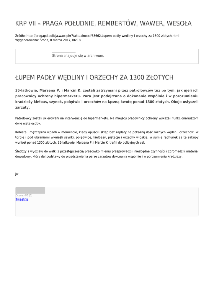 KRP VII – PRAGA POŁUDNIE, REMBERTÓW, WAWER, WESOŁA Źródło: http://pragapd.policja.waw.pl/r7/aktualnosci/68662,Lupem-padly-wedliny-i-orzechy-za-1300-zlotych.html Wygenerowano: Środa, 8 marca 2017, 06:18 Strona znajduje się w archiwum. ŁUPEM PADŁY WĘDLINY I ORZECHY ZA 1300 ZŁOTYCH 35-latkowie, Marzena P. i Marcin K. zostali zatrzymani przez patrolowców tuż po tym, jak ujęli ich pracownicy ochrony hipermarketu. Para jest podejrzana o dokonanie wspólnie i w porozumieniu kradzieży kiełbas, szynek, polędwic i orzechów na łączną kwotę ponad 1300 złotych. Oboje usłyszeli zarzuty. Patrolowcy zostali skierowani na interwencję do hipermarketu. Na miejscu pracownicy ochrony wskazali funkcjonariuszom dwie ujęte osoby. Kobieta i mężczyzna wpadli w momencie, kiedy opuścili sklep bez zapłaty na pokaźną ilość różnych wędlin i orzechów. W torbie i pod ubraniami wynieśli szynki, polędwice, kiełbasy, pistacje i orzechy włoskie, w sumie rachunek za te zakupy wyniósł ponad 1300 złotych. 35-latkowie, Marzena P. i Marcin K. trafili do policyjnych cel. Śledczy z wydziału do walki z przestępczością przeciwko mieniu przeprowadzili niezbędne czynności i zgromadzili materiał dowodowy, który dał podstawy do przedstawienia parze zarzutów dokonania wspólnie i w porozumieniu kradzieży. jw Ocena: 0/5 (0) Tweetnij