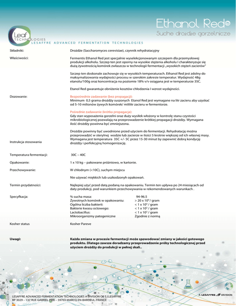 Ethanol Red® Suche drożdże gorzelnicze Składniki: Drożdże (Saccharomyces cerevisiae), czynnik rehydratacyjny Właściwości: Fermentis Ethanol Red jest specjalnie wyselekcjonowanym szczepem dla przemysłowej produkcji alkoholu. Szczep ten jest oporny na wysokie stężenia alkoholu I charakteryzuje się dużą żywotnością komórek zwłaszcza w technologii fermentacji „wysokich stężeń zacierów” Szczep ten doskonale zachowuje się w wysokich temperaturach. Ethanol Red jest zdolny do maksymalizowania wydajności procesu w szerokim zakresie temperatur. Wydajność 48g etanolu/100g oraz koncentracja na poziomie 18% v/v osiągana jest w temperaturze 35C. Etanol Red gwarantuje obniżenie kosztów chłodzenia I wzrost wydajności. Dozowanie: Bezpośrednie zadawanie (bez propagacji): Minimum 0,5 grama drożdży suszonych Etanol Red jest wymagane na litr zacieru aby uzyskać od 5-10 milionów żywych komórek/ mililitr zacieru w fermentorze. Pośrednie zadawanie (krótka propagacja): Gdy stan wyposażenia gorzelni oraz duży wysiłek włożony w kontrolę stanu czystości mikrobiologicznej pozwalają na przeprowadzenie krótkiej propagacji drożdży. Wymagana ilość drożdży powinna być zmniejszona. Instrukcja stosowania Drożdże powinny być uwodnione przed użyciem do fermentacji. Rehydratację można przeprowadzić w sterylnej wodzie lub zacierze w ilości 5 krotnie większej od ich własnej masy. Wymagana jest temperatura 35C +/- 5C przez 15-30 minut by zapewnić dobrą kondycję drożdży i perfekcyjną homogenizację. Temperatura fermentacji: 30C – 40C Opakowanie: 1 x 10 kg – pakowane próżniowo, w kartonie. Przechowywanie: W chłodnym (<10C), suchym miejscu Nie używać miękkich lub uszkodzonyh opakowań. Termin przydatności: Najlepiej użyć przed datą podaną na opakowaniu. Termin ten upływa po 24 miesiącach od daty produkcji, pod warunkiem przechowywania w rekomendowanych warunkach . Specyfkacja: % sucha masa: Żywotnych komórek w opakowaniu: Ogólna liczba bakterii: Bakterie kwasu octowego: Lactobacillus: Mikroorganizmy patogeniczne Kosher status Kosher Pareve Uwagi: Każda zmiana w procesie fermentacji może spowodować zmiany w jakości gotowego produktu. Dlatego zawsze doradzamy przeprowadzenie próby technologicznej przed użyciem drożdży do produkcji w pełnej skali.. LESAFFRE ADVANCED FERMENTATION TECHNOLOGIES A DIVISION OF S.I.LESAFFRE BP 3029 – 137 RUE GABRIEL PERI – 59703 MARCQ-EN-BAROEUL-FRANCE 94-96.5 > 20 x 109 / gram < 1 x 104 / gram < 1 x 103 / gram < 1 x 103 / gram Zgodnie z normą