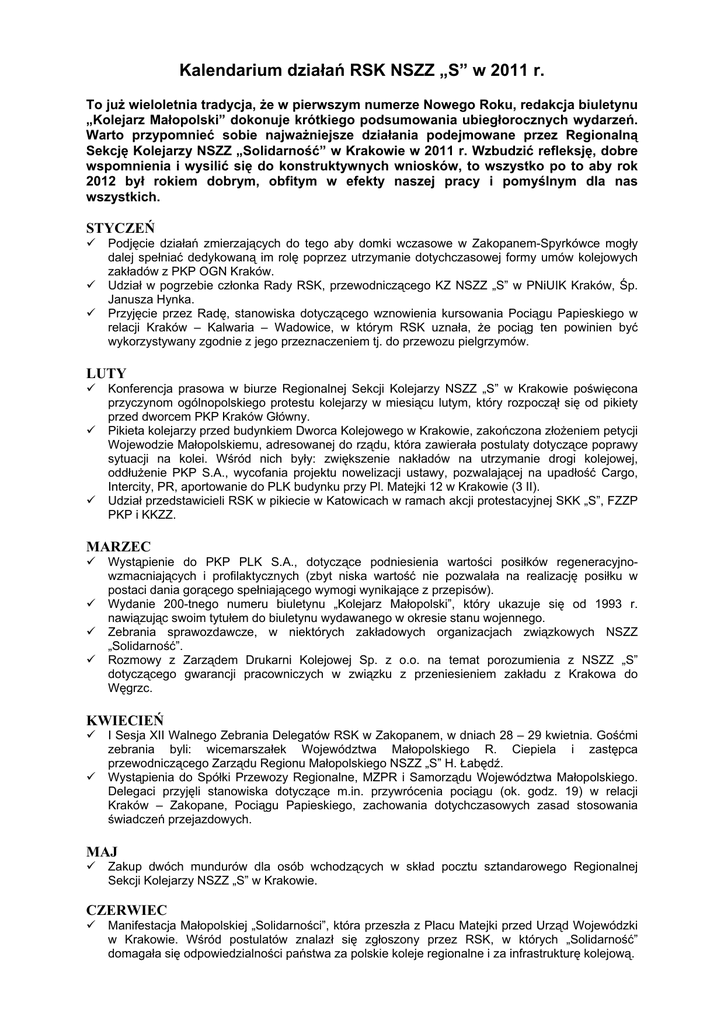 Kalendarium działań RSK NSZZ „S” w 2011 r. To już wieloletnia tradycja, że w pierwszym numerze Nowego Roku, redakcja biuletynu „Kolejarz Małopolski” dokonuje krótkiego podsumowania ubiegłorocznych wydarzeń. Warto przypomnieć sobie najważniejsze działania podejmowane przez Regionalną Sekcję Kolejarzy NSZZ „Solidarność” w Krakowie w 2011 r. Wzbudzić refleksję, dobre wspomnienia i wysilić się do konstruktywnych wniosków, to wszystko po to aby rok 2012 był rokiem dobrym, obfitym w efekty naszej pracy i pomyślnym dla nas wszystkich. STYCZEŃ Podjęcie działań zmierzających do tego aby domki wczasowe w Zakopanem-Spyrkówce mogły dalej spełniać dedykowaną im rolę poprzez utrzymanie dotychczasowej formy umów kolejowych zakładów z PKP OGN Kraków. Udział w pogrzebie członka Rady RSK, przewodniczącego KZ NSZZ „S” w PNiUIK Kraków, Śp. Janusza Hynka. Przyjęcie przez Radę, stanowiska dotyczącego wznowienia kursowania Pociągu Papieskiego w relacji Kraków – Kalwaria – Wadowice, w którym RSK uznała, że pociąg ten powinien być wykorzystywany zgodnie z jego przeznaczeniem tj. do przewozu pielgrzymów. LUTY Konferencja prasowa w biurze Regionalnej Sekcji Kolejarzy NSZZ „S” w Krakowie poświęcona przyczynom ogólnopolskiego protestu kolejarzy w miesiącu lutym, który rozpoczął się od pikiety przed dworcem PKP Kraków Główny. Pikieta kolejarzy przed budynkiem Dworca Kolejowego w Krakowie, zakończona złożeniem petycji Wojewodzie Małopolskiemu, adresowanej do rządu, która zawierała postulaty dotyczące poprawy sytuacji na kolei. Wśród nich były: zwiększenie nakładów na utrzymanie drogi kolejowej, oddłużenie PKP S.A., wycofania projektu nowelizacji ustawy, pozwalającej na upadłość Cargo, Intercity, PR, aportowanie do PLK budynku przy Pl. Matejki 12 w Krakowie (3 II). Udział przedstawicieli RSK w pikiecie w Katowicach w ramach akcji protestacyjnej SKK „S”, FZZP PKP i KKZZ. MARZEC Wystąpienie do PKP PLK S.A., dotyczące podniesienia wartości posiłków regeneracyjnowzmacniających i profilaktycznych (zbyt niska wartość nie pozwalała na realizację posiłku w postaci dania gorącego spełniającego wymogi wynikające z przepisów). Wydanie 200-tnego numeru biuletynu „Kolejarz Małopolski”, który ukazuje się od 1993 r. nawiązując swoim tytułem do biuletynu wydawanego w okresie stanu wojennego. Zebrania sprawozdawcze, w niektórych zakładowych organizacjach związkowych NSZZ „Solidarność”. Rozmowy z Zarządem Drukarni Kolejowej Sp. z o.o. na temat porozumienia z NSZZ „S” dotyczącego gwarancji pracowniczych w związku z przeniesieniem zakładu z Krakowa do Węgrzc. KWIECIEŃ I Sesja XII Walnego Zebrania Delegatów RSK w Zakopanem, w dniach 28 – 29 kwietnia. Gośćmi zebrania byli: wicemarszałek Województwa Małopolskiego R. Ciepiela i zastępca przewodniczącego Zarządu Regionu Małopolskiego NSZZ „S” H. Łabędź. Wystąpienia do Spółki Przewozy Regionalne, MZPR i Samorządu Województwa Małopolskiego. Delegaci przyjęli stanowiska dotyczące m.in. przywrócenia pociągu (ok. godz. 19) w relacji Kraków – Zakopane, Pociągu Papieskiego, zachowania dotychczasowych zasad stosowania świadczeń przejazdowych. MAJ Zakup dwóch mundurów dla osób wchodzących w skład pocztu sztandarowego Regionalnej Sekcji Kolejarzy NSZZ „S” w Krakowie. CZERWIEC Manifestacja Małopolskiej „Solidarności”, która przeszła z Placu Matejki przed Urząd Wojewódzki w Krakowie. Wśród postulatów znalazł się zgłoszony przez RSK, w których „Solidarność” domagała się odpowiedzialności państwa za polskie koleje regionalne i za infrastrukturę kolejową. Zbieranie podpisów pod poparciem dla H. Sikory na kandydata przedstawiciela pracowników w Radzie Nadzorczej PKP S.A. Udział kolejarzy z Małopolski w manifestacji w Warszawie, która odbyła się pod hasłem: „Żądamy zwiększenia płacy minimalnej”. Najliczniejszą liczbę stanowili związkowcy z ZLK Kraków, następnie OGN, ZLK N. Sącz, IC Kraków i MZPR. LIPIEC XII Pielgrzymka Kolejarzy do Sanktuarium Matki Bożej Tuchowskiej w trakcie tradycyjnego odpustu. Uczestnictwo delegacji RSK w uroczystych obchodach rocznicy strajku kolejarzy w Lublinie. Dwugodzinny Strajk Ostrzegawczy pracowników Spółki Przewozy Regionalne na terenie Małopolski. Wystąpienie do Ministra Infrastruktury, dotyczące uznania przez rząd i Komisję Europejską, budowy linii kolejowej z Podłęża do Piekiełka, jako kluczowej inwestycji dla naszego kraju ale także dla europejskiego systemu transportowego (Morze Bałtyckie – Morze Czarne). Wystąpienie do Marszałka Województwa Małopolskiego w sprawie współfinansowania modernizacji linii kolejowej Trzebinia – Chrzanów – Libiąż, co jest niezbędne z uwagi na pogarszający się jej stan techniczny. SIERPIEŃ 24-godzinny strajk pracowników Małopolskiego Zakładu Przewozów Regionalnych, którego postulatem była podwyżka wynagrodzeń. Doprowadził on w konsekwencji do podpisania porozumienia płacowego z Zarządem Spółki Przewozy Regionalne na mocy, którego średnia podwyżka na pracownika wyniosła 150 zł. Wyprodukowanie maskotek z nazwą Regionalnej Sekcji Kolejarzy NSZZ „Solidarność”. WRZESIEŃ Wyprodukowano kurtki przeciwdeszczowe z logo RSK NSZZ „S” oraz SKK, ZR Małopolski i BWT „Koltur” z przeznaczeniem głównie dla zawodników biorących udział w Turnieju w Barcicach. XII Turniej Piłki Nożnej o Puchar Przewodniczącego RSK na stadionie w Barcicach, w którym wzięło udział 13 drużyn z kolejowych zakładów pracy (blisko 800 kolejarzy). Wygrała drużyna Zakładu Maszyn Torowych, przed ZLK Kraków. Trzecie miejsce zajęły SOK i ZLK w Nowym Sączu. Zorganizowano w trakcie trwania turnieju piłkarskiego w Barcicach, loterię charytatywną (gadżety m.in. z PLK, Cargo, IC, Energetyki, RSK), z której dochód przeznaczono dla p. Janiny Dudzik (ZLK N. S