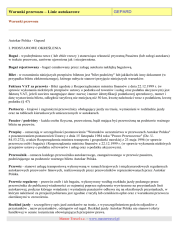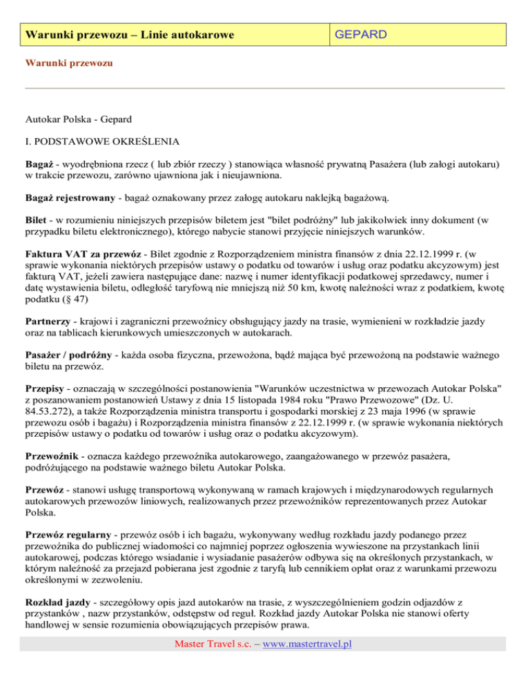 Warunki przewozu – Linie autokarowe GEPARD Warunki przewozu Autokar Polska - Gepard I. PODSTAWOWE OKREŚLENIA Bagaż - wyodrębniona rzecz ( lub zbiór rzeczy ) stanowiąca własność prywatną Pasażera (lub załogi autokaru) w trakcie przewozu, zarówno ujawniona jak i nieujawniona. Bagaż rejestrowany - bagaż oznakowany przez załogę autokaru naklejką bagażową. Bilet - w rozumieniu niniejszych przepisów biletem jest "bilet podróżny" lub jakikolwiek inny dokument (w przypadku biletu elektronicznego), którego nabycie stanowi przyjęcie niniejszych warunków. Faktura VAT za przewóz - Bilet zgodnie z Rozporządzeniem ministra finansów z dnia 22.12.1999 r. (w sprawie wykonania niektórych przepisów ustawy o podatku od towarów i usług oraz podatku akcyzowym) jest fakturą VAT, jeżeli zawiera następujące dane: nazwę i numer identyfikacji podatkowej sprzedawcy, numer i datę wystawienia biletu, odległość taryfową nie mniejszą niż 50 km, kwotę należności wraz z podatkiem, kwotę podatku (§ 47) Partnerzy - krajowi i zagraniczni przewoźnicy obsługujący jazdy na trasie, wymienieni w rozkładzie jazdy oraz na tablicach kierunkowych umieszczonych w autokarach. Pasażer / podróżny - każda osoba fizyczna, przewożona, bądź mająca być przewożoną na podstawie ważnego biletu na przewóz. Przepisy - oznaczają w szczególności postanowienia "Warunków uczestnictwa w przewozach Autokar Polska" z poszanowaniem postanowień Ustawy z dnia 15 listopada 1984 roku "Prawo Przewozowe" (Dz. U. 84.53.272), a także Rozporządzenia ministra transportu i gospodarki morskiej z 23 maja 1996 (w sprawie przewozu osób i bagażu) i Rozporządzenia ministra finansów z 22.12.1999 r. (w sprawie wykonania niektórych przepisów ustawy o podatku od towarów i usług oraz o podatku akcyzowym). Przewoźnik - oznacza każdego przewoźnika autokarowego, zaangażowanego w przewóz pasażera, podróżującego na podstawie ważnego biletu Autokar Polska. Przewóz - stanowi usługę transportową wykonywaną w ramach krajowych i międzynarodowych regularnych autokarowych przewozów liniowych, realizowanych przez przewoźników reprezentowanych przez Autokar Polska. Przewóz regularny - przewóz osób i ich bagażu, wykonywany według rozkładu jazdy podanego przez przewoźnika do publicznej wiadomości co najmniej poprzez ogłoszenia wywieszone na przystankach linii autokarowej, podczas którego wsiadanie i wysiadanie pasażerów odbywa się na określonych przystankach, w którym należność za przejazd pobierana jest zgodnie z taryfą lub cennikiem opłat oraz z warunkami przewozu określonymi w zezwoleniu. Rozkład jazdy - szczegółowy opis jazd autokarów na trasie, z wyszczególnieniem godzin odjazdów z przystanków , nazw przystanków, odstępstw od reguł. Rozkład jazdy Autokar Polska nie stanowi oferty handlowej w sensie rozumienia obowiązujących przepisów prawa. Master Travel s.c. – www.mastertravel.pl Warunki przewozu – Linie autokarowe GEPARD Umowa o przewóz - umowa jaka zostaje nawiązana między przewoźnikiem a Pasażerem przez fakt zakupu biletu Autokar Polska, na podstawie której przewoźnik zobowiązuje się za wynagrodzeniem (należnością za bilet) przewieźć Pasażera do umówionego miejsca. Odstępstwa od reguł opisanych w niniejszych warunkach zamieszczone są w obowiązującym Rozkładzie jazdy bądź innych dokumentach, dostępnych w punktach zakupu biletów. II. WYKONANIE PRZEWOZU 1) Obsługa międzynarodowych przewozów na wybranych liniach może odbywać się przy udziale firm partnerskich - przewozy międzynarodowe mogą obsługiwać zarówno polscy jak i zagraniczni przewoźnicy. Przewoźnicy obsługujący linie oraz ich firmy partnerskie wymienione są w obowiązującym rozkładzie jazdy Autokar Polska. 2) Jazdę na trasie może wykonać zastępczo pojazd inny niż przewoźnika bądź firm partnerskich podanych w rozkładzie jazdy, przy czym każdorazowym wyróżnikiem pojazdu wykonującego jazdę na trasie jest tablica za przednią szybą z wypisanym numerem lub nazwą linii, nazwą miejscowości docelowej i nazwami firm realizujących jazdy na trasie. 3) W autokarach obowiązuje zakaz palenia tytoniu oraz spożywania napojów alkoholowych oraz środków o działaniu podobnym, takich jak narkotyki, środki odurzające. Używanie telefonów komórkowych w trakcie jazdy może być zabronione przez personel autokaru. 4) Przewoźnik zastrzega sobie prawo do odmowy przewozu oraz zatrzymania biletu osoby, która weszła w jego posiadanie z naruszeniem prawa lub która nie jest w stanie wykazać, że jest osobą, której nazwisko zostało wpisane w bilecie. III. OBOWIĄZKI PASAŻERA 1) Dokonanie zakupu biletu Autokar Polska na przewóz oznacza przyjęcie niniejszych warunków uczestnictywa oraz zawarcie umowy na przewóz, której stronami są Pasażer oraz przewoźnik, wyszczególniony w bilecie. 2) Podróżny jest obowiązany do przestrzegania przepisów porządkowych obowiązujących podczas przejazdu. 3) Pasażer winien stosować się do wszelkich związanych z podróżą wymagań, przedstawić ważne dokumenty wjazdowe, wyjazdowe i inne uprawniające do odbycia podróży (paszport, wizy, świadectwa szczepień). 4) Pasażer ma obowiązek posiadać ważny bilet na przejazd oraz dokumenty potwierdzające prawidłowość zastosowanych zniżek. Pasażer ponosi całkowitą odpowiedzialność za posiadanie ważnych dokumentów. 5) O ile przepisy kraju docelowego i krajów tranzytowych podróży, lub zapisy w uwagach opublikowanego rozkładu jazdy linii nie stanowią inaczej: - dzieci do 12 roku życia muszą podróżować pod opieką osoby dorosłej. W przypadku, gdy dorosły nie jest rodzicem bądź prawnym opiekunem, konieczne jest posiadanie przez niepełnoletniego "Upoważnienia do przewozu osoby niepełnoletniej" wystawionego i wydanego wraz z biletem przez sprzedawcę. Master Travel s.c. – www.mastertravel.pl Warunki przewozu – Linie autokaro