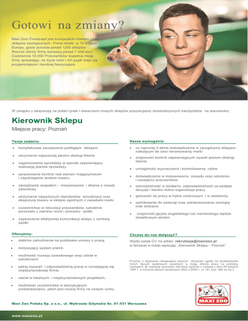 Gotowi na zmiany? Maxi Zoo/ Fressnapf jest europejskim liderem rynku sklepów zoologicznych. Firma działa w 12 krajach Europy, gdzie posiada ponad 1200 sklepów. Roczne obroty firmy wynoszą ponad 1 mld euro. Codziennie 10.000 Pracowników wypełnia misję firmy sprawiając, że życie ludzi i ich pupili staje się przyjemniejsze i bardziej fascynujące. W związku z ekspansją na polski rynek i otwarciami nowych sklepów poszukujemy doświadczonych kandydatów na stanowisko: Kierownik Sklepu Miejsce pracy: Poznań Twoje zadania: Nasze wymagania: kompleksowe zarzadzanie podległym sklepem co najmniej 3-letnie doświadczenie w zarządzaniu sklepem należącym do sieci renomowanej marki utrzymanie najwyższej jakości obsługi klienta organizowanie sprzedaży w sposób zapewniający realizację planów sprzedaży znajomość technik zapewniających wysoki poziom obsługi klienta umiejętność wyznaczania i kontrolowania celów sprawowanie kontroli nad stanem magazynowym i zapobieganie stratom towaru doświadczenie w motywowaniu zespołu oraz szkoleniu i rozwijaniu pracowników zarządzanie zespołem − motywowanie i dbanie o rozwój zawodowy samodzielność w działaniu, odpowiedzialność za podjęte decyzje i bardzo dobra organizacja pracy utrzymanie najwyższych standardów wizualizacji oraz ekspozycji towaru w sklepie zgodnych z zasadami marki gotowość do pracy w trybie zmianowym i w weekendy uczestnictwo w rekrutacji pracowników, szkolenie personelu z zakresu norm i procedur spółki zamiłowanie do zwierząt oraz zainteresowanie zoologią mile widziane zapewnienie efektywnej komunikacji sklepu z centralą spółki znajomość języka angielskiego lub niemieckiego będzie dodatkowym atutem Oferujemy: Chcesz do nas dołączyć? stabilne zatrudnienie na podstawie umowy o pracę, motywujący system premii, Wyślij swoje CV na adres: [email protected] w temacie e-maila wpisując „Kierownik Sklepu - Poznań” możliwość rozwoju zawodowego oraz udział w szkoleniach pełną wyzwań i odpowiedzialną pracę w rozwijającej się międzynarodowej firmie, udział w lokalnych i międzynarodowych projektach, możliwość uczestnictwa w ekscytującym przedsięwzięciu, jakim jest rozwój firmy na nowym rynku. Prosimy o dopisanie następującej klauzuli: „Wyrażam zgodę na przetwarzanie moich danych osobowych zawartych w mojej ofercie pracy na potrzeby niezbędne do realizacji procesów rekrutacji zgodnie z Ustawą z dnia 29 sierpnia 1997 r. o ochronie danych osobowych (DzU z 2002 r. nr 101, poz. 926 ze zm.)“. Maxi Zoo Polska Sp. z o.o., ul. Wybrzeże Gdyńskie 6c, 01-531 Warszawa www.maxizoo.pl www.fressnapf.de/karriere