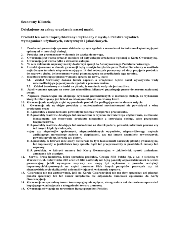 Szanowny Kliencie, Dziękujemy za zakup urządzenia naszej marki. Produkt ten został zaprojektowany i wykonany z myślą o Państwa wysokich wymaganiach użytkowych, estetycznych i jakościowych. 1. 2. 3. 4. 5. 6. 7. 8. 9. 10. 11. 12. 13. 14. 15. Producent gwarantuje sprawne działanie sprzętu zgodnie z warunkami techniczno-eksploatacyjnymi opisanymi w instrukcji obsługi. Produkt jest przeznaczony wyłącznie do użytku domowego. Gwarancja jest ważna przez 24 miesiące od daty zakupu urządzenia wpisanej w Kartę Gwarancyjną. Gwarancja jest ważna tylko z dowodem zakupu. W celu dokonania naprawy należy dostarczyć sprzęt do Autoryzowanego Punktu Serwisowego. Usterki ujawnione w okresie gwarancji będą usunięte bezpłatnie przez Zakład Serwisowy w możliwie najkrótszym terminie nieprzekraczającym 14 dni roboczych począwszy od daty przyjęcia produktu do naprawy chyba, że konsument wyrazi pisemną zgodę na przedłużenie tego terminu. Klientowi przysługuje prawo wymiany sprzętu na nowy, jeżeli: 7.1. Zakład Serwisowy dokona trzech napraw, a urządzenie będzie nadal wykazywało wady uniemożliwiające jego używanie zgodnie z przeznaczeniem, 7.2. Zakład Serwisowy stwierdzi na piśmie, że usunięcie wady nie jest możliwe. Jeżeli wymiana sprzętu na nowy jest niemożliwa, klientowi przysługuje prawo do zwrotu zapłaconej kwoty. Naprawa gwarancyjna nie obejmuje czynności przewidzianych w instrukcji obsługi, do wykonania których zobowiązany jest Klient we własnym zakresie i na własny koszt. Gwarancją nie są objęte części wyposażenia produktów podlegające naturalnemu zużyciu. Gwarancją nie są objęte produkty z uszkodzeniami mechanicznymi nie powstałymi z winy producenta oraz: 11.1. produkty z uszkodzeniami powstałymi podczas transportu i przeładunku, 11.2. produkty wadliwie działające lub uszkodzone w wyniku niewłaściwego użytkowania, niedbałości Konsumenta lub stosowania produktu niezgodnie z instrukcją obsługi, albo przepisami bezpieczeństwa, 11.3. produkty wadliwie działające lub uszkodzone na skutek pożaru, powodzi, uderzenia pioruna czy też innych klęsk żywiołowych, wojny czy niepokojów społecznych, nieprzewidzianych wypadków, nieprawidłowego napięcia zasilającego, normalnego zużycia w eksploatacji, czy też innych czynników zewnętrznych, powodujących np. korozję czy plamy, 11.4. produkty, w których inne osoby niż Serwis (w tym Konsument) naruszyły plombę gwarancyjną, lub ingerowały w jakikolwiek inny sposób, bądź też przeprowadziły w produktach zmiany lub naprawy, 11.5. produkty, w których numery lub Kartę Gwarancyjną w jakikolwiek sposób zmieniono, zamazano lub usunięto. Serwis, firma handlowa, która sprzedała produkty, Groupe SEB Polska Sp. z o.o. z siedzibą w Warszawie, ul. Bukowińska 22B oraz ich filie i oddziały nie będą ponosiły odpowiedzialności za serwis gwarancyjny, jeżeli wymagane naprawy nie mogą być wykonane z powodu restrykcji importowych/eksportowych na części zamienne i/lub innych przepisów prawnych czy też nieprzewidzianych okoliczności uniemożliwiających wykonanie naprawy. Gwarancja nie ma zastosowania, jeśli na Karcie Gwarancyjnej nie ma daty sprzedaży ani pieczęci punktu sprzedaży lub też numer urządzenia nie odpowiada numerowi wpisanemu do Karty Gwarancyjnej. Gwarancja na sprzedany towar konsumpcyjny nie wyłącza, nie ogranicza ani nie zawiesza uprawnień kupującego wynikających z niezgodności towaru z umową. Gwarancja obwiązuje na terytorium Rzeczypospolitej Polskiej.