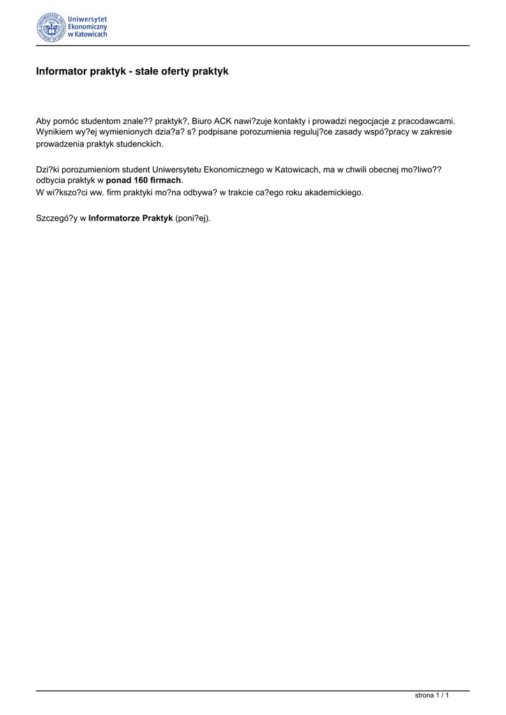Informator praktyk - stałe oferty praktyk Aby pomóc studentom znale?? praktyk?, Biuro ACK nawi?zuje kontakty i prowadzi negocjacje z pracodawcami. Wynikiem wy?ej wymienionych dzia?a? s? podpisane porozumienia reguluj?ce zasady wspó?pracy w zakresie prowadzenia praktyk studenckich. Dzi?ki porozumieniom student Uniwersytetu Ekonomicznego w Katowicach, ma w chwili obecnej mo?liwo?? odbycia praktyk w ponad 160 firmach. W wi?kszo?ci ww. firm praktyki mo?na odbywa? w trakcie ca?ego roku akademickiego. Szczegó?y w Informatorze Praktyk (poni?ej). strona 1 / 1