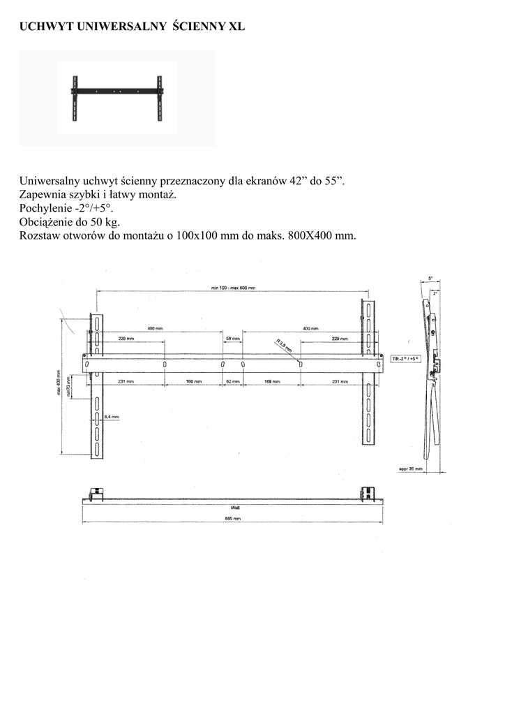 UCHWYT UNIWERSALNY ŚCIENNY XL Uniwersalny uchwyt ścienny przeznaczony dla ekranów 42” do 55”. Zapewnia szybki i łatwy montaŜ. Pochylenie -2°/+5°. ObciąŜenie do 50 kg. Rozstaw otworów do montaŜu o 100x100 mm do maks. 800X400 mm.