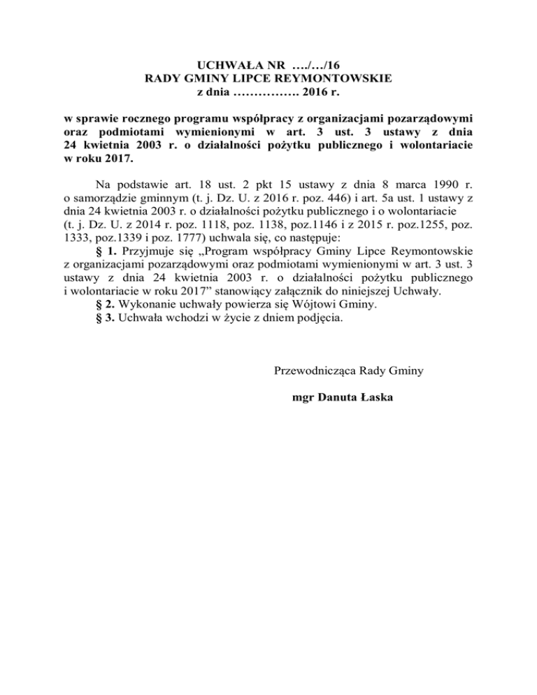 UCHWAŁA NR …./…/16 RADY GMINY LIPCE REYMONTOWSKIE z dnia ……………. 2016 r. w sprawie rocznego programu współpracy z organizacjami pozarządowymi oraz podmiotami wymienionymi w art. 3 ust. 3 ustawy z dnia 24 kwietnia 2003 r. o działalności pożytku publicznego i wolontariacie w roku 2017. Na podstawie art. 18 ust. 2 pkt 15 ustawy z dnia 8 marca 1990 r. o samorządzie gminnym (t. j. Dz. U. z 2016 r. poz. 446) i art. 5a ust. 1 ustawy z dnia 24 kwietnia 2003 r. o działalności pożytku publicznego i o wolontariacie (t. j. Dz. U. z 2014 r. poz. 1118, poz. 1138, poz.1146 i z 2015 r. poz.1255, poz. 1333, poz.1339 i poz. 1777) uchwala się, co następuje: § 1. Przyjmuje się „Program współpracy Gminy Lipce Reymontowskie z organizacjami pozarządowymi oraz podmiotami wymienionymi w art. 3 ust. 3 ustawy z dnia 24 kwietnia 2003 r. o działalności pożytku publicznego i wolontariacie w roku 2017” stanowiący załącznik do niniejszej Uchwały. § 2. Wykonanie uchwały powierza się Wójtowi Gminy. § 3. Uchwała wchodzi w życie z dniem podjęcia. Przewodnicząca Rady Gminy mgr Danuta Łaska Załącznik do Uchwały Nr …. /…/16 Rady Gminy Lipce Reymontowskie z dnia ………………… 2016 r. PROGRAM WSPÓŁPRACY GMINY LIPCE REYMONTOWSKIE Z ORGANIZACJAMI POZARZĄDOWYMI ORAZ PODMIOTAMI WYMIENIONYMI W ART. 3 UST. 3 USTAWY Z DNIA 24 KWIETNIA 2003 ROKU O DZIAŁALNOŚCI POŻYTKU PUBLICZNEGO I O WOLONTARIACIE W ROKU 2017 Rozdział I Postanowienia ogólne 1. Ilekroć w Programie jest mowa o: a) „ustawie” – rozumie się przez to ustawę z dnia 24 kwietnia 2003 r. o działalności pożytku publicznego i o wolontariacie (tj. Dz. U. z 2014 r. poz.1118 z późn. zm.), b) Programie” - rozumie się przez to roczny program współpracy gminy Lipce Reymontowskie z organizacjami pozarządowymi oraz podmiotami wymienionymi w art. 3 ust. 3 ustawy z dnia 24 kwietnia 2003 roku o działalności pożytku publicznego i o wolontariacie, c) „organizacji” – rozumie się przez to organizacje pozarządowe, osoby prawne i jednostki organizacyjne, o których mowa w art. 3 ust. 3 ustawy z dnia 24 kwietnia 2003 roku o działalności pożytku publicznego i o wolontariacie, d) „Gminie” - rozumie się przez to Gminę Lipce Reymontowskie e) „Wójcie Gminy” – rozumie się przez to Wójta Gminy Lipce Reymontowskie, f) „Radzie Gminy” – rozumie się przez to Radę Gminy Lipce Reymontowskie. 2. Program określa cele, formy, zasady i zakres współpracy organów samorządowych Gminy z organizacjami, a także priorytety zadań publicznych, których realizacja będzie związana z udzieleniem pomocy publicznej. Rozdział II Cel główny i cele szczegółowe programu 1. Głównym celem programu jest zaspokajanie potrzeb społecznych mieszkańców Gminy oraz wzmocnienie rozwoju społeczeństwa obywatelskiego poprzez budowanie i umacnianie partnerstwa pomiędzy samorządem Gminy a organizacjami. 2. Cele szczegółowe programu to: a) umacnianie w świadomości społecznej poczucia odpowiedzialności za siebie, swoje otoczenie, wspólnotę lokalną oraz jej tradycje, b) wspólne diagnozowanie potrzeb społeczności lokalnej, c) tworzenie warunków do zwiększenia aktywności społecznej mieszkańców oraz społeczeństwa obywatelskiego, d) promowanie programów realizowanych przez organizacje pozarządowe oraz podmioty prowadzące działalność pożytku publicznego, e) zaangażowanie mieszkańców gminy w rozwiązywanie problemów lokalnych. Rozdział III Zasady współpracy 1. Współpraca Gminy z organizacjami odbywać się będzie na zasadach: a) pomocniczości co oznacza, że samorząd Gminy powierzać będzie realizację swoich zadań publicznych organizacjom, które wykonają je w sposób terminowy, profesjonalny, efektywny, oszczędny, b) suwerenności stron, co oznacza, że stosunki pomiędzy samorządem Gminy, a organizacjami kształtowane będą z poszanowaniem wzajemnej autonomii i niezależności w swojej działalności statutowej, c) partnerstwa, co oznacza, że samorząd gwarantuje organizacjom m.in. udział w planowaniu priorytetów realizowanych przez Gminę , określaniu sposobu ich realizacji, rozeznawaniu i definiowaniu problemów mieszkańców gminy, sugerowaniu zakresu współpracy, d) efektywności, co oznacza, że samorząd Gminy i organizacje wspólnie dążyć będą do osiągnięcia jak najlepszych rezultatów podczas wykonywania zadań publicznych, e) uczciwej konkurencji i jawności, co oznacza, że samorząd Gminy udostępni organizacjom informacje o środkach finansowych zaplanowanych w budżecie Gminy na współpracę z nimi oraz kryteriach i sposobie oceny projektów, a organizacje udostępnią samorządowi m.in. dane dotyczące swojej struktury organizacyjnej, sposobu funkcjonowania, rezultatów prowadzenia dotychczasowej działalności oraz sytuacji finansowej. 2. Zlecenie realizacji zadań przez samorząd Gminy organizacjom obejmuje w pierwszej kolejności zadania, które Program określa jako zadania priorytetowe. Zlecanie to odbywa się po przeprowadzeniu otwartego konkursu ofert, chyba, że przepisy odrębne przewidują inny tryb zlecenia. 3. Otwarte konkursy ofert są ogłaszane i przeprowadzane w oparciu o przepisy ustawy oraz wydanych na jej podstawie przepisów wykonawczych i przepisów właściwego organu samorządu Gminy. Rozdział IV Zakres przedmiotowy Współpraca Gminy z organizacjami dotyczy realizacji zadań publicznych określonych w art. 4 ustawy, w zakresie odpowiadającym zadaniom Gminy. Rozdział V Formy współpracy 1. Współpraca gminy z organizacjami ma charakter finansowy i pozafinansowy. 2. Do finansowych form współpracy zalicza się: a) powierzanie wykonania zadań publicznych wraz z udzieleniem dotacji na finansowanie ich realizacji, b) wspieranie wykonywania zadań publicznych poprzez udzielanie dotacji na współfinansowanie ich realizacji. 3. Do pozafinansowych form współpracy zalicza się: a) wzajemne informowanie się 