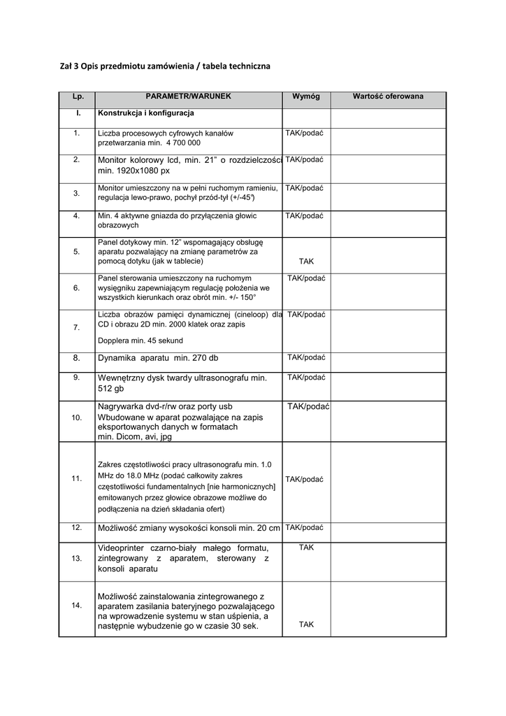 Zał 3 Opis przedmiotu zamówienia / tabela techniczna Lp. I. PARAMETR/WARUNEK Wymóg Konstrukcja i konfiguracja 1. Liczba procesowych cyfrowych kanałów przetwarzania min. 4 700 000 2. Monitor kolorowy lcd, min. 21” o rozdzielczości TAK/podać min. 1920x1080 px 3. 4. 5. 6. 7. TAK/podać Monitor umieszczony na w pełni ruchomym ramieniu, TAK/podać regulacja lewo-prawo, pochył przód-tył (+/-45°) Min. 4 aktywne gniazda do przyłączenia głowic obrazowych Panel dotykowy min. 12” wspomagający obsługę aparatu pozwalający na zmianę parametrów za pomocą dotyku (jak w tablecie) Panel sterowania umieszczony na ruchomym wysięgniku zapewniającym regulację połoŜenia we wszystkich kierunkach oraz obrót min. +/- 150° TAK/podać TAK TAK/podać Liczba obrazów pamięci dynamicznej (cineloop) dla TAK/podać CD i obrazu 2D min. 2000 klatek oraz zapis Dopplera min. 45 sekund 8. Dynamika aparatu min. 270 db TAK/podać 9. Wewnętrzny dysk twardy ultrasonografu min. 512 gb TAK/podać Nagrywarka dvd-r/rw oraz porty usb Wbudowane w aparat pozwalające na zapis eksportowanych danych w formatach min. Dicom, avi, jpg TAK/podać 10. 11. Zakres częstotliwości pracy ultrasonografu min. 1.0 MHz do 18.0 MHz (podać całkowity zakres częstotliwości fundamentalnych [nie harmonicznych] emitowanych przez głowice obrazowe moŜliwe do podłączenia na dzień składania ofert) TAK/podać 12. MoŜliwość zmiany wysokości konsoli min. 20 cm TAK/podać 13. Videoprinter czarno-biały małego formatu, zintegrowany z aparatem, sterowany z konsoli aparatu 14. MoŜliwość zainstalowania zintegrowanego z aparatem zasilania bateryjnego pozwalającego na wprowadzenie systemu w stan uśpienia, a następnie wybudzenie go w czasie 30 sek. TAK TAK Wartość oferowana II. Obrazowanie i prezentacja obrazu 1. Zakres głębokości penetracji do min. 30 cm 2. Obrazowanie harmoniczne TAK 3. Obrazowanie harmoniczne z odwróceniem impulsu (tzw. inwersja fazy) TAK 4. Częstotliwość odświeŜania obrazu 2D min. 1400 Hz TAK/podać 5. Obrazowanie trapezoidalne na głowicach liniowych TAK 6. Doppler pulsacyjny (PWD) rejestrowane prędkości maksymalne (przy zerowym kącie bramki) min. od 8,2m/s do 0 oraz od 0 do +8,2 m/s; Color Doppler (CD) rejestrowane prędkości maksymalne min. -300 cm/s do 0 oraz 0 do +300 cm/s. TAK/podać TAK/podać 7. Doppler kolorowy oraz spektralny TAK 8. Power Doppler (PD); Power Doppler z oznaczeniem kierunku przepływu TAK 9. Regulacja wielkości bramki Dopplerowskiej (SV) min. 0,5-20 mm TAK/podać 10. Tryb Triplex (B+ CD/PD + PWD) TAK 11. Jednoczesne wyświetlanie na ekranie dwóch obrazów w czasie rzeczywistym jeden standardowy B-mode drugi obraz B-mode + Color Doppler TAK 12. Specjalistyczne oprogramowanie wraz z pełnymi pakietami pomiarowymi do badań min.: naczyniowych (w tym TCD), radiologicznych ( jama brzuszna, narządy powierzchniowe), TAK/podać III. Funkcje uŜytkowe 1. Powiększenie obrazu w czasie rzeczywistym min. 8x 2. Automatyczna optymalizacja obrazu 2D przy pomocy jednego przycisku (m.in. automatyczne dopasowanie TAK/opisać wzmocnienia obrazu) 3. Praca w trybie wielokierunkowego emitowania i składania wiązki ultradźwiękowej z głowic w pełni elektronicznych, z min. 9 kątami emitowania wiązki tworzącymi obraz 2D na wszystkich zaoferowanych głowicach typu convex oraz liniowych. Wymóg pracy dla trybu 2D oraz w trybie obrazowania harmonicznego 4. TAK/podać Adaptacyjne przetwarzanie obrazu redukujące artefakty i szumy, np. SRI lub równowaŜne TAK/opisać TAK/podać 5. 6. Automatyczny obrys spektrum i wyznaczanie parametrów przepływu na zatrzymanym spektrum oraz w czasie rzeczywistym na ruchomym spektrum (min. S, D, PI,RI, HR) TAK/opisać MoŜliwość przesunięcia linii bazowej na zatrzymanym spektrum dopplera TAK 7. MoŜliwość zaprogramowania w aparacie Nowych pomiarów oraz kalkulacji w Aplikacjach TAK 8. Pomiar odległości, min. 8 pomiarów TAK 9. Pomiar obwodu, pola powierzchni, objętości TAK IV. Głowice ultradźwiękowe 1. Głowica convex (min. 380 elementów TAK, Podać typ i akustycznych); szerokopasmowa o zakresie częstotliwości (emitowanych) min. 2.0 – 6.0 MHz, Kąt parametry widzenia min. 70°; Mo Ŝliwość zastosowania przystawki biopsyjnej, obrazowanie harmoniczne 2. Głowica liniowa szerokopasmowa o zakresie TAK, Podać typ i częstotliwości emitowanych min. 4.0 – 12.0 MHz; parametry obrazowanie harmoniczne; liczba elementów akustycznych min. 250; Długość czoła głowicy (FOV) max. 39 mm MoŜliwość zastosowania przystawki biopsyjnej V. 1. 2. MoŜliwość rozbudowy systemu dostępna na dzień składania oferty Głowica endowaginalna do badań ginekologiczno- TAK, Podać połoŜniczych (min. 250 elementów akustycznych); typ i parametry szerokopasmowa o zakresie częstotliwości (emitowanych) min. 4.0 – 9.0 MHz; Kąt widzenia min. 180°; Mo Ŝliwość zastosowania metalowej przystawki biopsyjnej; obrazowanie harmoniczne Głowica sektorowa pediatryczna TAK, Podać typ i szerokopasmowa, o zakresie częstotliwości parametry emitowanych min. 3.0 MHz -8.0 MHz; obrazowanie harmoniczne; kąt widzenia min. 90°; (ilo ść elementów min. 90) Tryby pracy min. 2D, Color Doppler, PW Doppler, 3. Głowica liniowa szerokopasmowa o zakresie częstotliwości emitowanych min. 5.0 – 12.0 MHz; obrazowanie harmoniczne, liczba elementów akustycznych min. 500; Długość czoła głowicy (FOV) min. 48 mm TAK, Podać typ i parametry MoŜliwość zastosowania przystawki biopsyjnej 4. Głowica sektorowa neonatologiczna szerokoTAK, Podać pasmowa, o zakresie częstotliwości emitowanych min. typ i parametry, 4.0 MHz -12.0 MHz; obrazowanie harmoniczne; kąt widzenia min. 90°; (ilo ść elementów min. 90) Tryby pracy min. 2D, Color Doppler, PW Doppler 5. 6. 7. 8. 9. MoŜliwość rozbudowy o głowicę przezprzełykową matrycową; zakres pracy min. 2-7 MHz, min. 2500 elementów, obrazowanie harmoniczne TAK, Po- MoŜliwość rozbudowy o głowicę przez