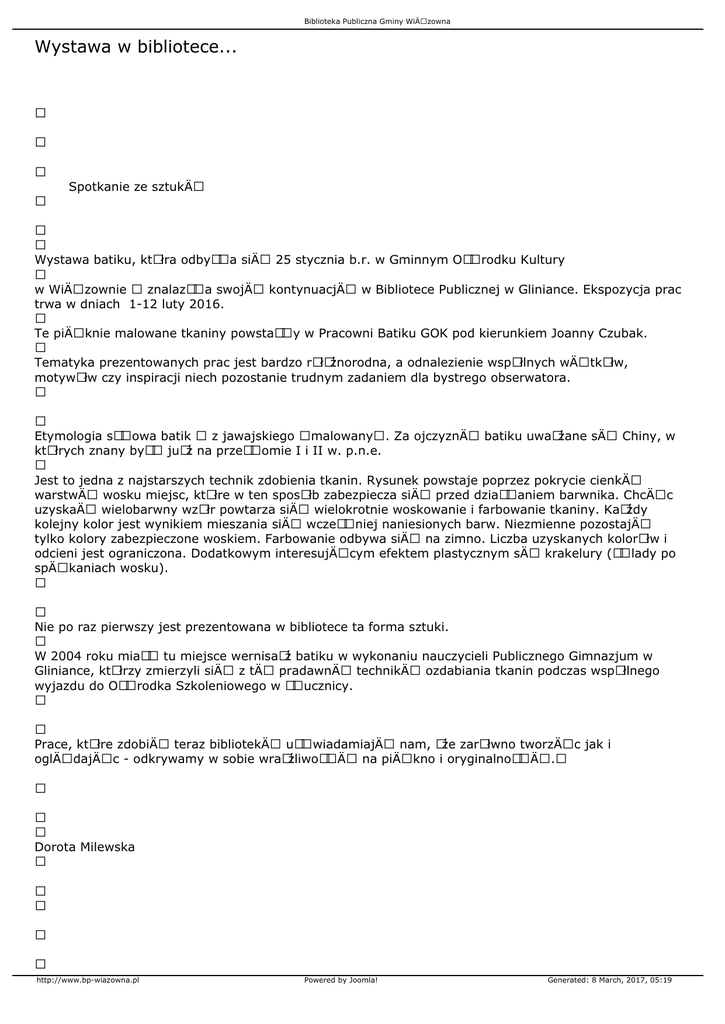 Biblioteka Publiczna Gminy WiÄ…zowna Wystawa w bibliotece... Spotkanie ze sztukÄ… Wystawa batiku, ktÃłra odbyÅ‚a siÄ™ 25 stycznia b.r. w Gminnym OÅ›rodku Kultury w WiÄ…zownie znalazÅ‚a swojÄ… kontynuacjÄ™ w Bibliotece Publicznej w Gliniance. Ekspozycja prac trwa w dniach 1-12 luty 2016. Te piÄ™knie malowane tkaniny powstaÅ‚y w Pracowni Batiku GOK pod kierunkiem Joanny Czubak. Tematyka prezentowanych prac jest bardzo rÃłÅźnorodna, a odnalezienie wspÃłlnych wÄ…tkÃłw, motywÃłw czy inspiracji niech pozostanie trudnym zadaniem dla bystrego obserwatora. Etymologia sÅ‚owa batik z jawajskiego malowany. Za ojczyznÄ™ batiku uwaÅźane sÄ… Chiny, w ktÃłrych znany byÅ‚ juÅź na przeÅ‚omie I i II w. p.n.e. Jest to jedna z najstarszych technik zdobienia tkanin. Rysunek powstaje poprzez pokrycie cienkÄ… warstwÄ… wosku miejsc, ktÃłre w ten sposÃłb zabezpiecza siÄ™ przed dziaÅ‚aniem barwnika. ChcÄ…c uzyskać wielobarwny wzÃłr powtarza siÄ™ wielokrotnie woskowanie i farbowanie tkaniny. KaÅźdy kolejny kolor jest wynikiem mieszania siÄ™ wczeÅ›niej naniesionych barw. Niezmienne pozostajÄ… tylko kolory zabezpieczone woskiem. Farbowanie odbywa siÄ™ na zimno. Liczba uzyskanych kolorÃłw i odcieni jest ograniczona. Dodatkowym interesujÄ…cym efektem plastycznym sÄ… krakelury (Å›lady po spÄ™kaniach wosku). Nie po raz pierwszy jest prezentowana w bibliotece ta forma sztuki. W 2004 roku miaÅ‚ tu miejsce wernisaÅź batiku w wykonaniu nauczycieli Publicznego Gimnazjum w Gliniance, ktÃłrzy zmierzyli siÄ™ z tÄ… pradawnÄ… technikÄ… ozdabiania tkanin podczas wspÃłlnego wyjazdu do OÅ›rodka Szkoleniowego w Å•ucznicy. Prace, ktÃłre zdobiÄ… teraz bibliotekÄ™ uÅ›wiadamiajÄ… nam, Åźe zarÃłwno tworzÄ…c jak i oglÄ…dajÄ…c - odkrywamy w sobie wraÅźliwość na piÄ™kno i oryginalność. Dorota Milewska http://www.bp-wiazowna.pl Powered by Joomla! Generated: 8 March, 2017, 05:19 Biblioteka Publiczna Gminy WiÄ…zowna http://www.bp-wiazowna.pl Powered by Joomla! Generated: 8 March, 2017, 05:19