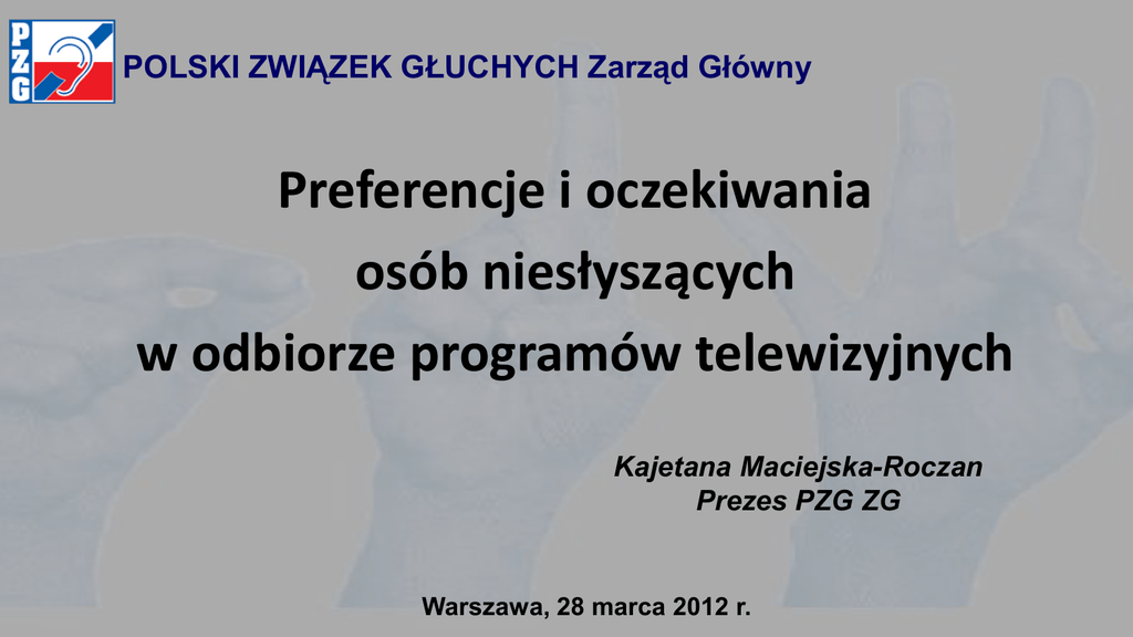 POLSKI ZWIĄZEK GŁUCHYCH Zarząd Główny Preferencje i oczekiwania osób niesłyszących w odbiorze programów telewizyjnych Kajetana Maciejska-Roczan Prezes PZG ZG Warszawa, 28 marca 2012 r. POLSKI ZWIĄZEK GŁUCHYCH Zarząd Główny Demokratyczne funkcjonowanie osób niesłyszących w społeczeństwie w dalszym ciągu obarczone jest barierą w komunikacji międzyludzkiej. Jest ona rezultatem specyfiki ich niepełnosprawności, co wpływa na brak możliwości korzystania w pełni z praw obywatelskich. Również dostęp do szeroko rozumianej sfery kulturalno-rozrywkowej jest bardzo ograniczony dla tej grupy osób niepełnosprawnych. Zarówno programy telewizyjne, jaki i repertuar kin czy teatrów w małym stopniu jest przystosowany do możliwości odbiorczych niesłyszących. W związku z tym lutym 2012 r. z inspiracji Zarządu Głównego Polskiego Związku Głuchych przeprowadzono badania ankietowe wśród niesłyszących członków i podopiecznych Związku, zamieszkałych na terenie całego kraju. Badaniem objęto również dzieci i młodzież uczącą się w placówkach edukacyjnych dla niesłyszących. Łącznie otrzymaliśmy 5 780 ankiet. Warszawa, 28 marca 2012 r. Charakterystyka badanej populacji Rys. 1 Struktura osób ankietowanych według wieku 60,0% 50,0% 52,3% 40,0% 30,0% 20,0% 10,0% 25,7% 21,5% 0,5% 0,0% dzieci młodzież Podział według grup: Źródło: Dzieci – od 6 do 13 lat Młodzież – od 14 do 18 lat Dorośli – od 18 do 60 kobiety i 65 mężczyźni Osoby w wieku emerytalnym – kobiety w wieku powyżej 60 lat, mężczyźni w wieku powyżej 65 lat dorośli osoby w wieku emerytalnym Obliczania własne na podstawie badań ankietowych ZG PZG Warszawa, 28 marca 2012 r. Charakterystyka badanej populacji Rys. 2 Struktura wykształcenia osób ankietowanych 4% bez wykształcenia i podstawowe 12% zawodowe 29% średnie 55% polcealne i wyższe Źródło: Obliczania własne na podstawie badań ankietowych ZG PZG Warszawa, 28 marca 2012 r. Charakterystyka badanej populacji Rys. 3 Status zawodowy osób ankietowanych 50,0% 45,0% 40,0% 35,0% 30,0% 25,0% 20,0% 42,9% 15,0% 10,0% 5,0% 21,4% 11,6% 24,1% uczeo bezrobotny pracujący 0,0% emeryt, rencista Źródło: Obliczania własne na podstawie badań ankietowych ZG PZG Warszawa, 28 marca 2012 r. Charakterystyka badanej populacji Rys. 4 Struktura populacja ankietowanych osoby słabosłyszące 29% osoby głuchonieme 41% osoby niesłyszące 30% Źródło: Obliczania własne na podstawie badań ankietowych ZG PZG Warszawa, 28 marca 2012 r. Odbiór programów telewizyjnych – stan obecny Rys. 5 Oglądalnośd programów telewizyjnych w zależności od pory dnia 11,8% 12,9% 75,3% 5,6% 7,0% 87,4% 10,0% 8,0% 0% 10% 20% 82,0% 30% do południa 40% 50% 60% po południu 70% 80% 90% wieczornem i nocą Źródło: Obliczania własne na podstawie badań ankietowych ZG PZG Warszawa, 28 marca 2012 r. 100% Odbiór programów telewizyjnych – stan obecny Rys. 6 Rodzaje programów TV najczęściej oglądanych przez ankietowanych 70,0 60,0 50,0 40,0 % 30,0 20,0 10,0 0,0 62,8 47,1 26,6 8,4 6,0 Źródło: Obliczania własne na podstawie badań ankietowych ZG PZG Warszawa, 28 marca 2012 r. 18,8 Odbiór programów TV – preferencje osób niesłyszących Rys. 7 Czy programy TV powinny byd emitowane z napisami? Rys. 8 Czy emitowane programy TV powinny byd tłumaczone na język migowy? 11,9% nie 17,6% tak 82,3% napisy na górze ekranu 70,4% napisy na dole ekranu nie 31,0% tak 69,0% tłumaczone na PJM Źródło: Obliczania własne na podstawie badań ankietowych ZG PZG Warszawa, 28 marca 2012 r. 47,9% 21,1% tłumaczone na SJM Odbiór programów TV – preferencje osób niesłyszących Rys. 9 Preferencje osób niesłyszących w odbiorze programów TV 19,5% 41,6% 38,9% tylko tłumaczone z napisami i tłumaczem z samymi napisami Źródło: Obliczania własne na podstawie badań ankietowych ZG PZG Warszawa, 28 marca 2012 r. Odbiór programów TV – preferencje osób niesłyszących Rys. 10 Preferencje poszczególnych grup w odbiorze programów TV 26,7% 54,9% 57,1% 43,3% 43,9% 28,6% 30,1% 14,3% 15,0% dzieci młodzież Tylko tłumaczone 40,2% 29,4% 16,5% dorośli Z napisami i tłumaczem osoby w wieku emerytalnym Z samymi napisami Źródło: Obliczania własne na podstawie badań ankietowych ZG PZG Warszawa, 28 marca 2012 r. Odbiór programów TV – preferencje osób niesłyszących Rys. 11 Preferencje poszczególnych grup ankietowanych w stosunku do tłumaczenia programów TV 120 100,0 100 80 71,5 71,5 63,6 60 36,4 40 28,5 28,5 20 0 0 dzieci młodzież dorośli SJM osoby w wieku emerytalnym PJM Źródło: Obliczania własne na podstawie badań ankietowych ZG PZG Warszawa, 28 marca 2012 r. Wnioski 1. Ze względu na ograniczoną dostępność w odbiorze programów TV przez osoby niesłyszące, blisko co druga z nich poświęca na oglądanie telewizji do 2 godzin dziennie 2. Bilsko 82% osób niesłyszących najczęściej ogląda programy TV po godz. 16:00, co jest związane przede wszystkim z emitowaniem w tym czasie programów z napisami lub tłumaczonych 3. Chęć oglądania programów z samymi napisami wyraża blisko 42% osób ankietowanych, natomiast wyłącznie tłumaczonych ponad 19% 4. Co trzecia ankietowana osoba chciałaby aby programy TV w zależności od ich rodzaju były emitowane z napisami lub tłumaczone 5. Osoby niesłyszące preferują aby filmy, magazyny telewizyjne oraz programy muzyczne były emitowane z napisami, natomiast programy informacyjne, popularnonaukowe, sportowe oraz pozostałe były tłumaczone Warszawa, 28 marca 2012 r. Wnioski 6. Ponad 70% ankietowanych preferuje aby podczas emisji programów TV napisy wyświetlano na dole ekranu 7. Bilsko 48% osób niesłyszących opowiedziało się za tłumaczeniem programów TV na Polski Język Migowy (PJM) Warszawa, 28 marca 2012 r.