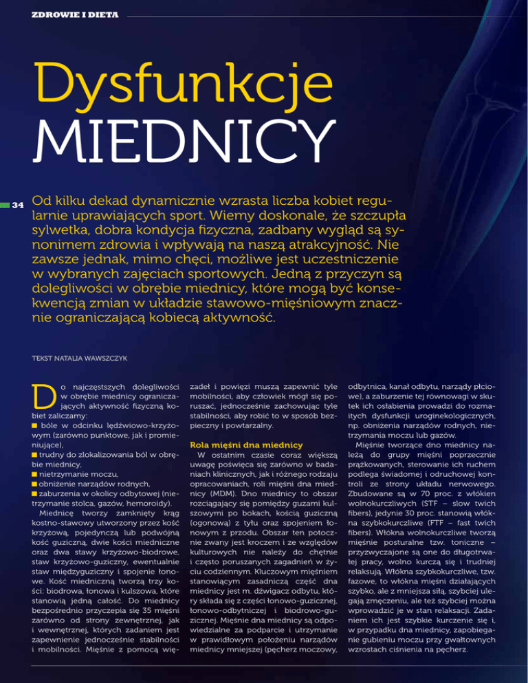 zdrowie i dieta Dysfunkcje miednicy 34 Od kilku dekad dynamicznie wzrasta liczba kobiet regularnie uprawiających sport. Wiemy doskonale, że szczupła sylwetka, dobra kondycja fizyczna, zadbany wygląd są synonimem zdrowia i wpływają na naszą atrakcyjność. Nie zawsze jednak, mimo chęci, możliwe jest uczestniczenie w wybranych zajęciach sportowych. Jedną z przyczyn są dolegliwości w obrębie miednicy, które mogą być konsekwencją zmian w układzie stawowo-mięśniowym znacznie ograniczającą kobiecą aktywność. Tekst Natalia Wawszczyk D o najczęstszych dolegliwości w obrębie miednicy ograniczających aktywność fizyczną kobiet zaliczamy: � bóle w odcinku lędźwiowo-krzyżowym (zarówno punktowe, jak i promieniujące), � trudny do zlokalizowania ból w obrębie miednicy, � nietrzymanie moczu, � obniżenie narządów rodnych, � zaburzenia w okolicy odbytowej (nietrzymanie stolca, gazów, hemoroidy). Miednicę tworzy zamknięty krąg kostno-stawowy utworzony przez kość krzyżową, pojedynczą lub podwójną kość guziczną, dwie kości miedniczne oraz dwa stawy krzyżowo-biodrowe, staw krzyżowo-guziczny, ewentualnie staw międzyguziczny i spojenie łonowe. Kość miedniczną tworzą trzy kości: biodrowa, łonowa i kulszowa, które stanowią jedną całość. Do miednicy bezpośrednio przyczepia się 35 mięśni zarówno od strony zewnętrznej, jak i wewnętrznej, których zadaniem jest zapewnienie jednocześnie stabilności i mobilności. Mięśnie z pomocą wię- zadeł i powięzi muszą zapewnić tyle mobilności, aby człowiek mógł się poruszać, jednocześnie zachowując tyle stabilności, aby robić to w sposób bezpieczny i powtarzalny. Rola mięśni dna miednicy W ostatnim czasie coraz większą uwagę poświęca się zarówno w badaniach klinicznych, jak i różnego rodzaju opracowaniach, roli mięśni dna miednicy (MDM). Dno miednicy to obszar rozciągający się pomiędzy guzami kulszowymi po bokach, kością guziczną (ogonową) z tyłu oraz spojeniem łonowym z przodu. Obszar ten potocznie zwany jest kroczem i ze względów kulturowych nie należy do chętnie i często poruszanych zagadnień w życiu codziennym. Kluczowym mięśniem stanowiącym zasadniczą część dna miednicy jest m. dźwigacz odbytu, który składa się z części łonowo-guzicznej, łonowo-odbytniczej i biodrowo-guzicznej. Mięśnie dna miednicy są odpowiedzialne za podparcie i utrzymanie w prawidłowym położeniu narządów miednicy mniejszej (pęcherz moczowy, odbytnica, kanał odbytu, narządy płciowe), a zaburzenie tej równowagi w skutek ich osłabienia prowadzi do rozmaitych dysfunkcji uroginekologicznych, np. obniżenia narządów rodnych, nietrzymania moczu lub gazów. Mięśnie tworzące dno miednicy należą do grupy mięśni poprzecznie prążkowanych, sterowanie ich ruchem podlega świadomej i odruchowej kontroli ze strony układu nerwowego. Zbudowane są w 70 proc. z włókien wolnokurczliwych (STF – slow twich fibers), jedynie 30 proc. stanowią włókna szybkokurczliwe (FTF – fast twich fibers). Włókna wolnokurczliwe tworzą mięśnie posturalne tzw. toniczne – przyzwyczajone są one do długotrwałej pracy, wolno kurczą się i trudniej relaksują. Włókna szybkokurczliwe, tzw. fazowe, to włókna mięśni działających szybko, ale z mniejsza siłą, szybciej ulegają zmęczeniu, ale też szybciej można wprowadzić je w stan relaksacji. Zadaniem ich jest szybkie kurczenie się i, w przypadku dna miednicy, zapobieganie gubieniu moczu przy gwałtownych wzrostach ciśnienia na pęcherz. 35 MST // 5 // 2015 zdrowie i dieta Zarówno skurcz, jak i rozluźnienie mięśni dna miednicy odpowiadają za podstawowe funkcje życiowe organizmu człowieka związane z układem pokarmowym, wydalniczym i rozrodczym. Mniej oczywista w powszechnej świadomości jest rola MDM w stabilizacji tułowia. Mięsień dźwigacz odbytu wraz z mięśniami poprzecznymi brzucha, mięśniami wielodzielnymi i przeponą klatki piersiowej należą do lokalnych mięśni stanowiących wewnętrzny cylinder stabilizujący kręgosłup lędźwiowy i krzyżowy. Odpowiedzialny jest on za stabilizację obręczy 36 miednicznej w pozycji stojącej, stabilizację nogi podporowej i wykrocznej w trakcie chodu. Biorąc pod uwagę wszystkie funkcje MDM można stwierdzić, że jest to najbardziej aktywna grupa mięśniowa podczas wykonywania codziennych czynności ruchowych. W przypadku braku aktywności mięśni dna miednicy, na skutek uszkodzeń w unerwieniu oraz w skutek procesu starzenia się, zmniejszeniu ulega liczba włókiem wolnych, a przyrostowi liczba włókien szybkich. Dno miednicy staje się zatem mniej wydolne w swojej funkcji i w konsekwencji dochodzi do zmian, które mogą objawiać się dolegliwościami wspomnianymi na początku artykułu. Do najczęściej spotykanych spośród nich zaliczane jest nietrzymanie moczu a szczególnie forma wysiłkowego nietrzymania moczu, która objawia się niekontrolowanym gubieniem moczu podczas wysiłku (kaszel, kichnięcie, bieg, podskoki). Wysiłkowe nietrzymanie moczu W zależności od rodzaju dolegliwości i stopnia nasilenia objawów część kobiet ogranicza bądź całkowicie rezygnuje z aktywności fizycznej. Brak należytej informacji, jak można poradzić sobie z krępującym problemem, gdzie szukać fachowej pomocy i finalnie brak podjęcia terapii, dodatkowo wpływają na kontakty socjalne – kobiety nie uczestniczą w życiu kulturalnym, towarzyskim, często rezygnują z życia seksualnego w obawie przed nieprzewidzianą sytuacją. W ten sposób koło się zamyka, gdyż jednym z elementów leczenia zachowawczego jest nie tylko aktywizacja mięśni dna miednicy, lecz utrzymanie w sprawności całego układu szkieletowo-mięśniowego. Dzięki danym pochodzącym z obserwacji klinicznych wiemy, że ryzyko wystąpienia wysiłkowego nietrzymania moczu dotyczy co trzeciej kobiety i wzrasta wraz z wiekiem. Dodatkowo do czynników 