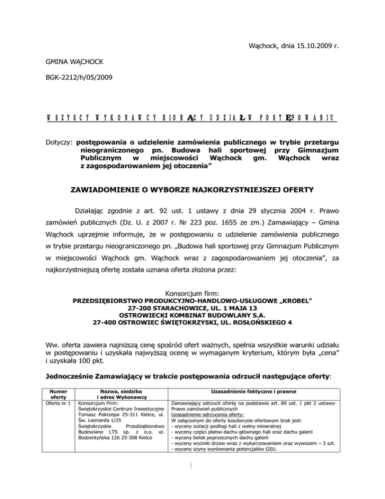 Wąchock, dnia 15.10.2009 r. GMINA WĄCHOCK BGK-2212/h/05/2009 WSZYSCY WYKONAWCY BIORĄCY UDZIAŁ W POSTĘPOWANIU Dotyczy: postępowania o udzielenie zamówienia publicznego w trybie przetargu nieograniczonego pn. Budowa hali sportowej przy Gimnazjum Publicznym w miejscowości Wąchock gm. Wąchock wraz z zagospodarowaniem jej otoczenia” ZAWIADOMIENIE O WYBORZE NAJKORZYSTNIEJSZEJ OFERTY Działając zgodnie z art. 92 ust. 1 ustawy z dnia 29 stycznia 2004 r. Prawo zamówień publicznych (Dz. U. z 2007 r. Nr 223 poz. 1655 ze zm.) Zamawiający – Gmina Wąchock uprzejmie informuje, że w postępowaniu o udzielenie zamówienia publicznego w trybie przetargu nieograniczonego pn. „Budowa hali sportowej przy Gimnazjum Publicznym w miejscowości Wąchock gm. Wąchock wraz z zagospodarowaniem jej otoczenia”, za najkorzystniejszą ofertę została uznana oferta złożona przez: Konsorcjum firm: PRZEDSIĘBIORSTWO PRODUKCYJNO-HANDLOWO-USŁUGOWE „KROBEL” 27-200 STARACHOWICE, UL. 1 MAJA 13 OSTROWIECKI KOMBINAT BUDOWLANY S.A. 27-400 OSTROWIEC ŚWIĘTOKRZYSKI, UL. ROSŁOŃSKIEGO 4 Ww. oferta zawiera najniższą cenę spośród ofert ważnych, spełnia wszystkie warunki udziału w postępowaniu i uzyskała najwyższą ocenę w wymaganym kryterium, którym była „cena” i uzyskała 100 pkt. Jednocześnie Zamawiający w trakcie postępowania odrzucił następujące oferty: Numer oferty Oferta nr 1 Nazwa, siedziba i adres Wykonawcy Konsorcjum Firm: Świętokrzyskie Centrum Inwestycyjne Tomasz Pokrzepa 25-311 Kielce, ul. Św. Leonarda 1/25 Świętokrzyskie Przedsiębiorstwo Budowlane LTS sp. z o.o. ul. Bodzentyńska 12b 25-308 Kielce Uzasadnienie faktyczne i prawne Zamawiający odrzucił ofertę na podstawie art. 89 ust. 1 pkt 2 ustawyPrawo zamówień publicznych Uzasadnienie odrzucenia oferty: W załączonym do oferty kosztorysie ofertowym brak jest: - wyceny izolacji podłogi hali z wełny mineralnej - wyceny części płatwi dachu głównego hali oraz dachu galerii - wyceny belek poprzecznych dachu galerii - wyceny wycinki drzew wraz z wykarczowaniem oraz wywozem – 3 szt. - wyceny szyny wyrównania potencjałów GSU. 1 Oferta nr 7 Firma Budowlana „ANNA-BUD” Bilcza ul. Marmurowa 60 26-026 Morawica Ponadto Zamawiający Wykonawców: w trakcie Numer oferty Oferta nr 2 Nazwa, siedziba i adres Wykonawcy KOMPLEXBUD ul. Wapiennikowa 10A 25-112 Kielce Oferta nr 3 Konsorcjum Firm: Zakład Produkcyjno-Usługowo-Handlowy „POCHBUD” Pocheć Stanisław Włodarczyk Jerzy sp. jawna Pawłów 46 27-225 Pawłów Kompleksowa Obsługa Budownictwa „KOBNEXT” sp. z o.o. ul. Krótka 27A 42-200 Częstochowa EMBUD III spółka jawna Kazimierz Sławek, Jerzy Perchel 27-200 Starachowice, ul. Ostrowiecka 5 Oferta nr 5 Ww. pozycje objęte są przedmiotem zamówienia, w związku z czym powinny być wycenione. Zamawiający odrzucił ofertę na podstawie art. 89 ust. 1 pkt 2 ustawyPrawo zamówień publicznych Uzasadnienie odrzucenia oferty: W załączonym do oferty kosztorysie ofertowym brak jest: - wyceny drzwi aluminiowych EI 30 o wym. 150x200 – 1 szt., - wyceny izolacji podłogi hali z wełny mineralnej, - wyceny pochwytów w łazience dla niepełnosprawnych – 4 szt., - wyceny wyłożenia polerowanym granitem „Ramy” drzwi wejściowych, - wyceny części balustrady schodowej, -wyceny wykończenia powierzchni ścian ogrodzenia tynkiem cementowym malowanym farbą elewacyjną, - w poz. 2.1 i 2.3 nie zwiększono ilości przedmiarowych betonu o 30%, - w poz. 23.2 przyjęto „podkłady betonowe B 7,5 parter” o gr. 5 cm a powinno być 15 cm z betonu B 15, - wyceny wycinki drzew z wykarczowaniem i wywozem - 3 szt. - wyceny szyny wyrównania potencjałów GSU, - wyceny poz. 28.15 – malowanie boisk (kpl. linii). Ww. pozycje objęte są przedmiotem zamówienia, w związku z czym powinny być wycenione. Oferta nr 6 „GRAND” Zakład UsługowoProdukcyjno-Handlowy Andrzej Grygiel Jasienna 200 33-322 Korzenna Oferta nr 8 Przedsiębiorstwo Budownictwa Ogólnego „KARTEL” S.A. 28-300 Jędrzejów, ul. Przemysłowa 8 Oferta nr 9 CREATIVE FUTURE Grzegorz Barczyk Mójcza 25 26-021 Daleszyce Oddział Kielce, ul. Wesoła 51 25-363 Kielce postępowania wykluczył następujących Uzasadnienie faktyczne i prawne Zamawiający wykluczył Wykonawcę z postępowania na podstawie art. 24 ust. 2 pkt 4 ustawy- Prawo zamówień publicznych Uzasadnienie wykluczenia Wykonawcy: Zamawiający pismem z dnia 30 września 2009 roku wezwał Wykonawcę do przedłużenia terminu związania ofertą. Wykonawca w wyznaczonym terminie tj. do dnia 6 października 2009 roku nie przesłał do Zamawiającego zgody na przedłużenie terminu związania ofertą. Zamawiający wykluczył Wykonawcę z postępowania na podstawie art. 24 ust. 2 pkt 4 ustawy- Prawo zamówień publicznych Uzasadnienie wykluczenia Wykonawcy: Zamawiający pismem z dnia 30 września 2009 roku wezwał Wykonawcę do przedłużenia terminu związania ofertą. Wykonawca w wyznaczonym terminie tj. do dnia 6 października 2009 roku nie przesłał do Zamawiającego zgody na przedłużenie terminu związania ofertą. Zamawiający wykluczył Wykonawcę z postępowania na podstawie art. 24 ust. 2 pkt 4 ustawy- Prawo zamówień publicznych Uzasadnienie wykluczenia Wykonawcy: Zamawiający pismem z dnia 30 września 2009 roku wezwał Wykonawcę do przedłużenia terminu związania ofertą. Wykonawca w wyznaczonym terminie tj. do dnia 6 października 2009 roku nie przesłał do Zamawiającego zgody na przedłużenie terminu związania ofertą. Zamawiający wykluczył Wykonawcę z postępowania na podstawie art. 24 ust. 2 pkt 4 ustawy- Prawo zamówień publicznych Uzasadnienie wykluczenia Wykonawcy: Zamawiający pismem z dnia 30 września 2009 roku wezwał Wykonawcę do przedłużenia terminu związania ofertą. Wykonawca w wyznaczonym terminie tj. do dnia 6 października 2009 roku nie przesłał do Zamawiającego zgody na przedłużenie terminu związania ofertą. Zamawiający wykluczył 