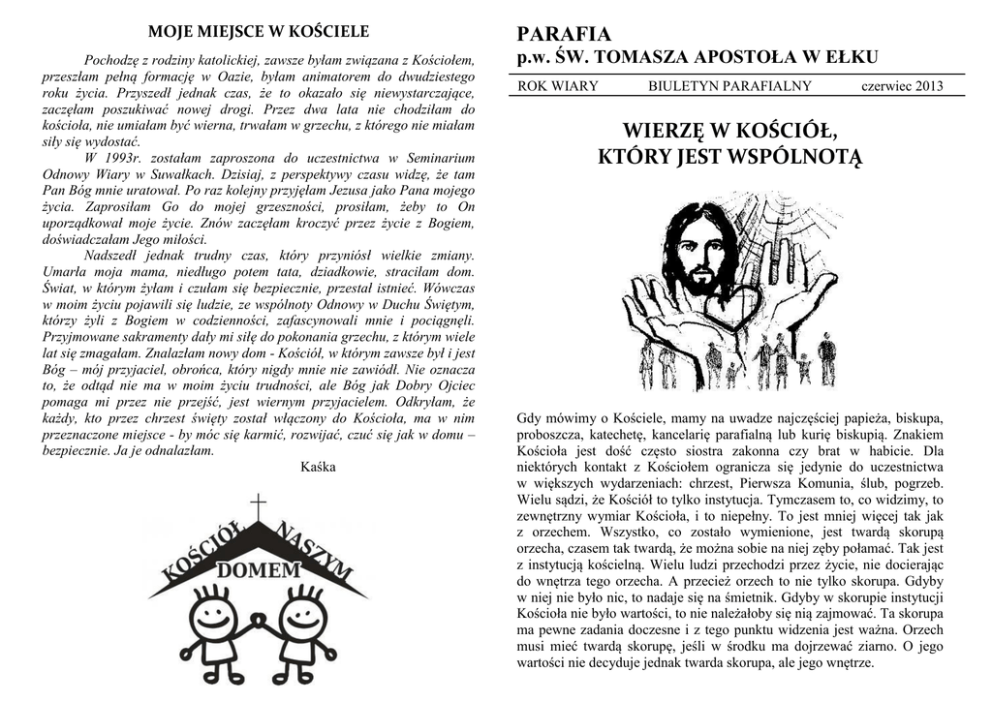 MOJE MIEJSCE W KOŚCIELE Pochodzę z rodziny katolickiej, zawsze byłam związana z Kościołem, przeszłam pełną formację w Oazie, byłam animatorem do dwudziestego roku życia. Przyszedł jednak czas, że to okazało się niewystarczające, zaczęłam poszukiwać nowej drogi. Przez dwa lata nie chodziłam do kościoła, nie umiałam być wierna, trwałam w grzechu, z którego nie miałam siły się wydostać. W 1993r. zostałam zaproszona do uczestnictwa w Seminarium Odnowy Wiary w Suwałkach. Dzisiaj, z perspektywy czasu widzę, że tam Pan Bóg mnie uratował. Po raz kolejny przyjęłam Jezusa jako Pana mojego życia. Zaprosiłam Go do mojej grzeszności, prosiłam, żeby to On uporządkował moje życie. Znów zaczęłam kroczyć przez życie z Bogiem, doświadczałam Jego miłości. Nadszedł jednak trudny czas, który przyniósł wielkie zmiany. Umarła moja mama, niedługo potem tata, dziadkowie, straciłam dom. Świat, w którym żyłam i czułam się bezpiecznie, przestał istnieć. Wówczas w moim życiu pojawili się ludzie, ze wspólnoty Odnowy w Duchu Świętym, którzy żyli z Bogiem w codzienności, zafascynowali mnie i pociągnęli. Przyjmowane sakramenty dały mi siłę do pokonania grzechu, z którym wiele lat się zmagałam. Znalazłam nowy dom - Kościół, w którym zawsze był i jest Bóg – mój przyjaciel, obrońca, który nigdy mnie nie zawiódł. Nie oznacza to, że odtąd nie ma w moim życiu trudności, ale Bóg jak Dobry Ojciec pomaga mi przez nie przejść, jest wiernym przyjacielem. Odkryłam, że każdy, kto przez chrzest święty został włączony do Kościoła, ma w nim przeznaczone miejsce - by móc się karmić, rozwijać, czuć się jak w domu – bezpiecznie. Ja je odnalazłam. Kaśka PARAFIA p.w. ŚW. TOMASZA APOSTOŁA W EŁKU ROK WIARY BIULETYN PARAFIALNY czerwiec 2013 WIERZĘ W KOŚCIÓŁ, KTÓRY JEST WSPÓLNOTĄ Gdy mówimy o Kościele, mamy na uwadze najczęściej papieża, biskupa, proboszcza, katechetę, kancelarię parafialną lub kurię biskupią. Znakiem Kościoła jest dość często siostra zakonna czy brat w habicie. Dla niektórych kontakt z Kościołem ogranicza się jedynie do uczestnictwa w większych wydarzeniach: chrzest, Pierwsza Komunia, ślub, pogrzeb. Wielu sądzi, że Kościół to tylko instytucja. Tymczasem to, co widzimy, to zewnętrzny wymiar Kościoła, i to niepełny. To jest mniej więcej tak jak z orzechem. Wszystko, co zostało wymienione, jest twardą skorupą orzecha, czasem tak twardą, że można sobie na niej zęby połamać. Tak jest z instytucją kościelną. Wielu ludzi przechodzi przez życie, nie docierając do wnętrza tego orzecha. A przecież orzech to nie tylko skorupa. Gdyby w niej nie było nic, to nadaje się na śmietnik. Gdyby w skorupie instytucji Kościoła nie było wartości, to nie należałoby się nią zajmować. Ta skorupa ma pewne zadania doczesne i z tego punktu widzenia jest ważna. Orzech musi mieć twardą skorupę, jeśli w środku ma dojrzewać ziarno. O jego wartości nie decyduje jednak twarda skorupa, ale jego wnętrze. KOŚCIÓŁ jako wspólnota wspólnot Kościół nie jest przypadkowym zlepkiem ludzi, nie jest tłumem pod przewodnictwem biskupów. Jest Wspólnotą, która składa się z mniejszych wspólnot. Wspólnota jest lekarstwem na samotność, a jednocześnie misją zadaną przez Boga. W Ełku istnieje wiele wspólnot, które są nieustannie otwarte na nowych członków. Nie są one kółkami wzajemnej adoracji, często wymagają tego, aby dać coś z siebie. Wszystko odbywa się jednak w wolności, ku której wyswobodził nas Chrystus (Ga 5,1). Grupy modlitewne w naszej parafii: Odnowa w Duchu Świętym – to ruch charyzmatyczny. Początkiem istnienia było doświadczenie tzw. chrztu w Duchu Świętym, zwane także wylaniem Ducha Świętego. Chrzest w Duchu Świętym jest wydarzeniem pozasakramentalnym, lecz wypływającym z sakramentu chrztu oraz bierzmowania. Polega na ożywieniu darów złożonych przez Boga w człowieku w czasie udzielania tych sakramentów. Owocem chrztu jest przemiana życia, uleczenie zranień i umiłowanie Słowa Bożego, modlitwy. Spotkania grup mają kilka charakterystycznych elementów: modlitwa spontaniczna, modlitwa uwielbienia, grupa dzielenia i katecheza. Cechą, która najbardziej rzuca się w oczy, jest częste przywoływanie Ducha Świętego. Spotkania w każdy czwartek po Mszy Św. o godz. 18:00 (oprócz wakacji) Strona internetowa: www.odnowapawelapostol.elk.pl Domowy Kościół - gałąź Ruchu Światło-Życie, jest ruchem rodzinnym. Małżeństwa pragnące pogłębienia swojego życia chrześcijańskiego po przeżyciu 15-dniowych rekolekcji, wchodzą do kręgów, aby tam we wspólnocie kontynuować pracę wewnętrzną, która ma kształtować ich relację z Bogiem i pomiędzy nimi tak, aby tworzyli w swoich rodzinach prawdziwe „domowe kościoły”. W skład kręgu wchodzi 4-7 małżeństw, z których jedno jest parą animatorską oraz kapłan doradca duchowy. Zachęcamy do uczestnictwa wszystkie małżeństwa, które odczuwają pewien niedosyt, brak, a także te, które chcą bardziej kochać się wzajemnie, mają pragnienie czynienia czegoś więcej dla Boga. Informacji związanych ze spotkaniami udziela opiekun ks. Paweł Makarewicz Żywy Różaniec jest wspólnotą osób, które modlą się codziennie na różańcu. Żywy Różaniec składa się z Żywych Róż. Każda Róża składa się z 20 osób, a każda z nich odmawia codziennie jedną tajemnicę różańcową, w taki sposób, by w jednej Żywej Róży, były każdego dnia odmówione wszystkie tajemnice. Członkowie deklarują dochowanie wierności Bogu oraz trwanie w dobrym. Z tym postanowieniem wiążą się kolejne zobowiązania, polegające na wielbieniu i naśladowaniu Maryi oraz wystrzeganiu się grzechów ciężkich. Na czele koła stoi zelator lub zelatorka. Zmiany tajemnic różańcowych odbywają się co miesiąc. „Kółka Różańcowe realizują swoj