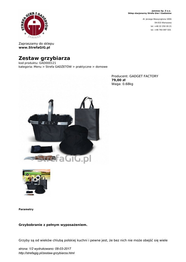 Jammas Sp. Z o.o. Sklep stacjonarny Strefa Gier i Gadżetów Al. Jerzego Waszyngtona 100A 04-015 Warszawa tel. +48 22 250 20 21 tel. +48 793 097 555 Zapraszamy do sklepu www.StrefaGiG.pl Zestaw grzybiarza kod produktu: GAD000121 kategoria: Menu > Strefa GADŻETÓW > praktyczne > domowe Producent: GADGET FACTORY 79,00 zł Waga: 0.68kg Parametry Grzybobranie z pełnym wyposażeniem. Grzyby są od wieków chlubą polskiej kuchni i pewne jest, że bez nich nie może obejść się wiele strona: 1/2 wydrukowano: 08-03-2017 http://strefagig.pl/zestaw-grzybiarza.html narodowych potraw - dlatego ich zbieranie jest tak popularne. Grzybobranie często urasta do rangi rytuału, który wymaga wspierania się odpowiednim sprzętem. Zestaw grzybiarza to świetne wyposażenie dla wszystkich miłośników grzybów. Co zawiera zestaw? Aby ułatwić zbieranie grzybów, znajduje się w nim praktyczny nożyk wykonany ze stali nierdzewnej z pędzelkiem do ich czyszczenia. Ponieważ grzyby lubią przewiewne pojemniki, jest też składany kosz, który bez problemu przechowasz. Dwustronna czapka ochroni Cię przed kleszczami, a jeśli grzybobranie będzie wyjątkowo udane, będziesz miał ze sobą dużą torbę, którą możesz wykorzystać także w innych celach. Zestaw grzybiarza w formie prezentu ucieszy każdego amatora leśnych wypraw. Gadżet w pigułce: - kolor czarny - materiał: stal nierdzewna, nylon, drewno - zawartość zestawu: składany koszyk na grzyby, nóż do grzybów, dwustronna czarna czapka, torba - rozmiar kosza: 35x21x25 cm - rozmiar pudełka: 27,5x19x10 cm - rozmiar noża: 13x2,5 cm - kolorowe opakowanie z rączką strona: 2/2 wydrukowano: 08-03-2017 http://strefagig.pl/zestaw-grzybiarza.html