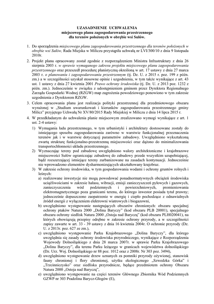 UZASADNIENIE UCHWALENIA miejscowego planu zagospodarowania przestrzennego dla terenów położonych w obrębie wsi Sułów. 1. Do sporządzenia miejscowego planu zagospodarowania przestrzennego dla terenów położonych w obrębie wsi Sułów, Rada Miejska w Miliczu przystąpiła uchwałą nr LVI/300/10 z dnia 9 listopada 2010r. 2. Projekt planu opracowany został zgodnie z rozporządzeniem Ministra Infrastruktury z dnia 26 sierpnia 2003 r. w sprawie wymaganego zakresu projektu miejscowego planu zagospodarowania przestrzennego oraz przeszedł procedurę planistyczną określoną w art. 17 ustawy z dnia 27 marca 2003 r. o planowaniu i zagospodarowaniu przestrzennym (tj. Dz. U. z 2015 r. poz. 199 z późn. zm.) a w szczególności uzyskał stosowne opinie i uzgodnienia, w tym także wynikające z art. 43 ust. 1 ustawy z dnia 27 kwietnia 2001 Prawo ochrony środowiska (tj. Dz. U. z 2013 poz. 1232 z późn. zm.). Jednocześnie w związku z udostępnieniem gminom przez Dyrektora Regionalnego Zarządu Gospodarki Wodnej (RZGW) map zagrożenia powodziowego ponowiono w tym zakresie uzgodnienia z Dyrektorem RZGW. 3. Celem opracowania planu jest realizacja polityki przestrzennej dla przedmiotowego obszaru wyrażonej w „Studium uwarunkowań i kierunków zagospodarowania przestrzennego gminy Milicz” przyjętego Uchwałą Nr XV/80/2015 Rady Miejskiej w Miliczu z dnia 14 lipca 2015 r. 4. W przedkładanym do uchwalenia planie miejscowym zrealizowano wymogi wynikające z art. 1 ust. 2-4 ustawy: 1) Wymagania ładu przestrzennego, w tym urbanistyki i architektury dostosowane zostały do istniejącego sposobu zagospodarowania zarówno w warstwie funkcjonalnej przeznaczenia terenów jak i w warstwie dotyczącej parametrów zabudowy. Uwzględniono wykształconą zwartą strukturę funkcjonalno-przestrzenną miejscowości oraz dążono do minimalizowania transportochłonności układu przestrzennego. 2) Wyznaczając tereny pod zabudowę uwzględniono walory architektoniczne i krajobrazowe miejscowości Sułów ograniczając zabudowę do zabudowy przede wszystkim uzupełniającej, bądź rozszerzającej istniejące tereny zurbanizowane na zasadach kontynuacji. Jednocześnie nie wprowadzono elementów dysharmonizujących ukształtowany krajobraz. 3) W zakresie ochrony środowiska, w tym gospodarowania wodami i ochrony gruntów rolnych i leśnych: a) realizowane inwestycje nie mogą powodować ponadnormatywnych obciążeń środowiska uciążliwościami w zakresie hałasu, wibracji, emisji zanieczyszczeń pyłowych i gazowych, zanieczyszczenia wód podziemnych i powierzchniowych, promieniowania elektromagnetycznego poza granicami terenu, do którego inwestor posiada tytuł prawny; jednocześnie dopuszczono zaopatrzenie w energię i ciepło pochodzące z odnawialnych źródeł energii z wyłączeniem elektrowni wiatrowych i biogazowni, b) uwzględniono występowanie następujących obszarów chronionych: obszaru specjalnej ochrony ptaków Natura 2000 „Dolina Baryczy” (kod obszaru PLB 20001), specjalnego obszaru ochrony siedlisk Natura 2000 „Ostoja nad Baryczą” (kod obszaru PLH020041), na których obowiązują przepisy odrębne w zakresie ochrony przyrody, a w szczególności zapisy zawarte w art. 33 - 39 ustawy z dnia 16 kwietnia 2004r. O ochronie przyrody (Dz. U. z 2013r. poz. 627 ze zm.), c) uwzględniono występowanie Parku Krajobrazowego „Dolina Baryczy”, dla którego uwzględnia się zasady ochrony środowiska przyrodniczego, wynikające z Rozporządzenia Wojewody Dolnośląskiego z dnia 28 marca 2007r. w sprawie Parku Krajobrazowego „Dolina Baryczy”, dla terenu Parku leżącego w granicach województwa dolnośląskiego (Dz. Urz. Woj. Dolnośląskiego nr 88 poz. 1012 oraz z 2008r. Nr 303 poz. 3494), d) uwzględniono występowanie drzew uznanych za pomniki przyrody ożywionej, stanowisk fauny chronionej i flory chronionej, użytku ekologicznego „Szwedzka Górka” i „Trzcinniczysko” oraz siedliska przyrodnicze, będące przedmiotem ochrony Obszaru Natura 2000 „Ostoja nad Baryczą”, e) uwzględniono występowanie na części terenów Głównego Zbiornika Wód Podziemnych GZWP nr 303 Pradolina Barycz-Głogów (E), f) uwzględniono występowanie strefy ochrony sanitarnej od terenu cmentarza, g) w toku prac nad planem, na podstawie art. 7 ust. 2 pkt 1 ustawy z dnia 3 lutego 1995 r. o ochronie gruntów rolnych i leśnych (tj. Dz. U. z 2004 r. nr 121 poz. 1266 z późn. zm.) zaszła konieczność wystąpienia do Ministra Rolnictwa i Rozwoju Wsi z prośbą o wyrażenie zgody na zmianę przeznaczenia gruntów rolnych na cele nierolnicze i nieleśne. W wyniku przeprowadzonej procedury 0,4961 ha gruntów rolnych uzyskało stosowną zgodę na zmianę przeznaczenia gruntów rolnych na cele nierolnicze i nieleśne. 4) Ustalenia planu uwzględniają wymagania ochrony dziedzictwa kulturowego i zabytków oraz dóbr kultury współczesnej, ze szczególnym uwzględnieniem zabytków wpisanych do rejestru zabytków, ewidencji zabytków, wyznaczenia stref ochrony konserwatorskiej ścisłej, podstawowej, krajobrazu kulturowego i ekspozycji, uwzględnieniem stanowisk archeologicznych oraz stref ochrony zabytków archeologicznych i ścisłej ochrony archeologicznej, co zostało potwierdzone procedurą uzgodnienia projektu planu z Wojewódzkim Konserwatorem Zabytków. 5) Ochrony zdrowia oraz bezpieczeństwa ludzi i mienia, a także potrzeby osób niepełnosprawnych. W projekcie planu wprowadzono segregację funkcji z podziałem uwzględniającym stopień niekorzystnego oddziaływania, zaprojektowano obwodnicę centralnej części miejscowości w ciągu drogi wojewódzkiej nr 479. Uwzględniono występujące wzdłuż rzeki Baryczy i jej rozlewisk obszary szczególnego zagrożenia powodzią, na których prawdopodobieństwo powodzi jest wysokie i wynosi raz na 10 lat (Q10%) oraz średnie i wynosi raz na 100 lat (Q1%), na których obowiązują ograniczenia zgodnie z przepisami odrębnymi. Uwzględniono równ