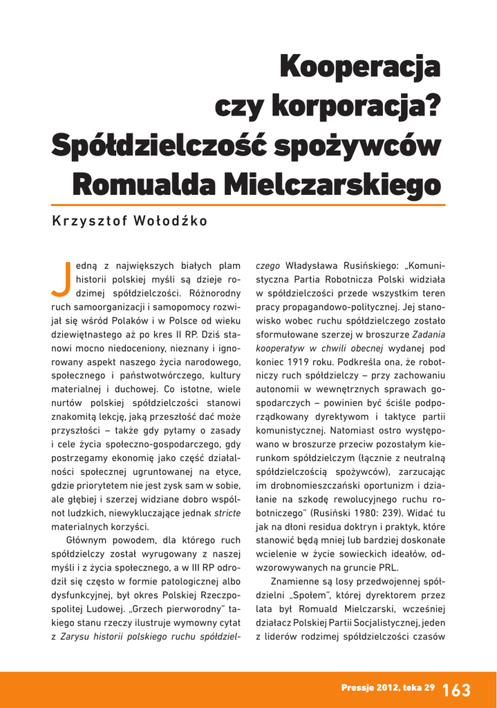 Kooperacja czy korporacja? Spółdzielczość spożywców Romualda Mielczarskiego K r z ys z t o f Wo ł o d ź ko J edną z największych białych plam historii polskiej myśli są dzieje rodzimej spółdzielczości. Różnorodny ruch samoorganizacji i samopomocy rozwijał się wśród Polaków i w Polsce od wieku dziewiętnastego aż po kres II RP. Dziś stanowi mocno niedoceniony, nieznany i ignorowany aspekt naszego życia narodowego, społecznego i państwotwórczego, kultury materialnej i duchowej. Co istotne, wiele nurtów polskiej spółdzielczości stanowi znakomitą lekcję, jaką przeszłość dać może przyszłości – także gdy pytamy o zasady i cele życia społeczno-gospodarczego, gdy postrzegamy ekonomię jako część działalności społecznej ugruntowanej na etyce, gdzie priorytetem nie jest zysk sam w sobie, ale głębiej i szerzej widziane dobro wspólnot ludzkich, niewykluczające jednak stricte materialnych korzyści. Głównym powodem, dla którego ruch spółdzielczy został wyrugowany z naszej myśli i z życia społecznego, a w III RP odrodził się często w formie patologicznej albo dysfunkcyjnej, był okres Polskiej Rzeczpospolitej Ludowej. „Grzech pierworodny” takiego stanu rzeczy ilustruje wymowny cytat z Zarysu historii polskiego ruchu spółdziel- czego Władysława Rusińskiego: „Komunistyczna Partia Robotnicza Polski widziała w spółdzielczości przede wszystkim teren pracy propagandowo-politycznej. Jej stanowisko wobec ruchu spółdzielczego zostało sformułowane szerzej w broszurze Zadania kooperatyw w chwili obecnej wydanej pod koniec 1919 roku. Podkreśla ona, że robotniczy ruch spółdzielczy – przy zachowaniu autonomii w wewnętrznych sprawach gospodarczych – powinien być ściśle podporządkowany dyrektywom i taktyce partii komunistycznej. Natomiast ostro występowano w broszurze przeciw pozostałym kierunkom spółdzielczym (łącznie z neutralną spółdzielczością spożywców), zarzucając im drobnomieszczański oportunizm i działanie na szkodę rewolucyjnego ruchu robotniczego” (Rusiński 1980: 239). Widać tu jak na dłoni residua doktryn i praktyk, które stanowić będą mniej lub bardziej doskonałe wcielenie w życie sowieckich ideałów, odwzorowywanych na gruncie PRL. Znamienne są losy przedwojennej spółdzielni „Społem”, której dyrektorem przez lata był Romuald Mielczarski, wcześniej działacz Polskiej Partii Socjalistycznej, jeden z liderów rodzimej spółdzielczości czasów Pressje 2012, teka 29 163 międzywojnia. Jak zauważa Remigiusz Okraska w posłowiu do wydanego niedawno wyboru pism Mielczarskiego (2010): „Wojna, a następnie dokonane przez komunistów całkowite wypaczenie ideałów «Społem», poprzez de facto upaństwowienie spółdzielczości spożywców i wyrugowanie z niej demokracji, zniszczyły to wielkie dzieło. W żadnej jednak mierze nie podważyły, a wręcz dobitnie potwierdziły słuszność poglądów Mielczarskiego na temat tego, jak powinien działać i jakim celom służyć ruch kooperatywny oraz na jakich zasadach musi być oparta autentyczna współwłasność społeczna” (Okraska 2010: 163). Postać Mielczarskiego jest zapoznana – niesłusznie. Stąd on właśnie będzie głównym bohaterem tekstu. Ukażę go najpierw jako człowieka czynu, następnie przejdę do omówienia przyświecających mu spółdzielczych idei społeczno-gospodarczych. A kto to był Mielczarski? Adam Mielczarski urodził się 5 lutego 1871 roku w Bełchatowie. W roku 1896 ukończył z wyróżnieniem studia ekonomiczne w prestiżowym Instytucie Handlowym w Antwerpii. Był już wówczas aktywnym działaczem i publicystą socjalistycznym, jego „patriotyzm i akcentowanie haseł niepodległościowych współgrały z marksowskimi teoriami ekonomicznymi. […] Reprezentował nurt reformistyczny w socjalizmie, głosząc, że droga przeobrażeń prowadzi przez zakładanie robotniczych partii politycznych, które na drodze parlamentarnej winny stopniowo wprowadzać rozwiązania korzystne dla klasy pracującej – ustrojowe, socjalne, dotyczące praw obywatelskich itd.” (Okraska 2010: 122). Po wielu perturbacjach i zawieruchach, osobistych i dziejowych, w tym po ośmiomiesięcznym więzieniu w Rosji za niepodległościową działalność na emigracji, Mielczarski 164 Krzysztof Wołodźko w 1905 roku przybył do Warszawy. Zgłosił swój akces do powstałego z inicjatywy Edwarda Abramowskiego Towarzystwa Kooperatystów, działającego w ramach Związku Towarzystw Samopomocy Społecznej. ZTSS reprezentował bardzo żywy wówczas nurt Przełomowy okazał się import śledzi ze Szkocji „kulturalników”, „społeczników”, którzy przez samopomoc, samoorganizację, szeroko pojmowaną działalność społeczno-kulturalną chcieli odnowić i ożywić życie społeczne Polaków, kładąc tym samym zręby pod wyobrażony i spodziewany demokratyczny, prospołeczny ustrój przyszłej Rzeczpospolitej. W 1911 roku powstał Warszawski Związek Stowarzyszeń Spożywczych. Mielczarski został jednym z jego dyrektorów. Związek rozwijał się prężnie. Spółdzielcy „jako pierwsi sprowadzili do Polski sól z terenów Rosji z pominięciem kartelu prywatnych handlarzy tym produktem, dyktujących wówczas ceny. Podobnie przełomowy okazał się import śledzi ze Szkocji (okazały się najtańsze na polskim rynku), dotąd zmonopolizowany w rękach prywatnych kupców żydowskich. Wkrótce z pominięciem prywatnych hurtowni, tym razem głównie niemieckich, zaczęto sprowadzać towary kolonialne” (Okraska 2010: 137). Mielczarski jeździł po Europie, zachęcając potencjalnych producentów do współpracy. W 1919 roku WZSS przemianowano na Związek Polskich Stowarzyszeń Spożywców. Już pierwsze lata przyniosły kooperatywie znaczny wzrost na przeróżnych polach aktywności społeczno-gospodarczej, w tym produkcyjnej. Latem 1919 roku ZPSS stał się członkiem Międzynarodowego Związku Spółdzielczego