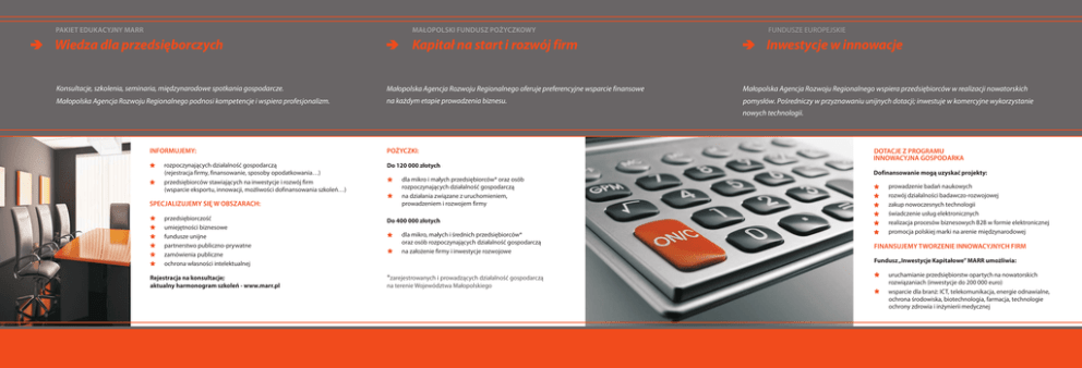 PAKIET EDUKACYJNY MARR MAÙOPOLSKI FUNDUSZ POÝYCZKOWY FUNDUSZE EUROPEJSKIE Wiedza dla przedsiêborczych Kapita³ na start i rozwój firm Inwestycje w innowacje Konsultacje, szkolenia, seminaria, miêdzynarodowe spotkania gospodarcze. Ma³opolska Agencja Rozwoju Regionalnego oferuje preferencyjne wsparcie finansowe Ma³opolska Agencja Rozwoju Regionalnego wspiera przedsiæbiorców w realizacji nowatorskich Ma³opolska Agencja Rozwoju Regionalnego podnosi kompetencje i wspiera profesjonalizm. na ka¿dym etapie prowadzenia biznesu. pomysùów. Poúredniczy w przyznawaniu unijnych dotacji; inwestuje w komercyjne wykorzystanie nowych technologii. INFORMUJEMY: rozpoczynaj¹cych dzia³alnoœæ gospodarcz¹ (rejestracja firmy, finansowanie, sposoby opodatkowania…) przedsiêbiorców stawiaj¹cych na inwestycje i rozwój firm (wsparcie eksportu, innowacji, mo¿liwoœci dofinansowania szkoleñ…) SPECJALIZUJEMY SIÊ W OBSZARACH: przedsiêbiorczoœæ umiejêtnoœci biznesowe fundusze unijne partnerstwo publiczno-prywatne zamówienia publiczne ochrona w³asnoœci intelektualnej Rejestracja na konsultacje; aktualny harmonogram szkoleñ - www.marr.pl POÝYCZKI: DOTACJE Z PROGRAMU INNOWACYJNA GOSPODARKA Do 120 000 z³otych Dofinansowanie mogà uzyskaã projekty: dla mikro i maùych przedsiæbiorców* oraz osób rozpoczynajàcych dziaùalnoúã gospodarczà na dzia³ania zwi¹zane z uruchomieniem, prowadzeniem i rozwojem firmy Do 400 000 z³otych dla mikro, maùych i úrednich przedsiæbiorców* oraz osób rozpoczynajàcych dziaùalnoúã gospodarczà na za³o¿enie firmy i inwestycje rozwojowe prowadzenie badañ naukowych rozwój dziaùalnoúci badawczo-rozwojowej zakup nowoczesnych technologii úwiadczenie usùug elektronicznych realizacja procesów biznesowych B2B w formie elektronicznej promocja polskiej marki na arenie miædzynarodowej FINANSUJEMY TWORZENIE INNOWACYJNYCH FIRM Fundusz „Inwestycje Kapitaùowe” MARR umoýliwia: *zarejestrowanych i prowadzàcych dziaùalnoúã gospodarczà na terenie Województwa Maùopolskiego uruchamianie przedsiæbiorstw opartych na nowatorskich rozwiàzaniach (inwestycje do 200 000 euro) wsparcie dla bran¿: ICT, telekomunikacja, energie odnawialne, ochrona œrodowiska, biotechnologia, farmacja, technologie ochrony zdrowia i in¿ynierii medycznej MAÙOPOLSKA... Przyjazna przestrzeñ biznesu MARR wspiera eksport i pomaga bezpiecznie inwestowaã w Maùopolsce. Zapewnia know-how i logistyczne zaplecze dla firm. TWÓJ PARTNER W BIZNESIE CENTRUM BUSINESS IN MALOPOLSKA KONTAKT Kompleksowa obsùuga inwestorów i eksporterów: Ma³opolska Agencja Rozwoju Regionalnego SA ul. Kordylewskiego 11, 31- 542 Kraków informacje dla przedsiêbiorców planuj¹cych inwestycje w Ma³opolsce pomoc w nawi¹zywaniu kontaktów biznesowych promocja regionalnych firm na arenie miêdzynarodowej poœrednictwo w pozyskiwaniu zagranicznych partnerów biznesowych aktualne bazy danych eksporterów, ofert inwestycyjnych i nieruchomoœci tel. 12 617 66 00 12 617 66 01 fax: 12 617 66 66 e-mail: [email protected] MARR BUSINESS PARK Wynajem i sprzeda¿ nieruchomoœci: obiekty magazynowe, produkcyjne i handlowe nowoczesna infrastruktura, funkcjonalnoœæ i wysoki standard lokalizacja - Kraków www.marr.pl WYZNACZAMY KIERUNEK BIZNESU W MA£OPOLSCE