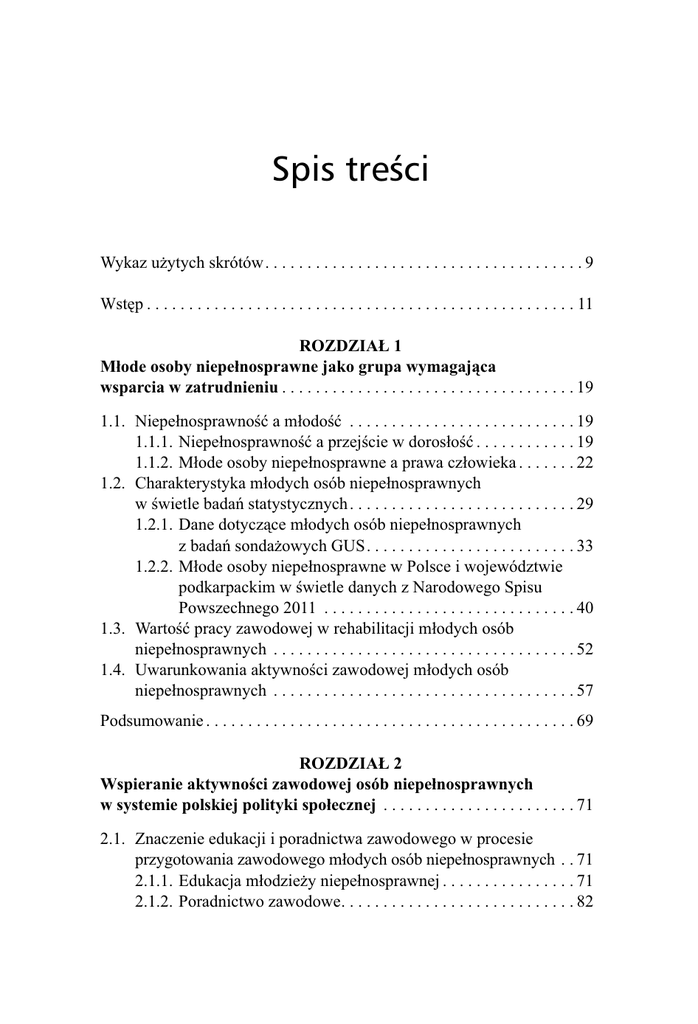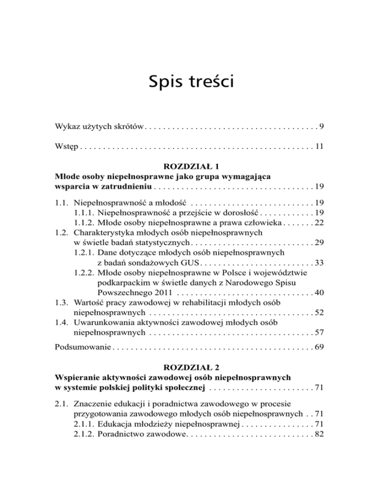 Spis treści Wykaz użytych skrótów. . . . . . . . . . . . . . . . . . . . . . . . . . . . . . . . . . . . . . 9 Wstęp . . . . . . . . . . . . . . . . . . . . . . . . . . . . . . . . . . . . . . . . . . . . . . . . . . . 11 ROZDZIAŁ 1 Młode osoby niepełnosprawne jako grupa wymagająca wsparcia w zatrudnieniu . . . . . . . . . . . . . . . . . . . . . . . . . . . . . . . . . . . 19 1.1. Niepełnosprawność a młodość . . . . . . . . . . . . . . . . . . . . . . . . . . . 19 1.1.1. Niepełnosprawność a przejście w dorosłość . . . . . . . . . . . . 19 1.1.2. Młode osoby niepełnosprawne a prawa człowieka . . . . . . . 22 1.2. Charakterystyka młodych osób niepełnosprawnych w świetle badań statystycznych . . . . . . . . . . . . . . . . . . . . . . . . . . . 29 1.2.1. Dane dotyczące młodych osób niepełnosprawnych z badań sondażowych GUS. . . . . . . . . . . . . . . . . . . . . . . . . 33 1.2.2. Młode osoby niepełnosprawne w Polsce i województwie podkarpackim w świetle danych z Narodowego Spisu Powszechnego 2011 . . . . . . . . . . . . . . . . . . . . . . . . . . . . . . 40 1.3. Wartość pracy zawodowej w rehabilitacji młodych osób niepełnosprawnych . . . . . . . . . . . . . . . . . . . . . . . . . . . . . . . . . . . . 52 1.4. Uwarunkowania aktywności zawodowej młodych osób niepełnosprawnych . . . . . . . . . . . . . . . . . . . . . . . . . . . . . . . . . . . . 57 Podsumowanie . . . . . . . . . . . . . . . . . . . . . . . . . . . . . . . . . . . . . . . . . . . . 69 ROZDZIAŁ 2 Wspieranie aktywności zawodowej osób niepełnosprawnych w systemie polskiej polityki społecznej . . . . . . . . . . . . . . . . . . . . . . . 71 2.1. Znaczenie edukacji i poradnictwa zawodowego w procesie przygotowania zawodowego młodych osób niepełnosprawnych . . 71 2.1.1. Edukacja młodzieży niepełnosprawnej . . . . . . . . . . . . . . . . 71 2.1.2. Poradnictwo zawodowe. . . . . . . . . . . . . . . . . . . . . . . . . . . . 82 6 2.2. Charakterystyka polskiego systemu wspierania zatrudnienia osób niepełnosprawnych . . . . . . . . . . . . . . . . . . . . . . . . . . . . . . . . 87 2.2.1. Założenia i efektywność polskiego systemu udziałowego . . . 87 2.2.2. Podmioty realizujące zadania z zakresu rehabilitacji zawodowej. . . . . . . . . . . . . . . . . . . . . . . . . . . . . . . . . . . . . . 95 2.2.3. Formy zatrudnienia osób niepełnosprawnych. . . . . . . . . . 100 2.2.4. Uprawnienia pracowników niepełnosprawnych i pracodawców ich zatrudniających . . . . . . . . . . . . . . . . . 115 2.3. Aktywizacja osób niepełnosprawnych bezrobotnych i poszukujących pracy . . . . . . . . . . . . . . . . . . . . . . . . . . . . . . . . . 122 2.3.1. Formy aktywizacji zawodowej . . . . . . . . . . . . . . . . . . . . . 122 2.3.2. Specjalne instrumenty adresowane do młodych osób niepełnosprawnych . . . . . . . . . . . . . . . . . . . . . . . . . . . . . . 126 2.4. Mocne i słabe strony działań z zakresu aktywizacji zawodowej młodych osób niepełnosprawnych w Polsce – próba podsumowania . . . . . . . . . . . . . . . . . . . . . . . . . . . . . . . . . . . . . . . 132 ROZDZIAŁ 3 Młodzi niepełnosprawni o aktywności zawodowej i swoim statusie na rynku pracy . . . . . . . . . . . . . . . . . . . . . . . . . . . . . . . . . . . 137 3.1. Metodologia badań empirycznych . . . . . . . . . . . . . . . . . . . . . . . . 137 3.1.1. Przedmiot i cel badań . . . . . . . . . . . . . . . . . . . . . . . . . . . . 137 3.1.2. Charakterystyka terenu badań . . . . . . . . . . . . . . . . . . . . . . 139 3.1.3. Metody i narzędzia badawcze . . . . . . . . . . . . . . . . . . . . . . 142 3.1.4. Uczestnicy badań ilościowych według cech demograficznych i społecznych. . . . . . . . . . . . . . . . . . . . . 144 3.2. Znaczenie pracy zawodowej dla młodych osób niepełnosprawnych . . . . . . . . . . . . . . . . . . . . . . . . . . . . . . . . . . . 161 3.3. Droga do zatrudnienia . . . . . . . . . . . . . . . . . . . . . . . . . . . . . . . . . 169 3.4. Czynniki warunkujące aktywność ekonomiczną młodych niepełnosprawnych w województwie podkarpackim . . . . . . . . . 181 3.5. Sytuacja pracujących młodych osób niepełnosprawnych . . . . . . 193 3.6. Poziom znajomości i ocena wybranych aspektów systemu wspierania aktywności zawodowej osób niepełnosprawnych. . . 203 Podsumowanie . . . . . . . . . . . . . . . . . . . . . . . . . . . . . . . . . . . . . . . . . . . 219 7 ROZDZIAŁ 4 Czynniki kreujące sytuację młodych osób niepełnosprawnych na rynku pracy w opinii przedstawicieli instytucji i pracodawców . . . . . . . . . . . . . . . . . . . . . . . . . . . . . . . . . . . . . . . . . . 221 4.1. Metodologia badań jakościowych . . . . . . . . . . . . . . . . . . . . . . . . 221 4.1.1. Metody i narzędzia badawcze . . . . . . . . . . . . . . . . . . . . . . 221 4.1.2. Charakterystyka respondentów objętych indywidualnym wywiadem pogłębionym . . . . . . . . . . . . . 222 4.2. Uwarunkowania aktywności zawodowej młodych osób niepełnosprawnych na podkarpackim rynku pracy . . . . . . . . . . . 223 4.2.1. Strukturalne uwarunkowania zatrudnienia młodych osób niepełnosprawnych na rynku pracy . . . . . . . . . . . . . 224 4.2.2. Indywidualne i środowiskowe uwarunkowania aktywności zawodowej młodych osób niepełnosprawnych . . . . . . . . . . . . . . . . . . . . . . . . . . . . . . 240 4.3. Podmioty publiczne i organizacje pozarządowe w procesie aktywizacji zawodowej młodych osób niepełnosprawnych . . . . 261 4.4. Propozycje działań wspierających zatrudnienie młodych osób niepełnosprawnych postulowane przez badanych . . . . . . . 288 Podsumowanie . . . . . . . . . . . . . . . . . . . . . . . . . . . . . . . . . . . . . . . . . . . 290 Zakończenie . . . . . . . . . . . . . . . . . . . . . . . . . . . . . . . . . . . . . . . . . . . . . 293 Bibliografia . . . . . . . . . . . . . . . . . . . . . . . . . . . . . . . . . . . . . . . . . . . . . 301 Spis tabel 