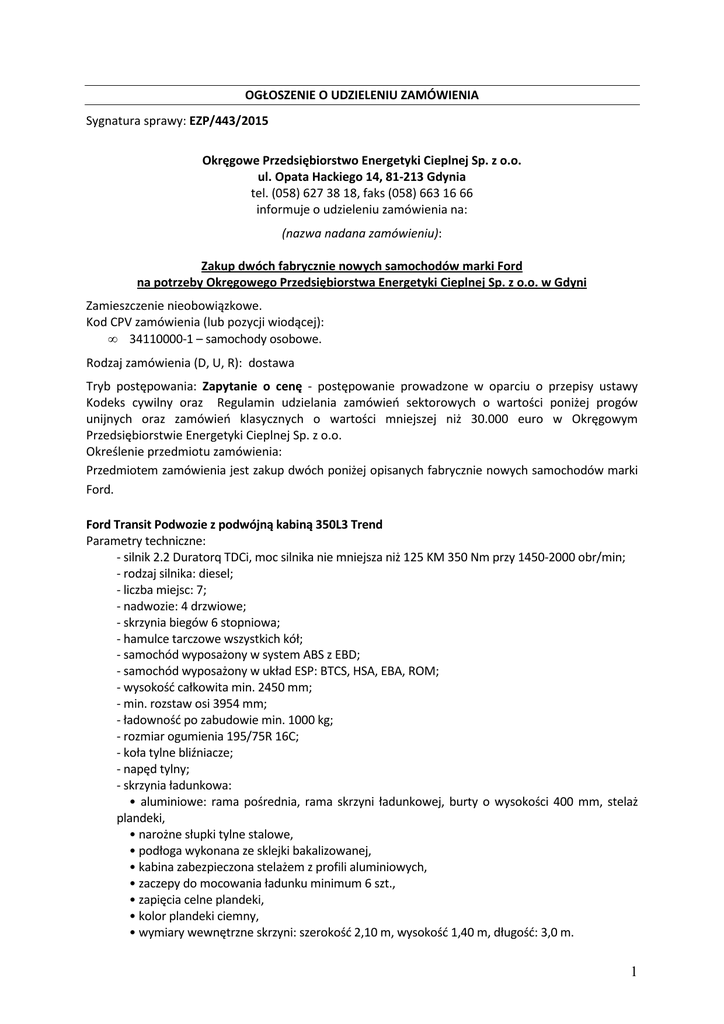 OGŁOSZENIE O UDZIELENIU ZAMÓWIENIA Sygnatura sprawy: EZP/443/2015 Okręgowe Przedsiębiorstwo Energetyki Cieplnej Sp. z o.o. ul. Opata Hackiego 14, 81-213 Gdynia tel. (058) 627 38 18, faks (058) 663 16 66 informuje o udzieleniu zamówienia na: (nazwa nadana zamówieniu): Zakup dwóch fabrycznie nowych samochodów marki Ford na potrzeby Okręgowego Przedsiębiorstwa Energetyki Cieplnej Sp. z o.o. w Gdyni Zamieszczenie nieobowiązkowe. Kod CPV zamówienia (lub pozycji wiodącej): • 34110000-1 – samochody osobowe. Rodzaj zamówienia (D, U, R): dostawa Tryb postępowania: Zapytanie o cenę - postępowanie prowadzone w oparciu o przepisy ustawy Kodeks cywilny oraz Regulamin udzielania zamówień sektorowych o wartości poniżej progów unijnych oraz zamówień klasycznych o wartości mniejszej niż 30.000 euro w Okręgowym Przedsiębiorstwie Energetyki Cieplnej Sp. z o.o. Określenie przedmiotu zamówienia: Przedmiotem zamówienia jest zakup dwóch poniżej opisanych fabrycznie nowych samochodów marki Ford. Ford Transit Podwozie z podwójną kabiną 350L3 Trend Parametry techniczne: - silnik 2.2 Duratorq TDCi, moc silnika nie mniejsza niż 125 KM 350 Nm przy 1450-2000 obr/min; - rodzaj silnika: diesel; - liczba miejsc: 7; - nadwozie: 4 drzwiowe; - skrzynia biegów 6 stopniowa; - hamulce tarczowe wszystkich kół; - samochód wyposażony w system ABS z EBD; - samochód wyposażony w układ ESP: BTCS, HSA, EBA, ROM; - wysokość całkowita min. 2450 mm; - min. rozstaw osi 3954 mm; - ładowność po zabudowie min. 1000 kg; - rozmiar ogumienia 195/75R 16C; - koła tylne bliźniacze; - napęd tylny; - skrzynia ładunkowa: • aluminiowe: rama pośrednia, rama skrzyni ładunkowej, burty o wysokości 400 mm, stelaż plandeki, • narożne słupki tylne stalowe, • podłoga wykonana ze sklejki bakalizowanej, • kabina zabezpieczona stelażem z profili aluminiowych, • zaczepy do mocowania ładunku minimum 6 szt., • zapięcia celne plandeki, • kolor plandeki ciemny, • wymiary wewnętrzne skrzyni: szerokość 2,10 m, wysokość 1,40 m, długość: 3,0 m. 1 Termin dostarczenia przedmiotu zamówienia wynosi 45 dni kalendarzowych od dnia przekazania Wykonawcom informacji o wyborze najkorzystniejszej oferty. Ford Transit Podwozie z podwójną kabiną 350L3 Trend 4X4 Parametry techniczne: - silnik 2.2 Duratorq TDCi, moc silnika nie mniejsza niż 125 KM 350 Nm przy 1450-2000 obr/min; - rodzaj silnika: diesel; - liczba miejsc: 7; - nadwozie: 4 drzwiowe; - skrzynia biegów 6 stopniowa; - hamulce tarczowe wszystkich kół; - samochód wyposażony w system ABS z EBD; - samochód wyposażony w układ ESP: BTCS, HSA, EBA, ROM; - wysokość całkowita min. 2218 mm; - min. rozstaw osi 3954 mm; - ładowność po zabudowie min. 600 kg; - rozmiar ogumienia 236/65R 16C; - koła tylne pojedyncze; - napęd 4X4 AWD; - wywrot trójstronny: • stalowe: rama pośrednia, rama skrzyni, ściana chroniąca kabinę kierowcy, • burty aluminiowe w wysokości 400 mm, • burty: boczne otwierane do dołu, tylna otwierana do dołu lub do góry, • silnik elektryczny układu hydraulicznego zasilany z układu elektrycznego samochodu • wymiary wewnętrzne: szerokość 2,03 m, wysokość 0,40 m, długość: 2,90 m. Termin dostarczenia przedmiotu zamówienia wynosi 150 dni kalendarzowych od dnia przekazania Wykonawcom informacji o wyborze najkorzystniejszej oferty. Warunki dotyczące gwarancji: - minimum 24 miesiące na silnik i podzespoły mechaniczne (bez limitu kilometrów); - minimum 36 miesięcy na powłokę lakierniczą; - minimum 144 miesięcy na zabezpieczenie antykorozyjne na perforację nadwozia. Zamówienie dotyczy projektu/programu finansowanego ze środków Unii Europejskiej: nie Data udzielenia zamówienia: 22.10.2015r. Liczba otrzymanych ofert w postępowaniu: 1 Liczba odrzuconych ofert: 0 Streszczenie oceny i porównanie złożonych ofert: Nr oferty Nazwa Wykonawcy 1 EURO-CAR Sp. z o.o. Adres Wykonawcy ul. Owsiana 13 81-020 Gdynia Liczba pkt w kryterium: cena 100,00 Umowa w sprawie zamówienia została zawarta z: EURO-CAR Sp. z o.o. ul. Owsiana 13, 81-020 Gdynia. 2