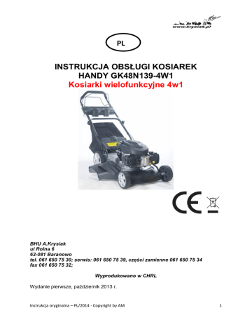 PL INSTRUKCJA OBSŁUGI KOSIAREK HANDY GK48N139-4W1 Kosiarki wielofunkcyjne 4w1 BHU A.Krysiak ul Rolna 6 62-081 Baranowo tel. 061 650 75 30; serwis: 061 650 75 39, części zamienne 061 650 75 34 fax 061 650 75 32; Wyprodukowano w CHRL Wydanie pierwsze, październik 2013 r. Instrukcja oryginalna – PL/2014 - Copyright by AM 1 Wskazówka: Przeczytaj uważnie niniejszą instrukcję przed uruchomieniem kosiarki. Instrukcja zawiera ważne informacje o BEZPIECZEŃSTWIE, MONTAŻU, PRACY I KONSERWACJI. Do kosiarki jest dołączona również instrukcja obsługi silnika. Zachowaj obydwie instrukcje, ponieważ zawierają istotne informacje o kosiarce. OZNACZENIA PIKTOGRAMÓW UWAGA: Przed użytkowaniem przeczytaj instrukcję obsługi. UWAGA: Podczas koszenia uważać na osoby postronne. UWAGA: Niebezpieczeństwo zranienia przez elementy tnące, nie wkładać rąk ani nóg pod kosiarkę. UWAGA: Spaliny z kosiarki zawierają toksyczny gaz. Nie uruchamiaj kosiarki w zamkniętych lub pozbawionych wentylacji pomieszczeniach. UWAGA: Gorąca powierzchnia. Nie dotykać! UWAGA: Przed czynnościami konserwacyjnymi, czyszczeniem, regulacją zatrzymać silnik i odłączyć przewód świecy zapłonowej. UWAGA: Nie dolewać paliwa w czasie pracy silnika. WAŻNE: Przeczytaj uważnie załączoną instrukcję obsługi silnika Uwaga!!! Ze względu na ciągłe doskonalenie produktów zamieszczone rysunki, opisy mogą się różnić od zakupionego towaru oraz mogą zawierać elementy opcjonalne lub specjalistyczne nieprzewidziane w wersji standardowej. Różnice te nie mogą być podstawą do reklamacji. Wszelkie dane zawarte w niniejszej instrukcji są zgodne z informacjami aktualnymi w chwili oddania do druku i mają jedynie charakter informacyjny. Zastrzega się prawo do wprowadzenia zmian specyfikacji technicznych i funkcjonowania wynikających z postępu technicznego. W razie wątpliwości prosimy o kontakt z najbliższym serwisem lub sprzedawcą. Instrukcja oryginalna – PL/2014 - Copyright by AM 2 Spis treści 1. Oznaczenie głównych części kosiarki .............................................................................................. 3 2. Montaż kosza................................................................................................................................... 4 3. Montaż uchwytu.................................................................................................................................. 6 4.Regulacja wysokości koszenia .............................................................................................................. 6 5. Wskazówki dotyczące użytkowania ................................................................................................ 7 6. Obsługa kosiarki .............................................................................................................................. 7 7. Przekładnia napędu ......................................................................................................................... 8 8. Wskazówki bezpieczeństwa ............................................................................................................ 8 9. Konserwacja .................................................................................................................................. 10 10. Dane techniczne ........................................................................................................................ 11 11. Warunki gwarancji..................................................................................................................... 11 12. Ochrona środowiska .................................................................................................................. 12 13. Deklaracja zgodności WE ........................................................................................................... 13 1. Oznaczenie głównych części kosiarki 1. 2. 3. 4. 5. 6. Uchwyt bezpieczeństwa Dźwignia napędu Uchwyt górny Uchwyt dolny Silnik Obudowa Instrukcja oryginalna – PL/2014 - Copyright by AM 3 Zaślepka mieląca Osłona bocznego wyrzutu Blokada mieląca 2. Montaż kosza 1. Włożyć metalową ramę w kosz zbierający. Rysunek A 2. Nałożyć z drugiej strony ramy siatkę kosza. Rysunek A Funkcja 4w1 Mielenie: załóż blokadę mielącą i zamknij pokrywę tylną (rys. C) Instrukcja oryginalna – PL/2014 - Copyright by AM 4 Tylny wyrzut ze zbieraniem trawy Wyjmij blokadę mielącą (rys. C) i załóż kosz zbierający (rys. B) Tylny wyrzut bez zbierania trawy Wyjmij blokadę mielącą (rys. C) i zamknij pokrywę tylną. Boczny wyrzut Załóż blokadę mielącą (rys. C) i osłonę bocznego wyrzutu (rys. D), zamknij pokrywę tylną Rysunki D B C Instrukcja oryginalna – PL/2014 - Copyright by AM 5 3. Montaż uchwytu Wyjąć uchwyty i skręcić ze sobą za pomocą dwóch śrub i plastikowych nakrętek. Linkę rozrusznika przyłóż do prawej strony rączki i zamocuj kabel za pomocą plastikowej obejmy. Puść linkę rozrusznika wzdłuż uchwytu na jej prowadniku. 4.Regulacja wysokości koszenia Regulację należy przeprowadzić tylko przy unieruchomionym silniku i zatrzymanym nożu. Dźwignię na każdym kole ustawić w jednakowym położeniu. UWAGA! Nie należy ustawiać wysokości cięcia zbyt nisko. Nóż nie może dotykać podłoża przy nierównościach terenu. Ustawienie wysokości cięcia na ok. 2,5 cm jest możliwe tylko na bardzo zadbanych trawnikach przy częstym koszeniu. Normalna wysokość koszenia to 3-4,5 cm. Na większych powierzchniach to 5-7,5 cm. Nie uruchamiać silnika gdy kosiarka stoi w wysokiej trawie. Kosiarka ta wyposażona jest w centralną regulację wysokości koszenia Instrukcja oryginalna – PL/2014 - Copyright by AM 6 5. Wskazówki dotyczące użytkowania a. Zawsze używać kosiarki z zamontowanym koszem lub z założoną osłoną wyrzutu. b. Zatrzymać silnik przed opróżnieniem kosza i przed zmianą wysokości koszenia. c. 