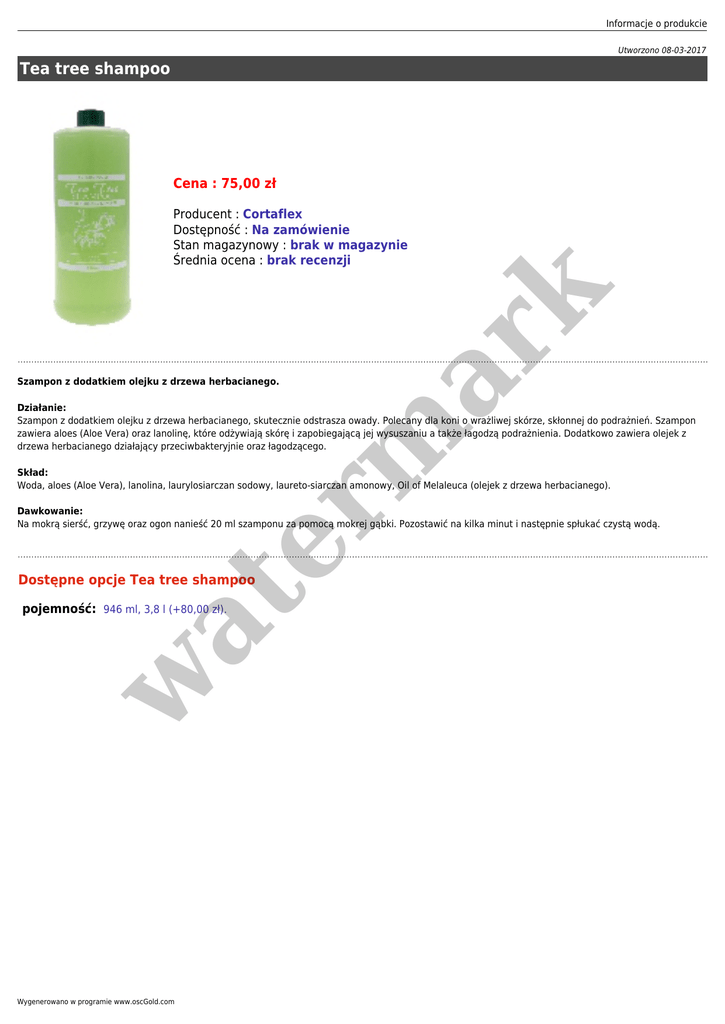 Informacje o produkcie Utworzono 08-03-2017 Tea tree shampoo Cena : 75,00 zł er m ar k Producent : Cortaflex Dostępność : Na zamówienie Stan magazynowy : brak w magazynie Średnia ocena : brak recenzji Szampon z dodatkiem olejku z drzewa herbacianego. Działanie: Szampon z dodatkiem olejku z drzewa herbacianego, skutecznie odstrasza owady. Polecany dla koni o wrażliwej skórze, skłonnej do podrażnień. Szampon zawiera aloes (Aloe Vera) oraz lanolinę, które odżywiają skórę i zapobiegającą jej wysuszaniu a także łagodzą podrażnienia. Dodatkowo zawiera olejek z drzewa herbacianego działający przeciwbakteryjnie oraz łagodzącego. Skład: Woda, aloes (Aloe Vera), lanolina, laurylosiarczan sodowy, laureto-siarczan amonowy, Oil of Melaleuca (olejek z drzewa herbacianego). Dawkowanie: Na mokrą sierść, grzywę oraz ogon nanieść 20 ml szamponu za pomocą mokrej gąbki. Pozostawić na kilka minut i następnie spłukać czystą wodą. at Dostępne opcje Tea tree shampoo w pojemność: 946 ml, 3,8 l (+80,00 zł). Wygenerowano w programie www.oscGold.com