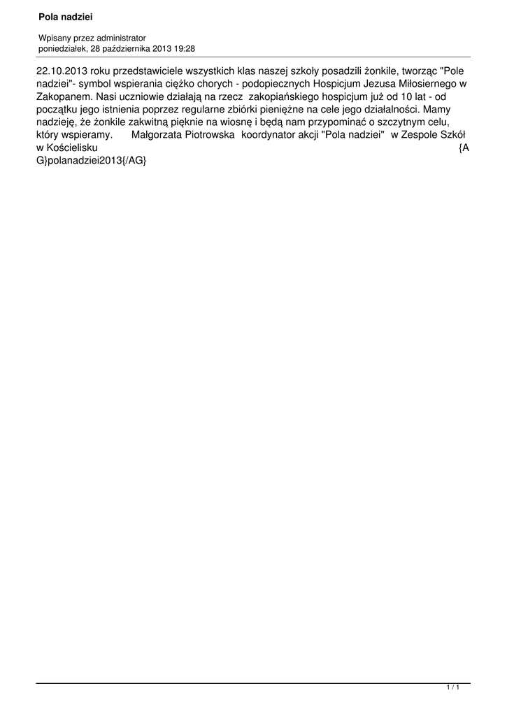 22.10.2013 roku przedstawiciele wszystkich klas naszej szkoły posadzili żonkile, tworząc "Pole