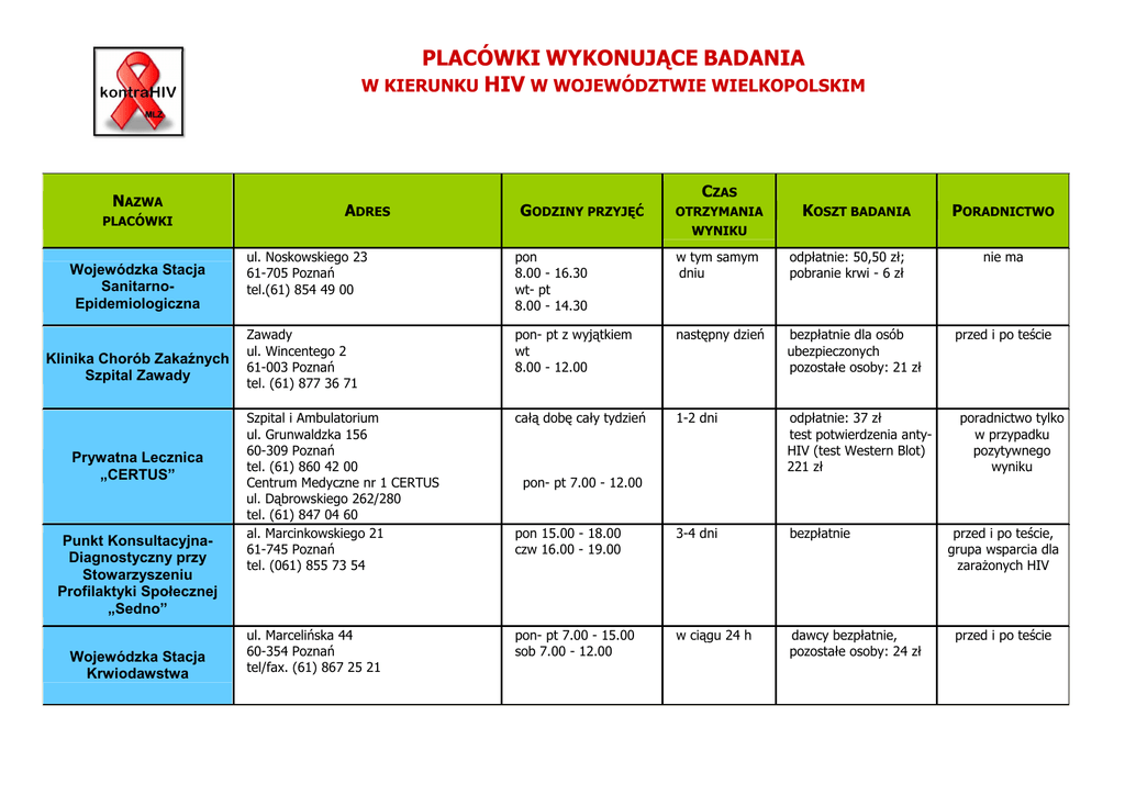 PLACÓWKI WYKONUJĄCE BADANIA W KIERUNKU HIV W WOJEWÓDZTWIE WIELKOPOLSKIM NAZWA PLACÓWKI Wojewódzka Stacja SanitarnoEpidemiologiczna Klinika Chorób Zakaźnych Szpital Zawady Prywatna Lecznica „CERTUS” Punkt KonsultacyjnaDiagnostyczny przy Stowarzyszeniu Profilaktyki Społecznej „Sedno” Wojewódzka Stacja Krwiodawstwa CZAS ADRES GODZINY PRZYJĘĆ OTRZYMANIA KOSZT BADANIA PORADNICTWO WYNIKU ul. Noskowskiego 23 61-705 Poznań tel.(61) 854 49 00 pon 8.00 - 16.30 wt- pt 8.00 - 14.30 w tym samym dniu odpłatnie: 50,50 zł; pobranie krwi - 6 zł Zawady ul. Wincentego 2 61-003 Poznań tel. (61) 877 36 71 pon- pt z wyjątkiem wt 8.00 - 12.00 następny dzień bezpłatnie dla osób ubezpieczonych pozostałe osoby: 21 zł Szpital i Ambulatorium ul. Grunwaldzka 156 60-309 Poznań tel. (61) 860 42 00 Centrum Medyczne nr 1 CERTUS ul. Dąbrowskiego 262/280 tel. (61) 847 04 60 al. Marcinkowskiego 21 61-745 Poznań tel. (061) 855 73 54 całą dobę cały tydzień 1-2 dni odpłatnie: 37 zł test potwierdzenia antyHIV (test Western Blot) 221 zł pon 15.00 - 18.00 czw 16.00 - 19.00 3-4 dni bezpłatnie ul. Marcelińska 44 60-354 Poznań tel/fax. (61) 867 25 21 pon- pt 7.00 - 15.00 sob 7.00 - 12.00 w ciągu 24 h dawcy bezpłatnie, pozostałe osoby: 24 zł nie ma przed i po teście poradnictwo tylko w przypadku pozytywnego wyniku pon- pt 7.00 - 12.00 przed i po teście, grupa wsparcia dla zaraŜonych HIV przed i po teście Szpital Wojewódzki w Poznaniu Poznański Ośrodek Specjalistycznych Usług Medycznych Klinika Ars Medical Szpital Zespolony im. L. Perzyny Zakład Diagnostyki Laboratoryjnej Powiatowa Stacja Sanitarno Epidemiologiczna w Koninie NZOZ Diagnostyka Medyczna „Meridian" NZOZ Leszczyńskie Centrum Medyczne „VENTRICULU” aktualizacja: listopad 2010 roku ul. Juraszów 7/19 60-479 Poznań tel. (61) 821 22 00 wew. 269 pon - pt 7.30 - 11.00 w tym samym dniu bezpłatne przy skierowaniu od lekarza, pozostałe osoby: 20 zł przed i po teście ul. Serbska 6 61-696 Poznań tel. (61) 647 77 77 pon – pt 7.30 - 18.00 sob 7.30 – 13.00 min 4 h odpłatnie: 32 zł Al. Wojska Polskiego 43 64-920 Piła tel. 067 211 99 19 pon- pt 8.00 - 20.00 sob 8.00 - 14.00 ok. 2 h odpłatnie: 25 zł, przeciwciała anty-HIV 30 zł ul. Poznańska 79 62-800 Kalisz tel. (62) 765 12 51 - centrala (62) 765 14 04 - kierownik pon- pt 7.15 - 14.15 sob 9.00 - 14.00 w tym samym dniu płatne 34,50 zł ul. Staszica 16 62-500 Konin tel. (63) 243 90 52 pon- pt 7.30 - 14.00 2- 3 dni płatne 48 zł 5 zł pobranie krwi ul. Wojska Polskiego 11/15 64-100 Leszno tel. (65) 529 97 08 pon- pt 7.30 - 11.00 następny dzień płatne 35 zł nie ma ul. Słowiańska 41 64-100 Leszno tel. (65) 529 25 63 pon – pt 7.00 - 9.30 w tym samym dniu po 15.00 płatne 35 zł nie ma poradnictwo tylko w przypadku pozytywnego wyniku przed i po teście nie ma przed i po teście