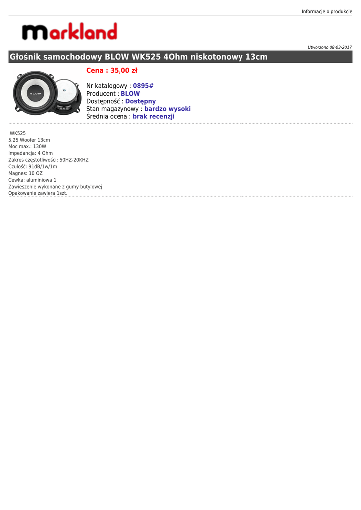 Informacje o produkcie Utworzono 08-03-2017 Głośnik samochodowy BLOW WK525 4Ohm niskotonowy 13cm Cena : 35,00 zł Nr katalogowy : 0895# Producent : BLOW Dostępność : Dostępny Stan magazynowy : bardzo wysoki Średnia ocena : brak recenzji WK525 5.25 Woofer 13cm Moc max.: 130W Impedancja: 4 Ohm Zakres częstotliwości: 50HZ-20KHZ Czułość: 91dB/1w/1m Magnes: 10 OZ Cewka: aluminiowa 1 Zawieszenie wykonane z gumy butylowej Opakowanie zawiera 1szt.