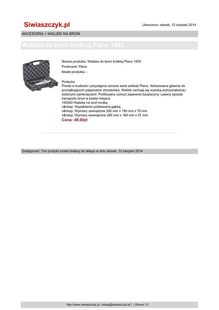 Siwiaszczyk.pl Utworzono: wtorek, 12 sierpień 2014 AKCESORIA > WALIZKI NA BROŃ Walizka do broni krótkiej Plano 1403 Nazwa produktu: Walizka do broni krótkiej Plano 1403 Producent: Plano Model produktu: Protector Prosta w budowie i przystępna cenowo seria walizek Plano. Adresowana głownie do początkujących pasjonatow strzelectwa. Walizki cechują się wysoką wytrzymałością i solidnymi zamknięciami. Profilowany uchwyt zapewnia bezpieczny i pewny sposob transportu broni w każde miejsce. 140300 Walizka na broń krotką v Wypełnienie pofalowaną gąbką v Wymiary zewnętrzne 292 mm x 190 mm x 70 mm v Wymiary wewnętrzne 266 mm x 160 mm x 57 mm Cena: 49.00zł Dostępność: Ten produkt został dodany do sklepu w dniu wtorek, 12 sierpień 2014 http://www.siwiaszczyk.pl | [email protected] | | Strona 1/1