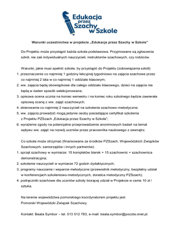 Warunki uczestnictwa w projekcie „Edukacja przez Szachy w Szkole” Do Projektu może przystąpić każda szkoła podstawowa. Przyjmowane są zgłoszenia szkół, nie zaś indywidualnych nauczycieli, instruktorów szachowych, czy rodziców. Warunki, jakie musi spełnić szkoła, by przystąpić do Projektu (zobowiązania szkół): 1. przeznaczenie co najmniej 1 godziny lekcyjnej tygodniowo na zajęcia szachowe przez co najmniej 2 lata w co najmniej 1 oddziale klasowym; 2. ww. zajęcia będą obowiązkowe dla całego oddziału klasowego, dzieci na zajęcia nie będą w żaden sposób selekcjonowane; 3. opisowa ocena ucznia na koniec semestru i na koniec roku szkolnego będzie zawierała opisową ocenę z ww. zajęć szachowych; 4. skierowanie co najmniej 2 nauczycieli na szkolenie szachowo-metodyczne; 5. ww. zajęcia prowadzić mogą jedynie osoby posiadające certyfikat szkolenia z Projektu PZSzach „Edukacja przez Szachy w Szkole”; 6. wyrażenie zgody na potencjalne przeprowadzenie anonimowych badań na temat wpływu ww. zajęć na rozwój uczniów przez pracownika naukowego z zewnątrz. Co szkoła może otrzymać (finansowane ze środków PZSzach, Wojewódzkich Związków Szachowych, samorządów i innych partnerów): 1. sprzęt szachowy w wymiarze: 15 kompletów bierek + 15 szachownic + szachownica demonstracyjna; 2. szkolenie nauczycieli w wymiarze 72 godzin dydaktycznych; 3. programy nauczania i wsparcie metodyczne (przewodnik metodyczny, bezpłatny udział w konferencjach szkoleniowo-metodycznych, doradca metodyczny PZSzach); 4. podręczniki szachowe dla uczniów szkoły biorącej udział w Projekcie w cenie 10 zł / sztuka. Na terenie województwa pomorskiego koordynatorem projektu jest Pomorski Wojewódzki Związek Szachowy. Kontakt: Beata Symbor – tel. 513 512 783, e-mail: [email protected].